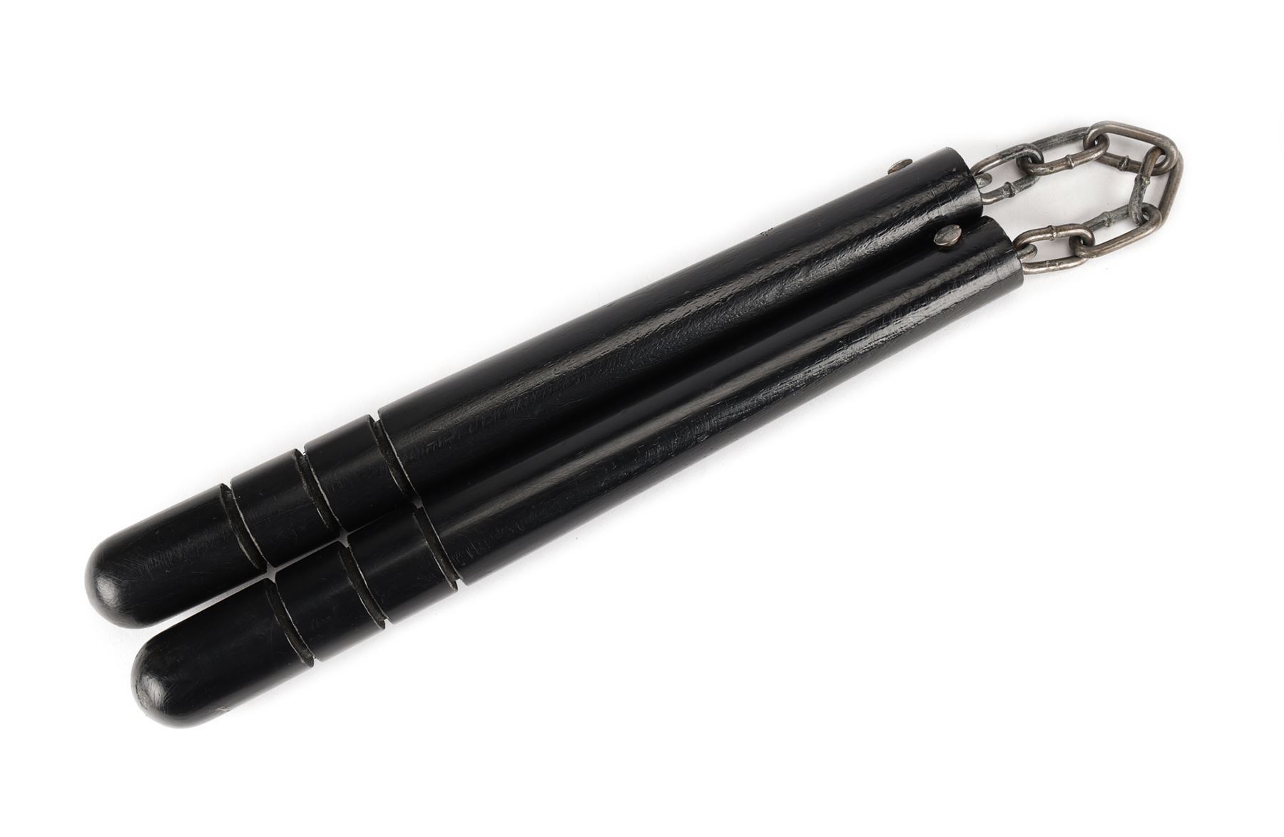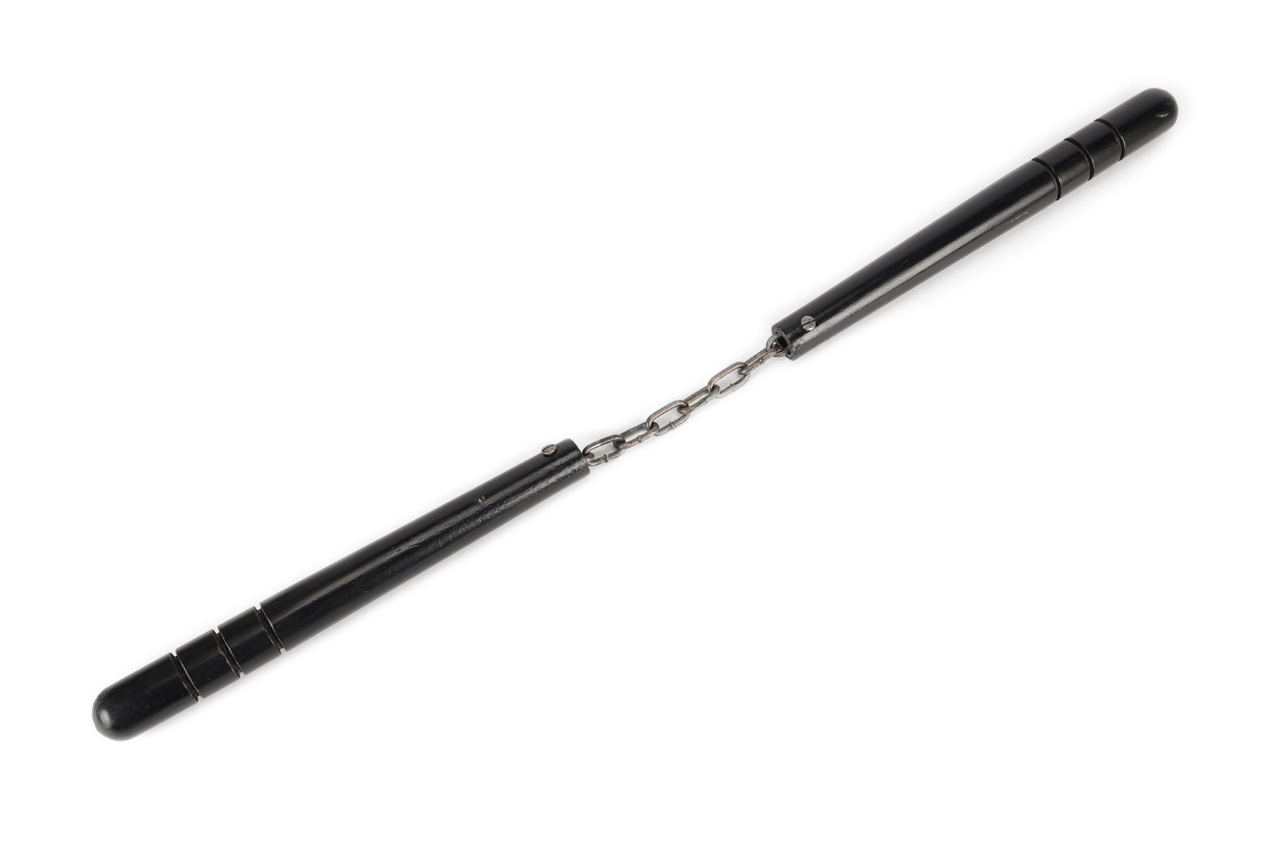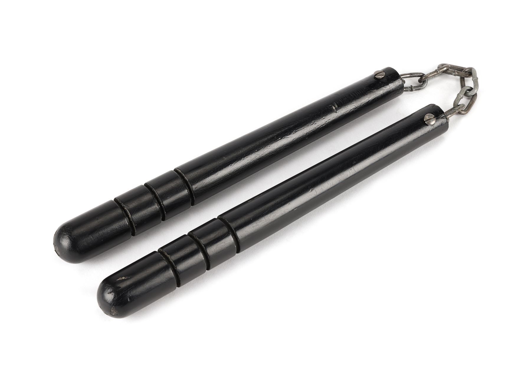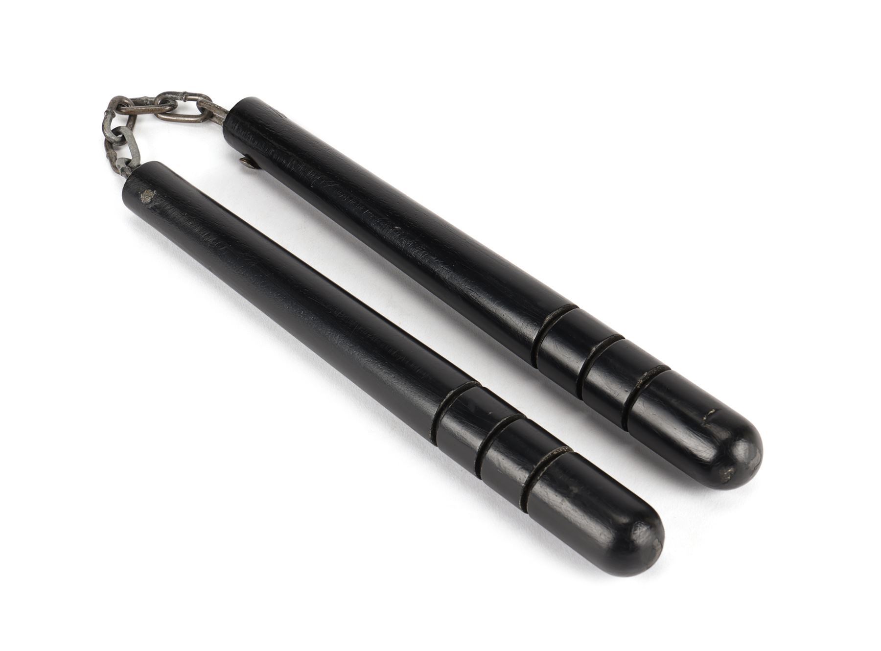 This pair of 12"-long black lacquered wooden nunchucks features an eight-link metal chain and three grip grooves. Also included are seven printed black-and-white images of Lee using his nunchucks as Kato and in various photo sessions, as well as a Certificate of Authenticity from George Lee, Lee's equipment maker and personal friend, to whom these nunchucks were gifted. The COA states that Bruce Lee used them in "The Hunters and the Hunted" in 1966. These nunchucks exhibit scratches, minor chips and surface wear from production use. Dimensions: 12" x 2.5" x 1.5" (30.5 cm x 6.5 cm x 3.5 cm)