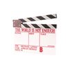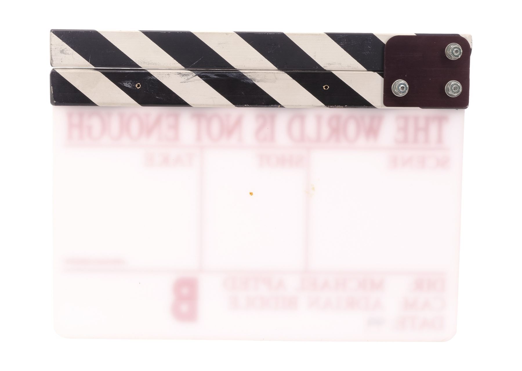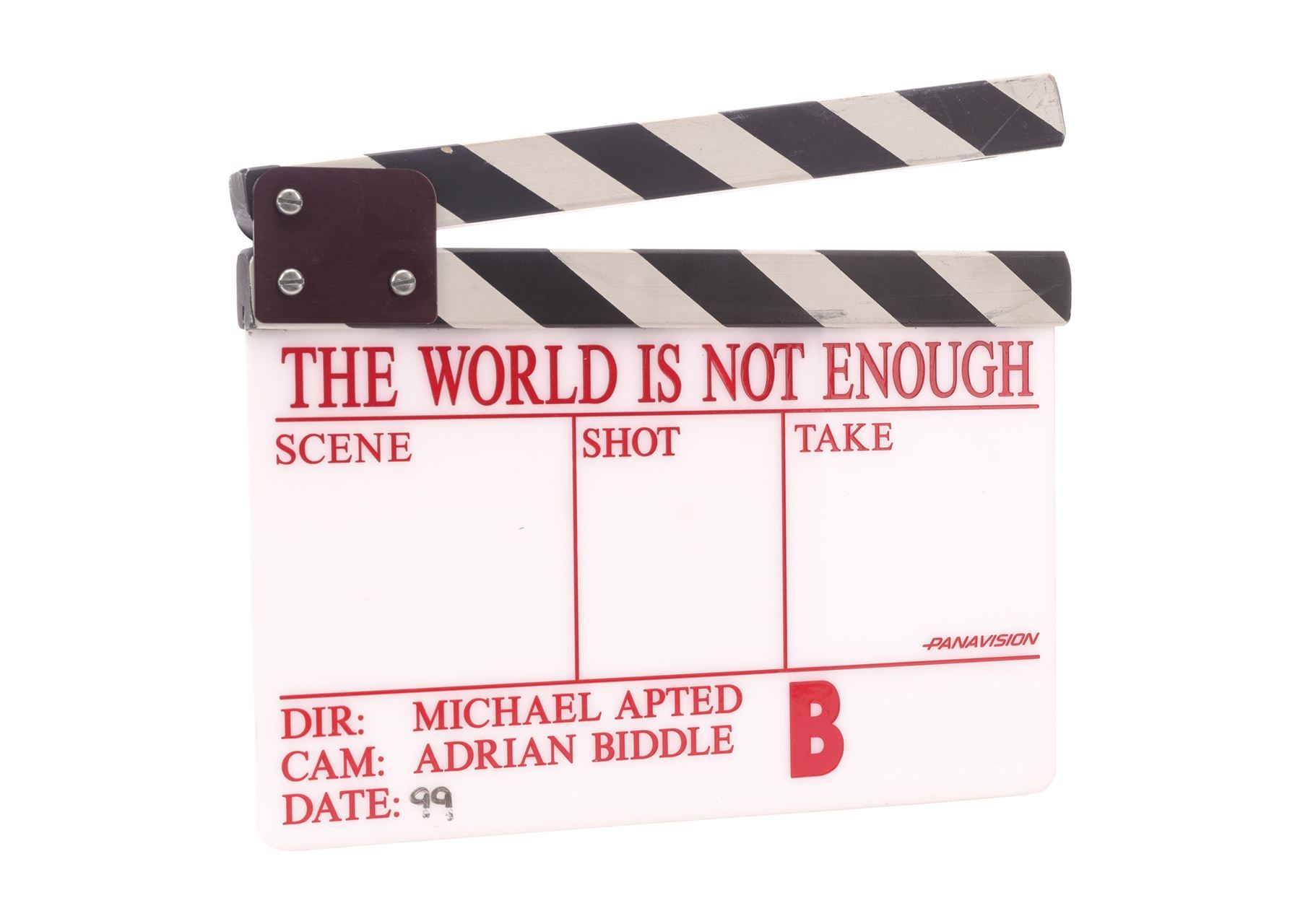 THE WORLD IS NOT ENOUGH (1999) - "B" Clapperboard - A "B" clapperboard from the production of Michael Apted's Bond film The World is Not Enough. This clapperboard features an acrylic white slate with a magnetized black-and-white striped wooden clapper. It is engraved in red with the film's title, the names of director Michael Apted and cameraperson Adrian Biddle, and fields titled "Scene," "Shot," "Take," and "Date." The date features a hand-marked "99" in black marker. This clapperboard exhibits scratches in the acrylic, black scuffing, and chipped paint. Dimensions: 11" x 1" x 9.5" (28 cm x 2.75 cm x 24.25 cm)