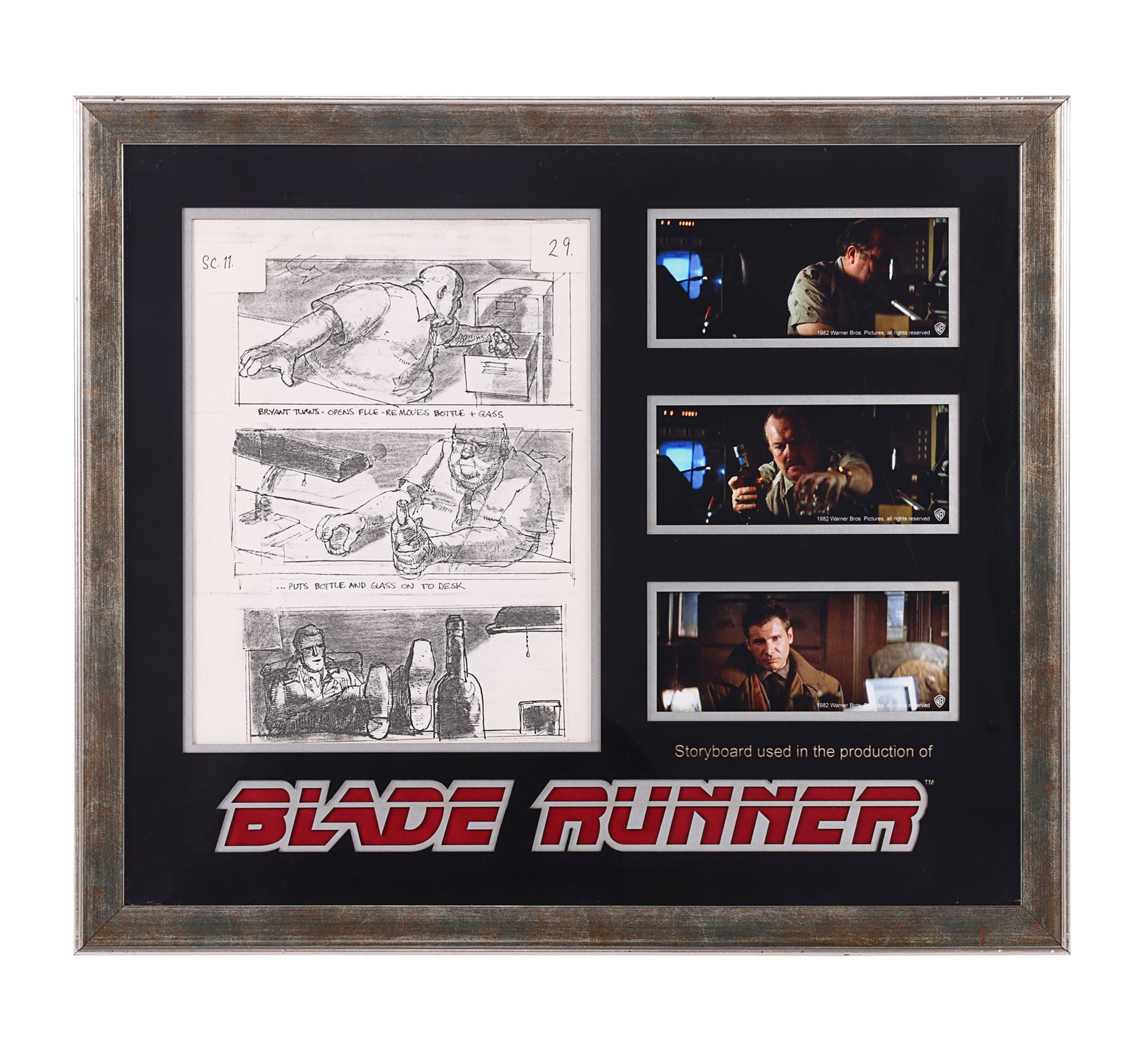 A framed storyboard sheet from the production of Ridley Scott's sci-fi classic Blade Runner. This lot comes from the family of Blade Runner archivist Geoff Hutchins.