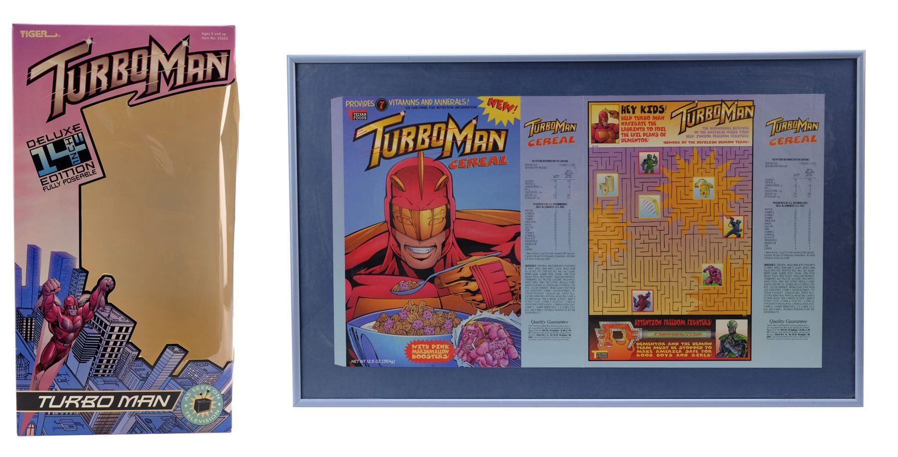 Created by Earl Hays Press for the production, this lot consists of a color-printed, flattened cardboard "TurboMan Cereal" box and a matching hollow cardboard and plastic TurboMan action figure box. The cereal box comes encased in a blue plastic frame which exhibits paint chips and scuffs, while the figure box exhibits fold lines from production. Dimensions: (largest) 15" x 24.25" x 0.5" (38 cm x 61.75 cm x 1.25 cm)