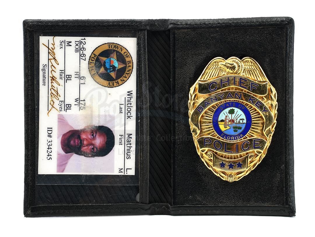 This lot will be auctioned on Thursday, July 1st. The auction will begin at 9:00am PDT and lots are sold sequentially via live auctioneer; tune in to the live streaming broadcast on auction day to follow the pace. Note other lots in the auction may close on June 29th or June 30th. Mathius Whitlock's (Denzel Washington) police badge and photo ID wallet from Carl Franklin's thriller Out of Time. Banyan Key Police chief Whitlock carried his badge when he investigated and later became the suspect in a murder case. This gold-color metal badge is engraved "CHIEF BANYAN KEY POLICE." It comes secured in a leather wallet alongside a plastic ID of Whitlock, complete with photo. The lot shows minimal signs of wear from age and use including markings on the wallet exterior, but remains in excellent overall condition. Dimensions: 4.75" x 3.25" x 0.5" (12 cm x 8.25 cm x 1.25 cm) Estimate: $1,000 - 1,500