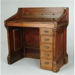 Lot # 955: INTERESTING ANTIQUE WALNUT DESK. Single bank having five drawers with decorative embossed metal pulls. Large kneehole area. Plank top with gallery having four letter slots. Sides have decorative molded edge panels. Also back with similar panels. Shaped base with molded edge. A very sturdy, well constructed and serviceable desk. This was found in the New Sweden, Maine area. SIZE: 38-1/2” h x 38” w x 20-1/2” d. CONDITION: Some stains to desk surface, otherwise very good. 9-97459