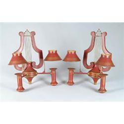 Lot # 956: PAIR OF DECORATED FRENCH TOLE DOUBLE CANDLE WALL SCONCES. 20th C. Back plate in lyre form, removable cone shaped shades on cylinder type candle holders. Painted with red ground and gold leaf decoration. Written “Made in France” on back. SIZE: 16” h x 16” w. CONDITION: Very good. 9-97100