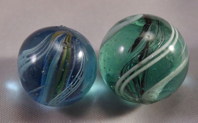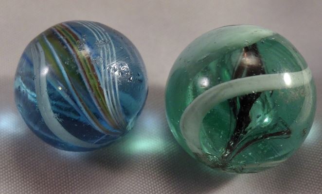 Lot of two marbles. Both are Divided Core Swirls. 21/32", Near Mint (8.6). 23/32", Near Mint (8.6).