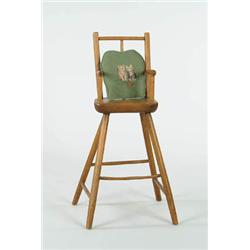 Lot # 970: CHILD’S WINDSOR STYLE HIGH CHAIR. Simple primitive design with box stretcher and splayed legs. Plank seat with turned arms. Needlework cushion with two cats. SIZE: 33-1/2” h x 22” seat h. CONDITION: Very good. 9-97081