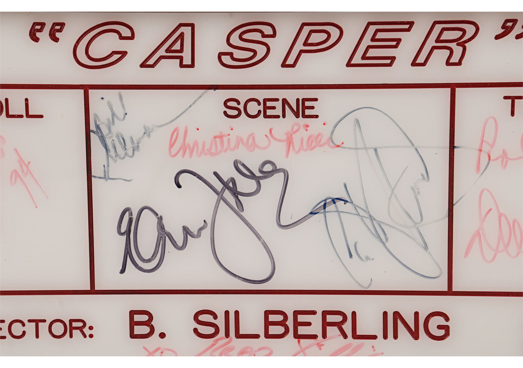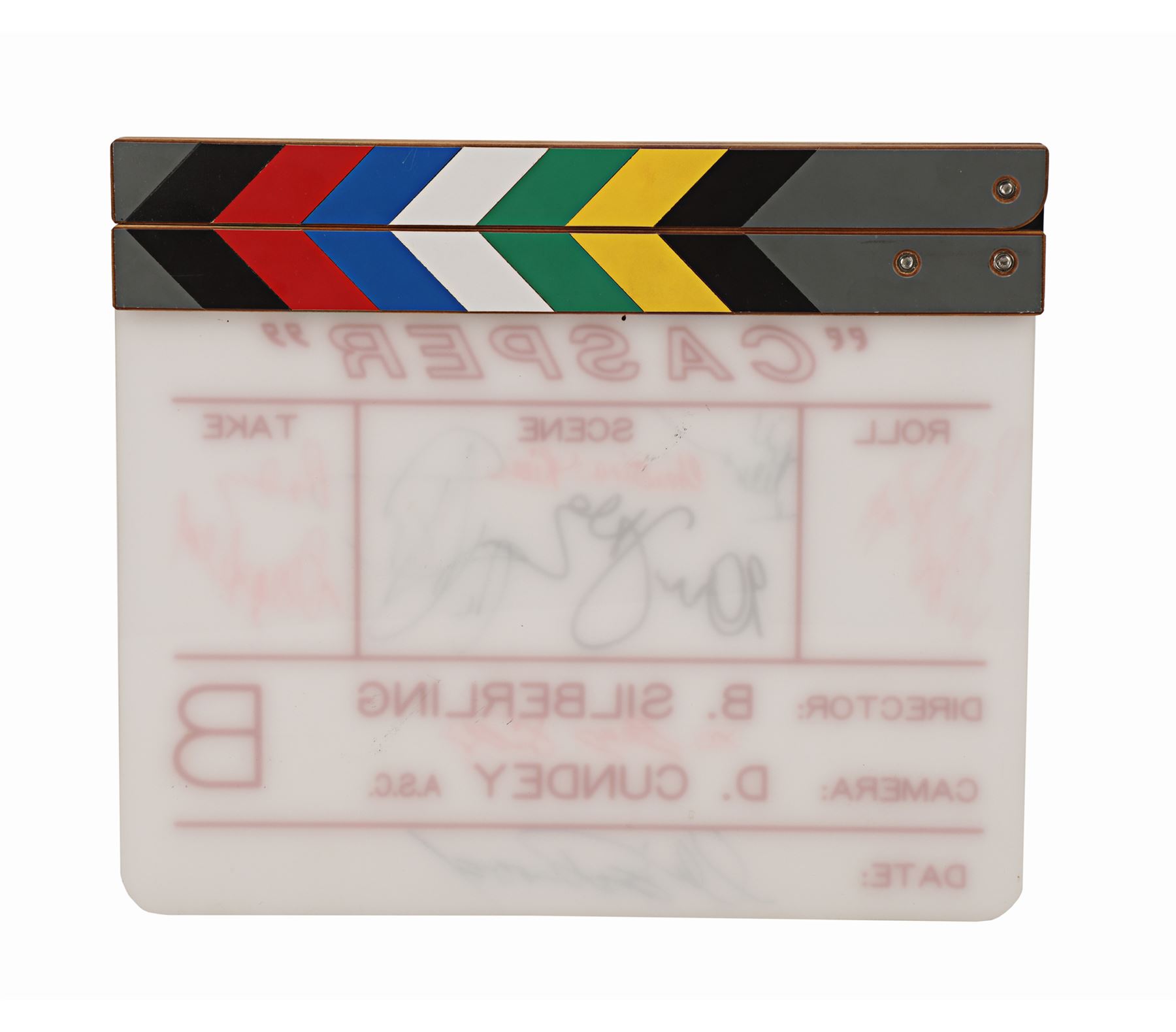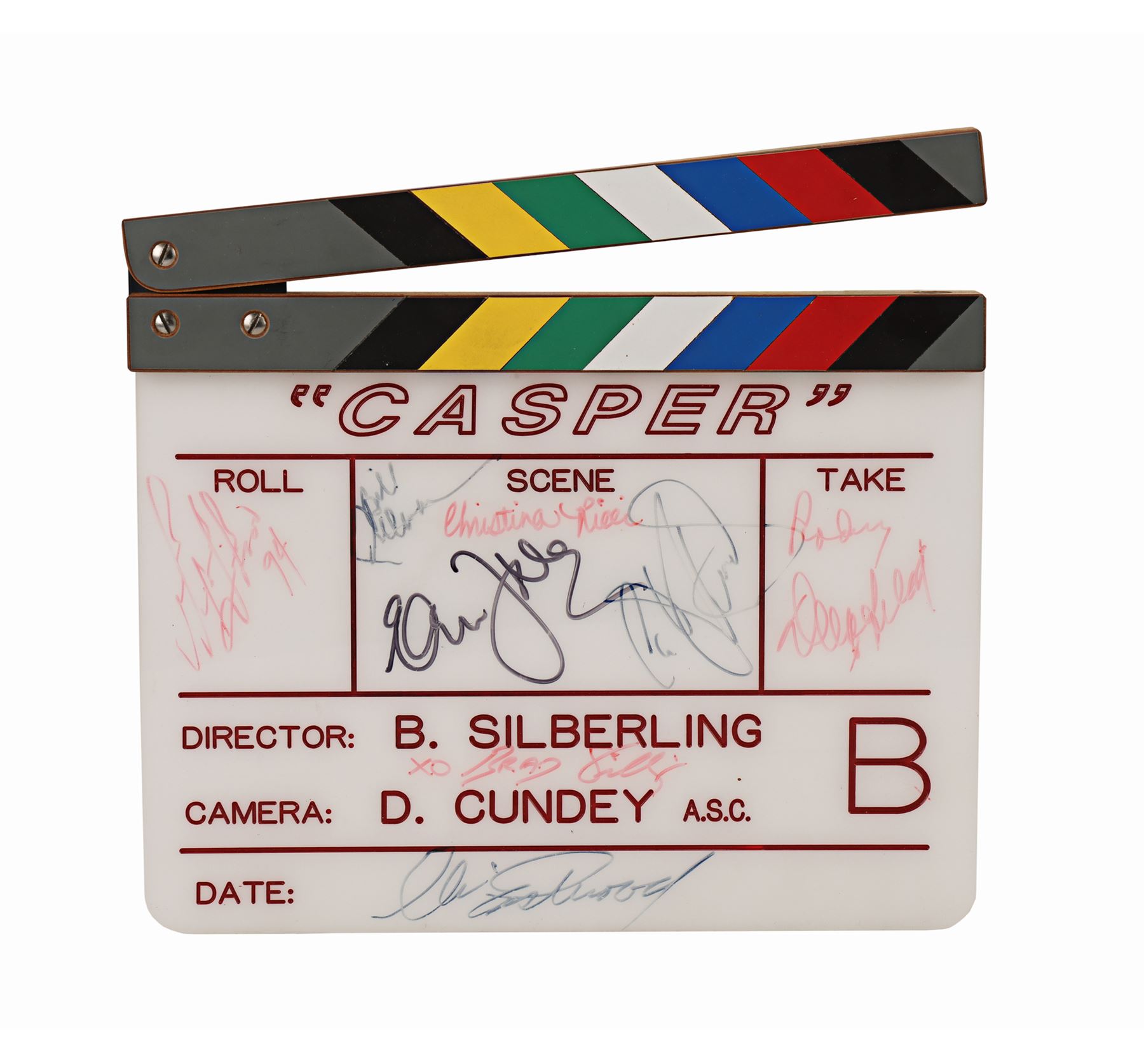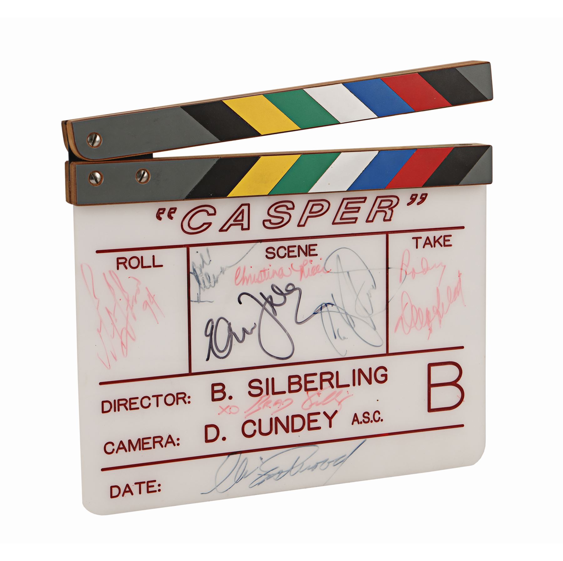 A clapperboard autographed by members of the cast from Brad Silberling's family comedy Casper. The autographs are handwritten on the clapperboard's acrylic slate and vary in colour, ranging between red, black, and blue. The included autographs are the director's as well as cast members Clint Eastwood, Bill Pullman, Christina Ricci, Dan Aykroyd, Eric Idle, and Rodney Dangerfield.
