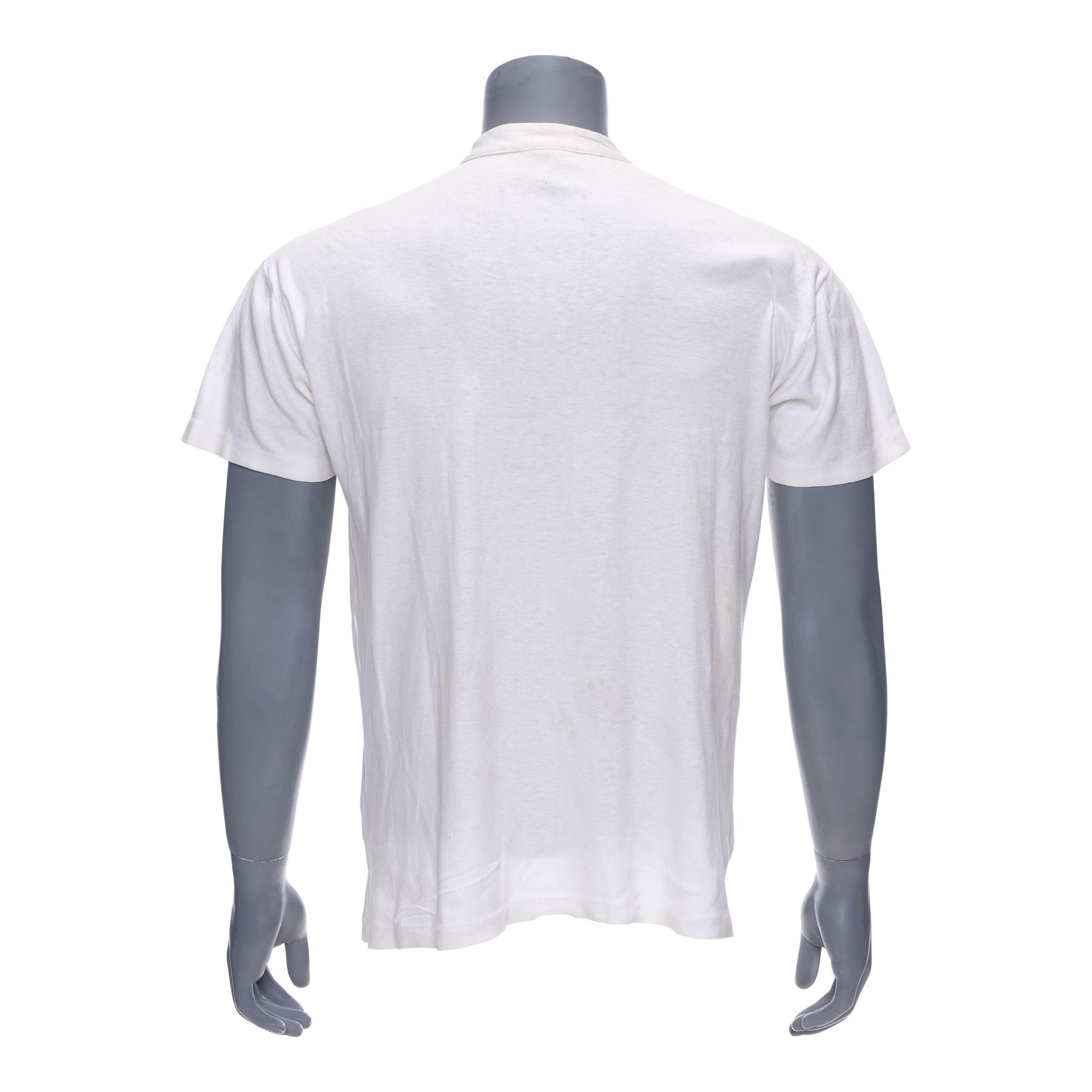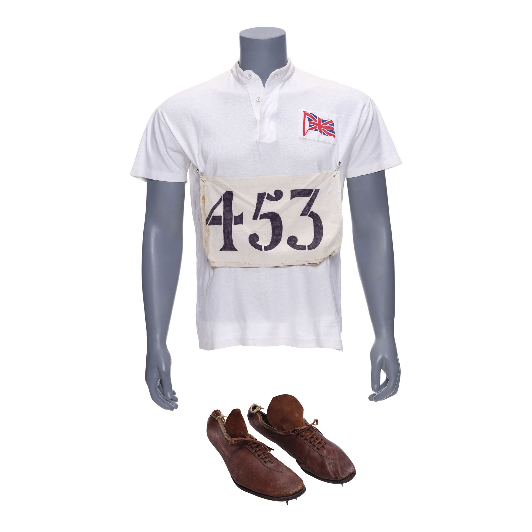 A running costume with shoes from Hugh Hudson's Chariots of Fire. Competitors wore white shirts with their numbers and special spiked running shoes as they ran the hurdles for the Games of the VIII Olympiad in Paris.