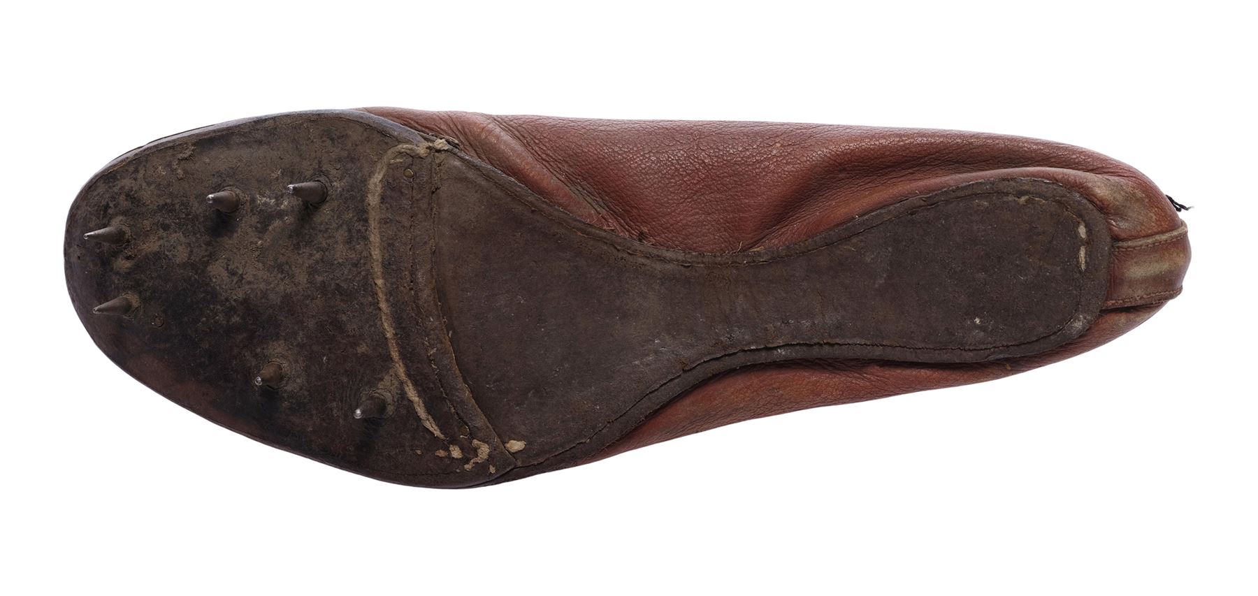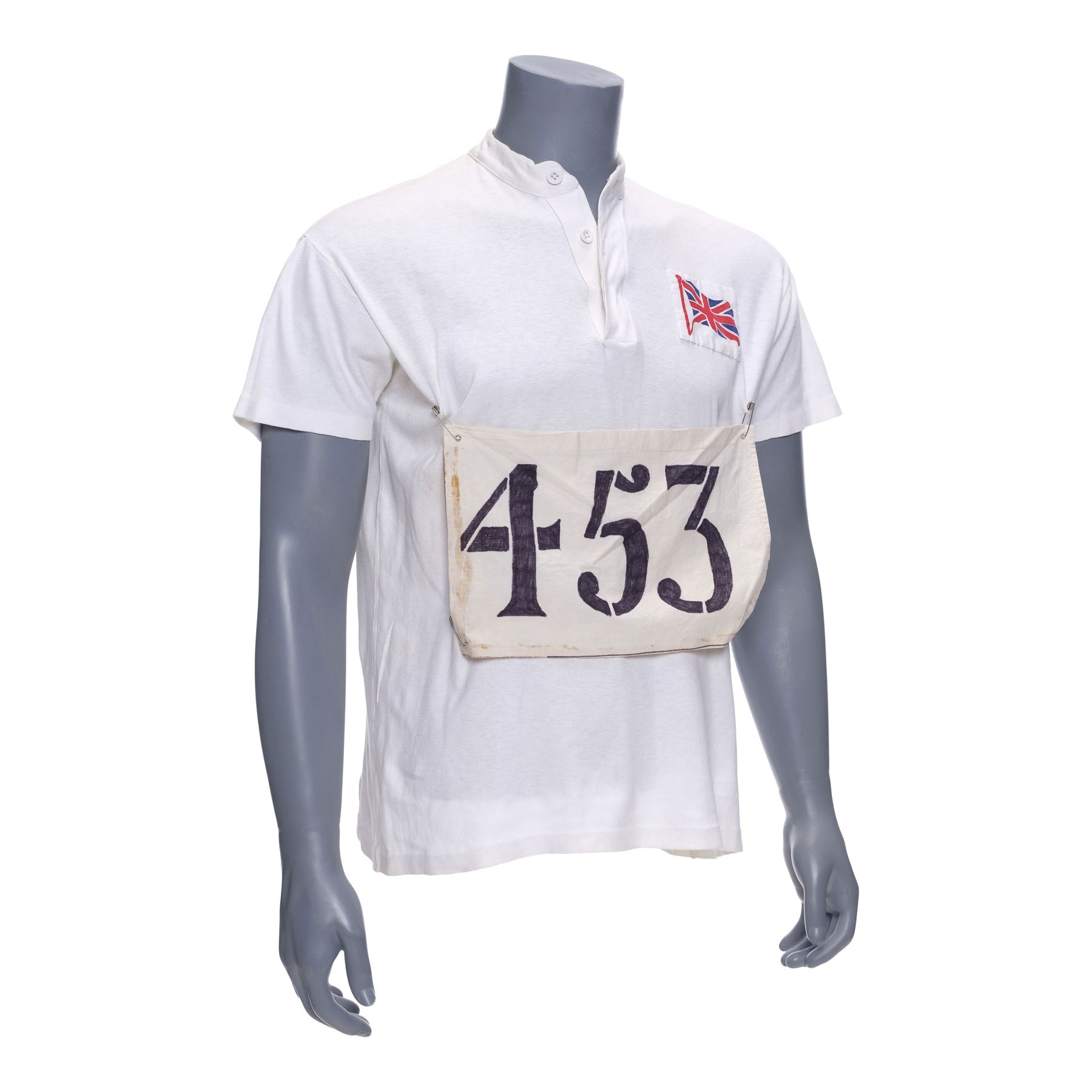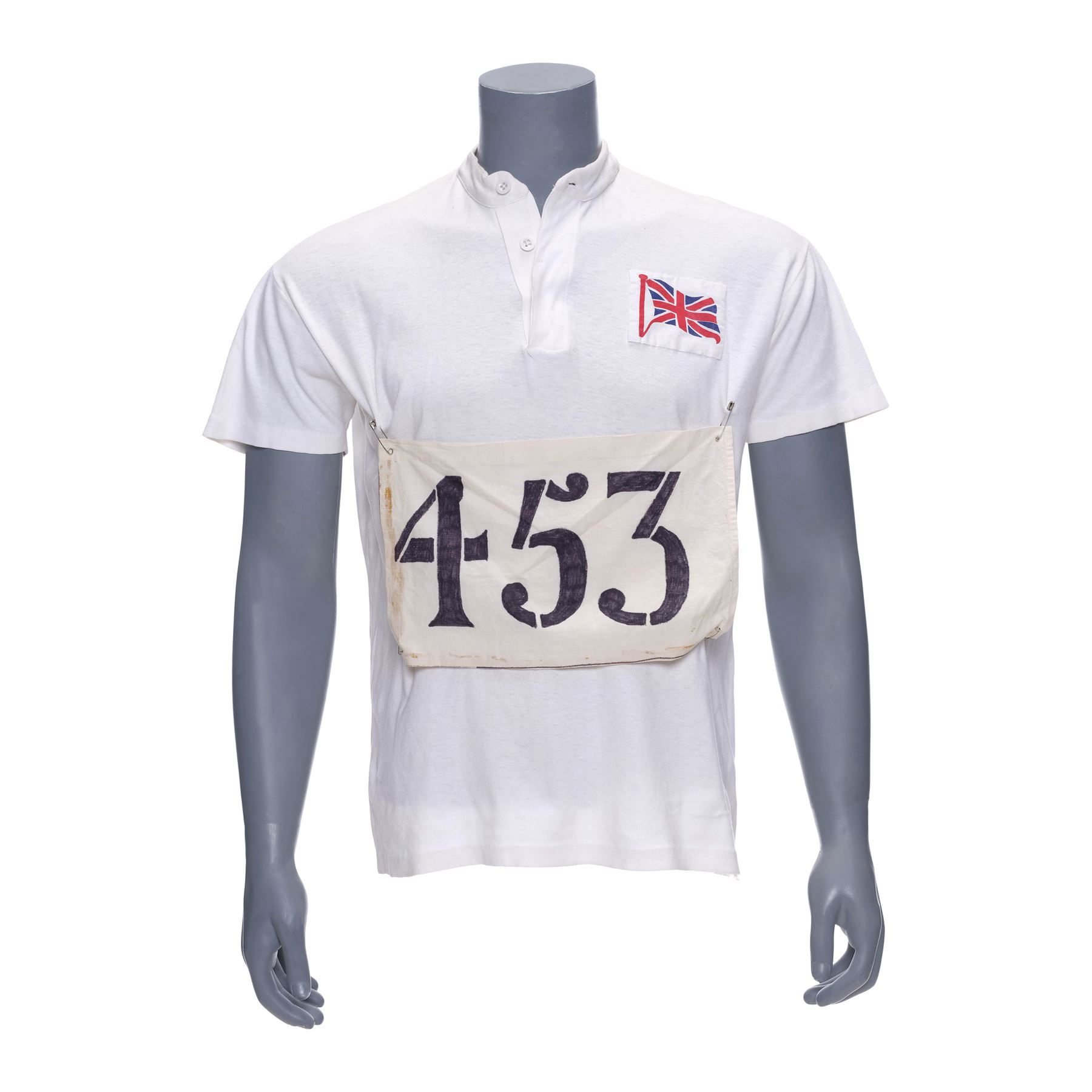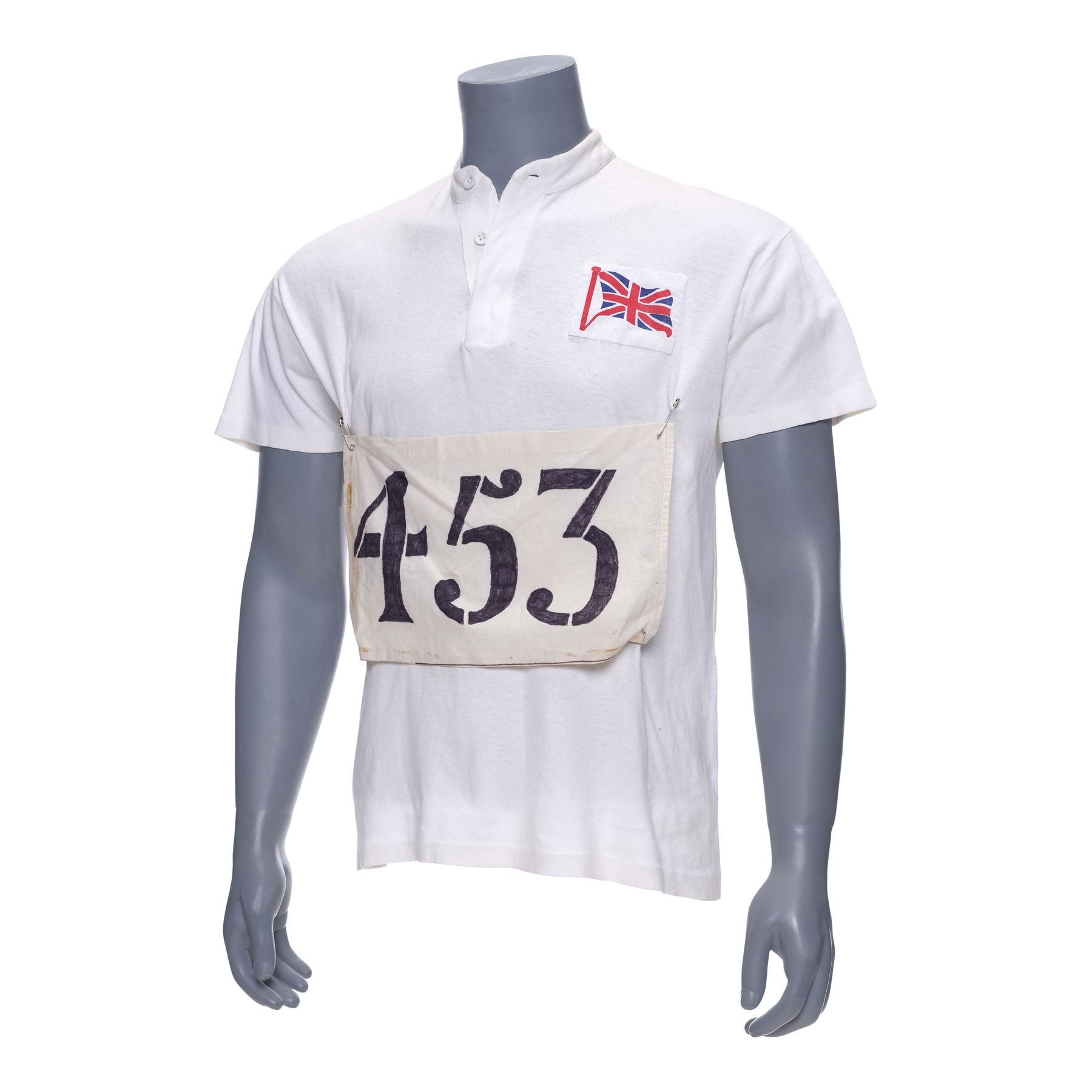This lot consists of a white cotton Bukta polo shirt (size XL) with a British flag silk-screened on the left breast pocket and a "453" painted in black on a white cotton cloth pinned to the front of the shirt; and a pair of brown leather shoes with metal spikes on the undersides. This lot exhibits staining and discolouration to the shirt and cloth and tearing to the shoes.