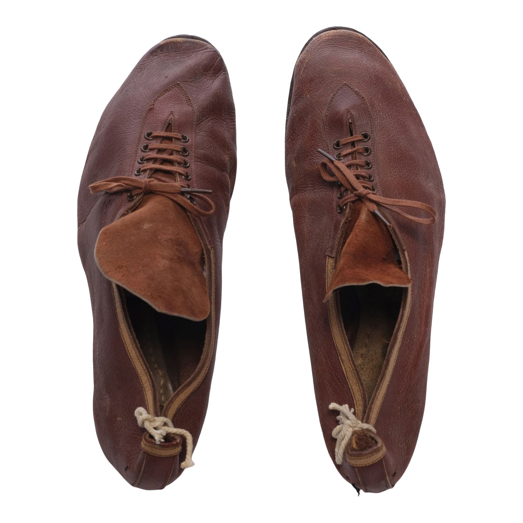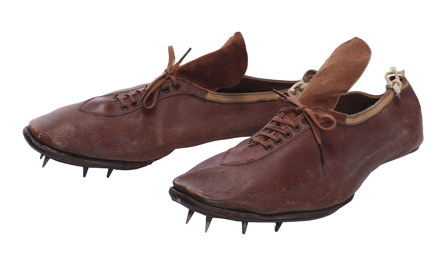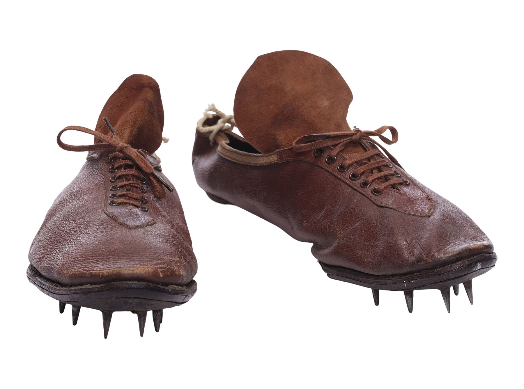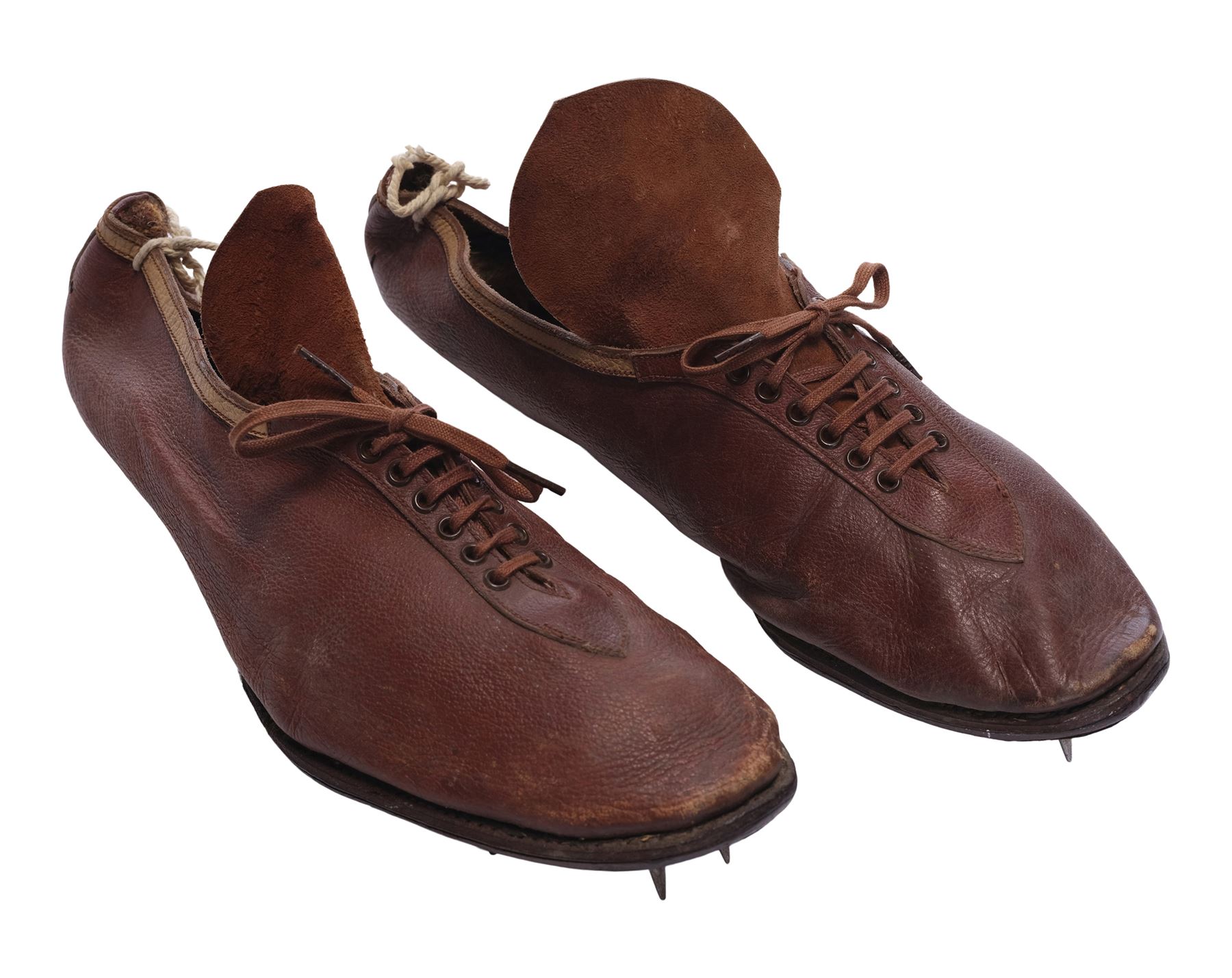 This lot consists of a white cotton Bukta polo shirt (size XL) with a British flag silk-screened on the left breast pocket and a "453" painted in black on a white cotton cloth pinned to the front of the shirt; and a pair of brown leather shoes with metal spikes on the undersides. This lot exhibits staining and discolouration to the shirt and cloth and tearing to the shoes.