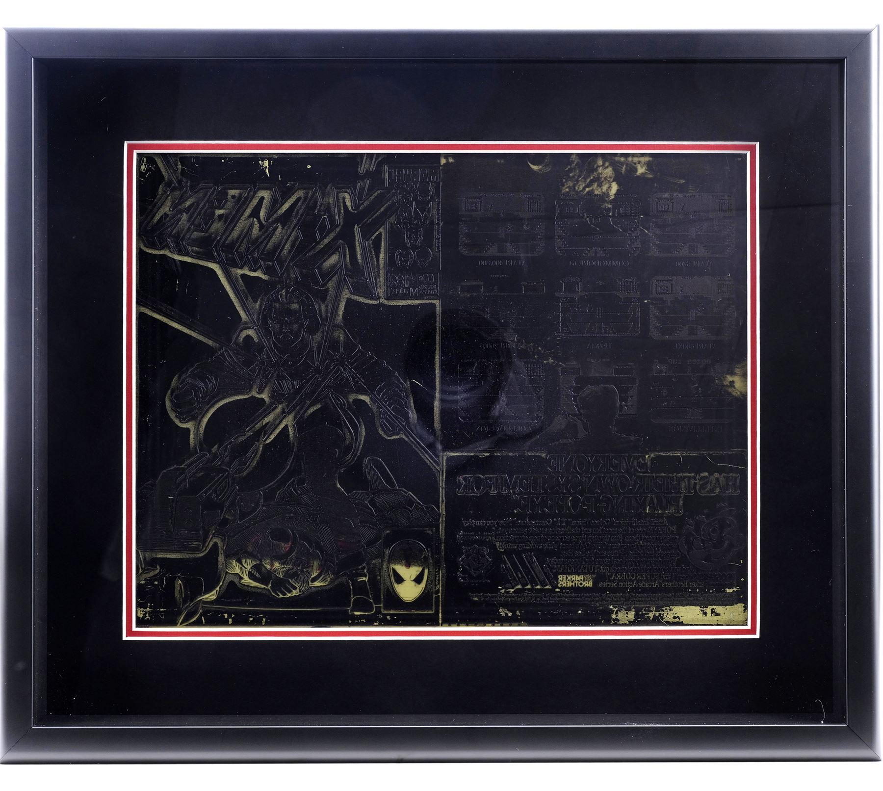 Created specifically for the direct sales version of the comic, this metal black plate featuring Rogue was originally curved from being stretched around a printing drum, but has since been matted behind plexiglass in a black wooden frame in order to flatten it. The comic book exhibits minor edge wear. Dimensions: (largest): 18.5" x 15.5" x 2.25" (47 cm x 39.5 cm x 5.75 cm)