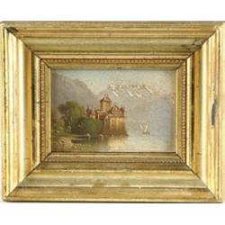 Lot # 977: UNSIGNED (European, Early 20th C) “THE CASTLE OF CHILLON”. Small oil on wood panel scene shows a castle next to large lake with high snow peaked mountains in background. Small sailboat is seen. Housed in its original lemon gold molded wood frame. Piece of paper on back gives history tells of castle in connection with Byron’s poem “The Prisoner of Chillon”. SIGHT SIZE: 2-3/4” x 4”. CONDITION: Surface dirt, otherwise very good. 9-97655