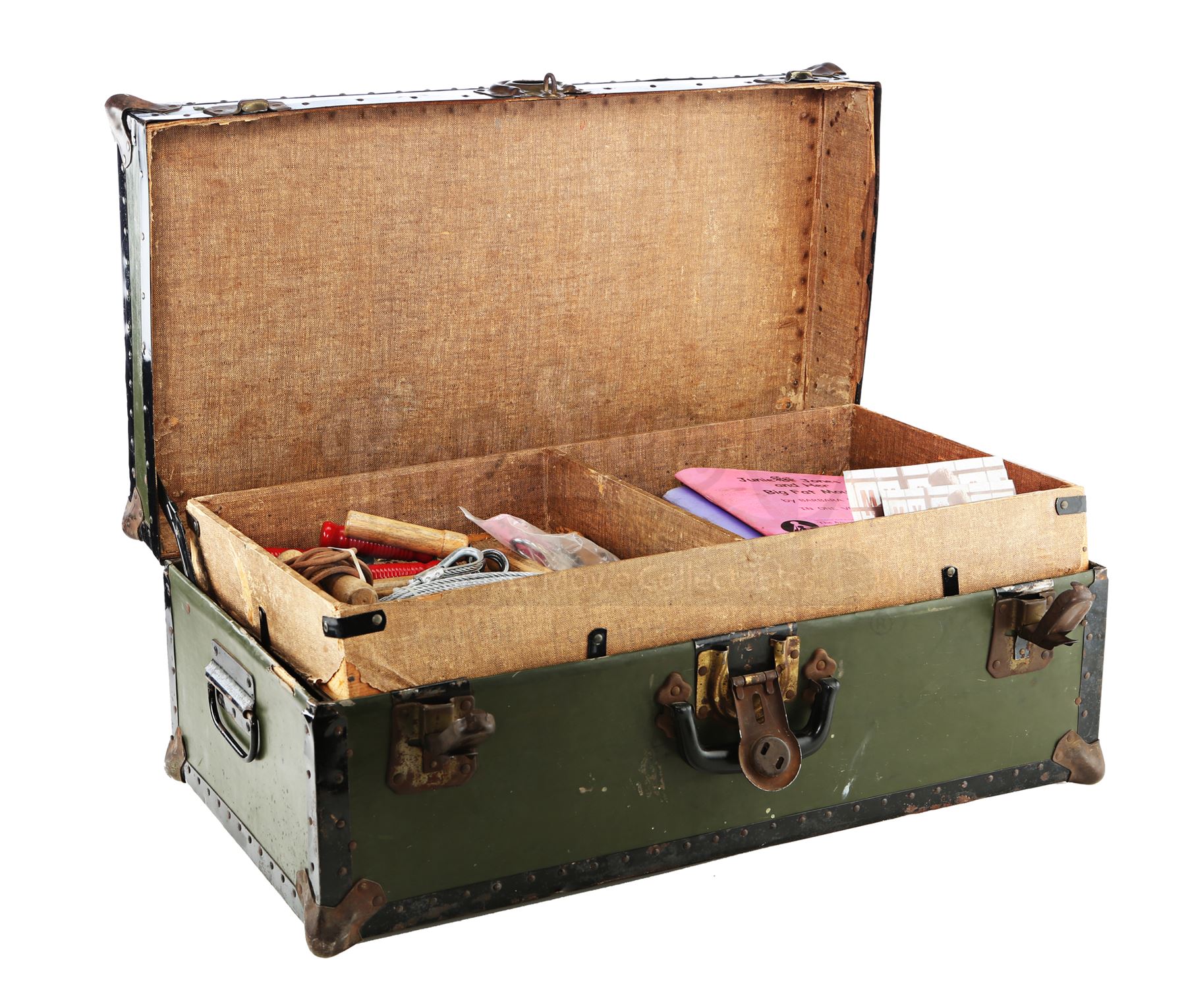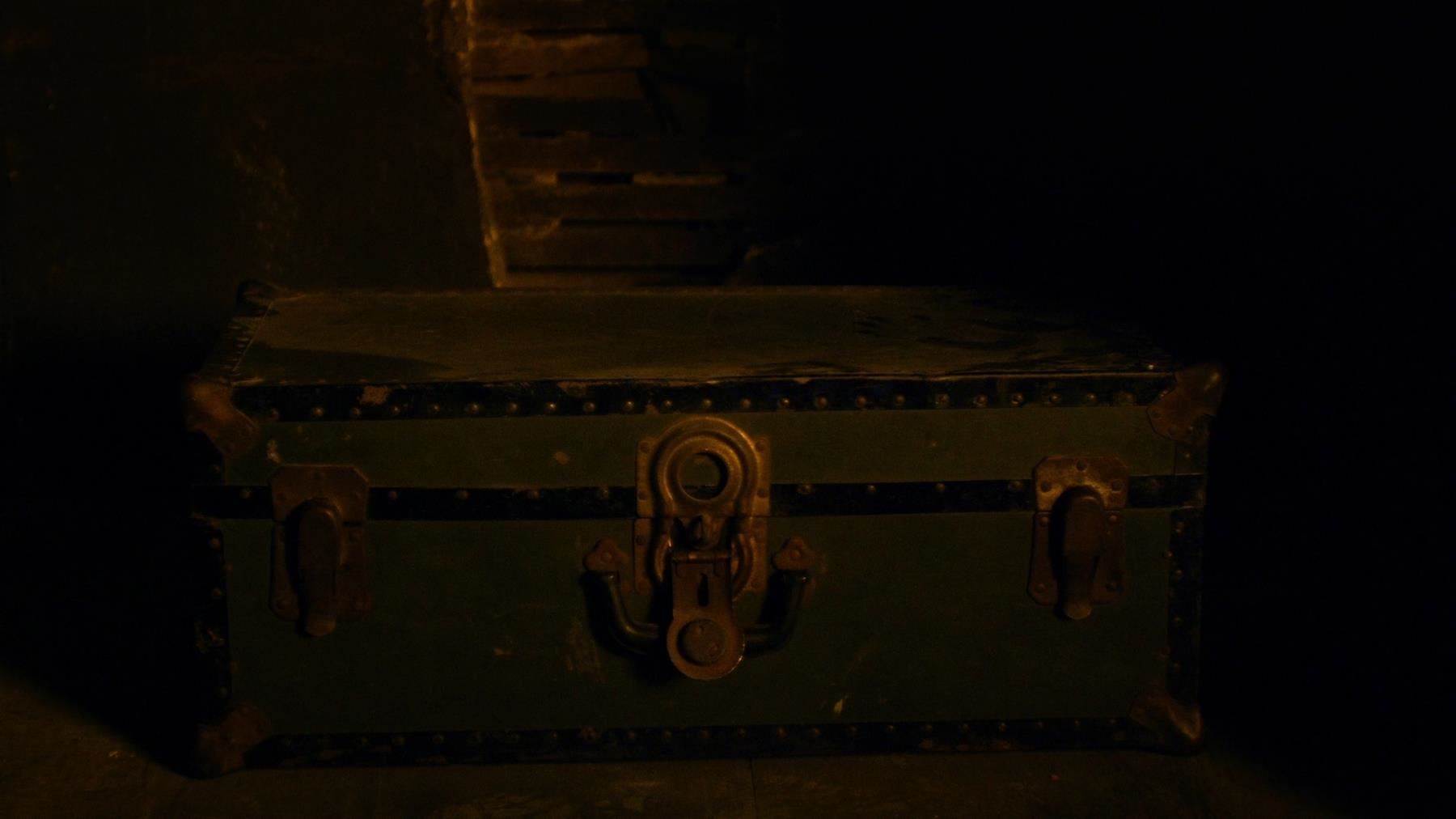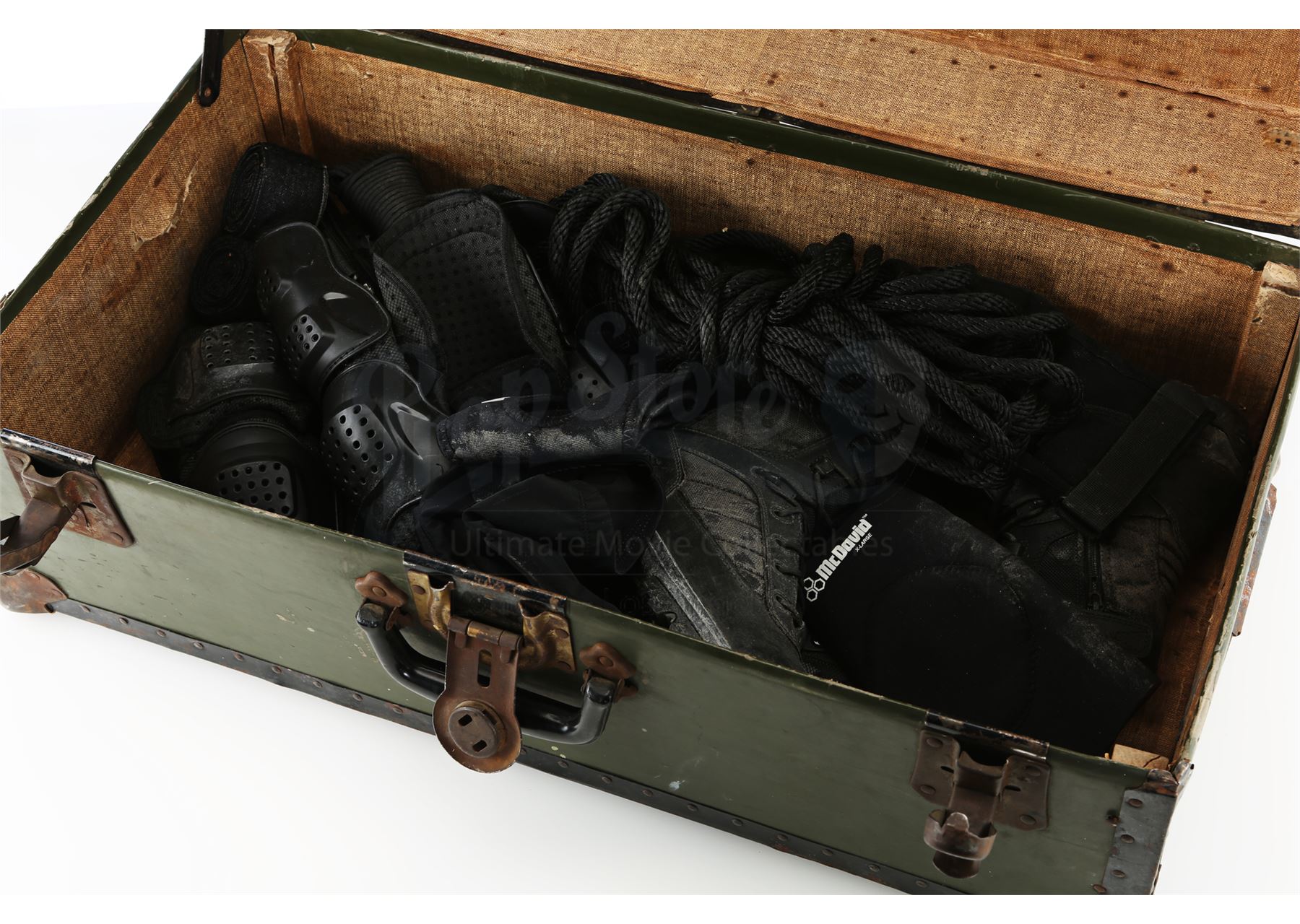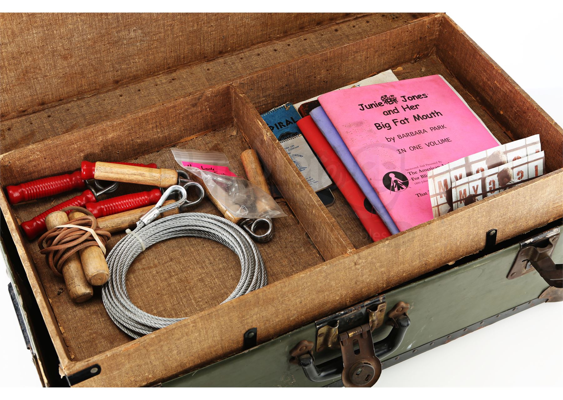 Matt Murdock’s trunk from Season 1 of Marvel's Daredevil and Season 1 of Marvel’s The Defenders. Murdock keeps his original vigilante costume locked inside a trunk in his closet throughout the first season of Daredevil, then decides to suit up again in the first season of The Defenders. This lot consists of an olive metal and wooden trunk containing a lock and key, four books written in Braille, a Braille alphabet card, five notebooks, photographs of young Murdock and his father, a black nylon rope, a steel cable, a jump rope, black body pads, a chest protector, wrist wraps, a glove, four grip strengtheners, and a pair of black leather and rubber boots. This lot is in fair overall condition with significant wear on the trunk and some of the contents from production.