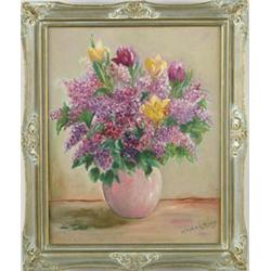 Lot # 980: E. B. BARTLETT (American, 20th C) STILL LIFE OF LILACS AND TULIPS.