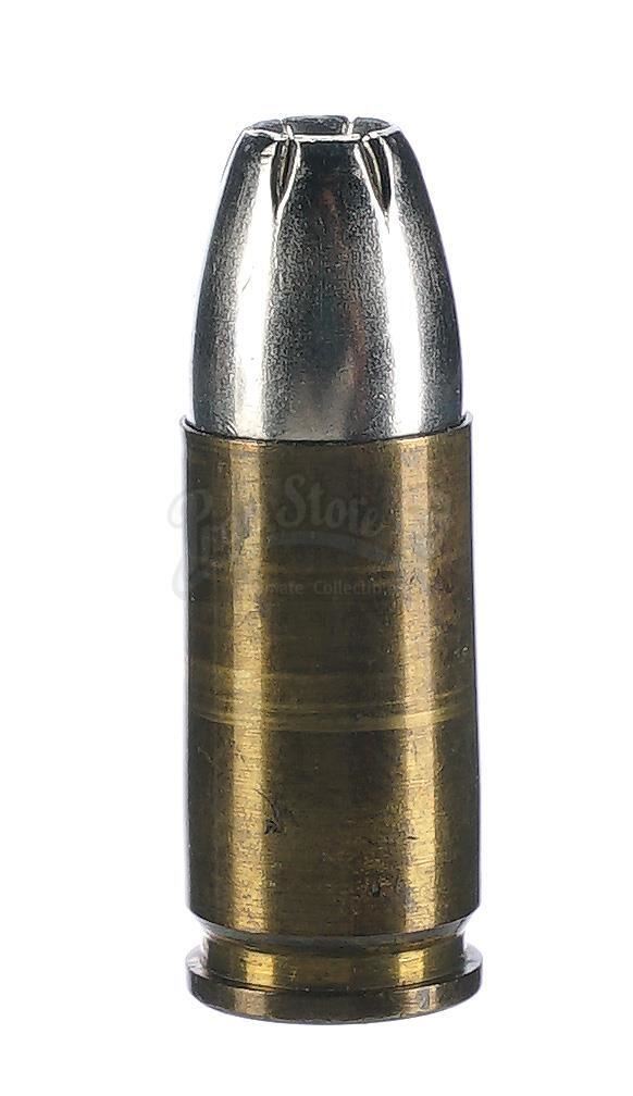 This lot will be auctioned on Thursday, July 1st. The auction will begin at 9:00am PDT and lots are sold sequentially via live auctioneer; tune in to the live streaming broadcast on auction day to follow the pace. Note other lots in the auction may close on June 29th or June 30th.  John Lee's (Chow Yun-Fat) engraved bullet from  Antoine Fuqua's 1998 action drama The Replacement Killers. Expert assassin Lee carried out Mr. Wei's (Kenneth Tsang) contracts with engraved bullets. This custom-made hollow-point round comes inside a brass shell casing featuring an engraving of a Chinese character for the word "death." The character is etched over a small circle of precise vertical lines. The base of the piece also features designation engravings which read "WIN 9mm Luger." This piece shows some slight wear due to production and age but remains overall in good condition. Dimensions: 1.25" x 0.5" x 0.5" (3 cm x 1.5 cm x 1.5 cm)  Estimate: $600 - 800