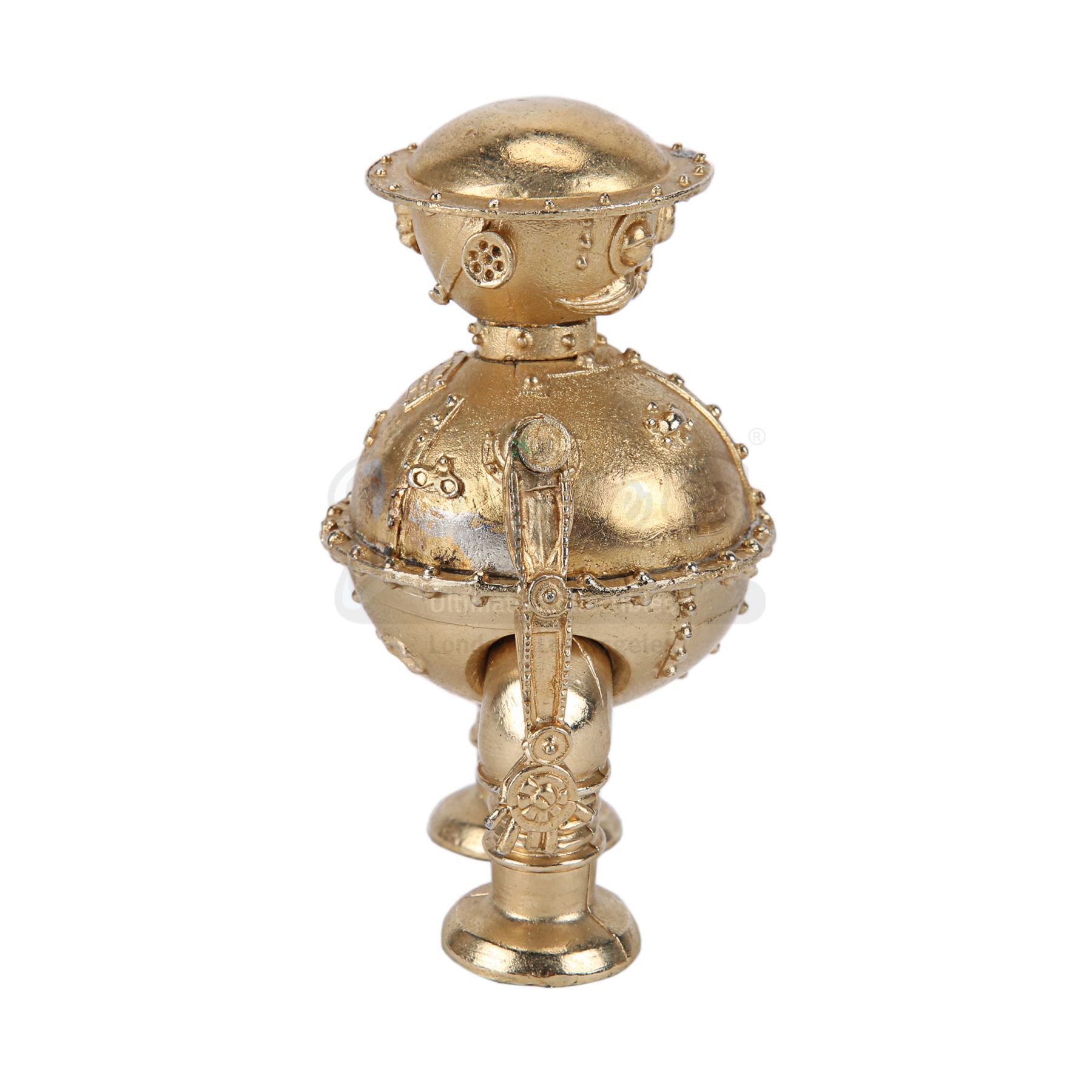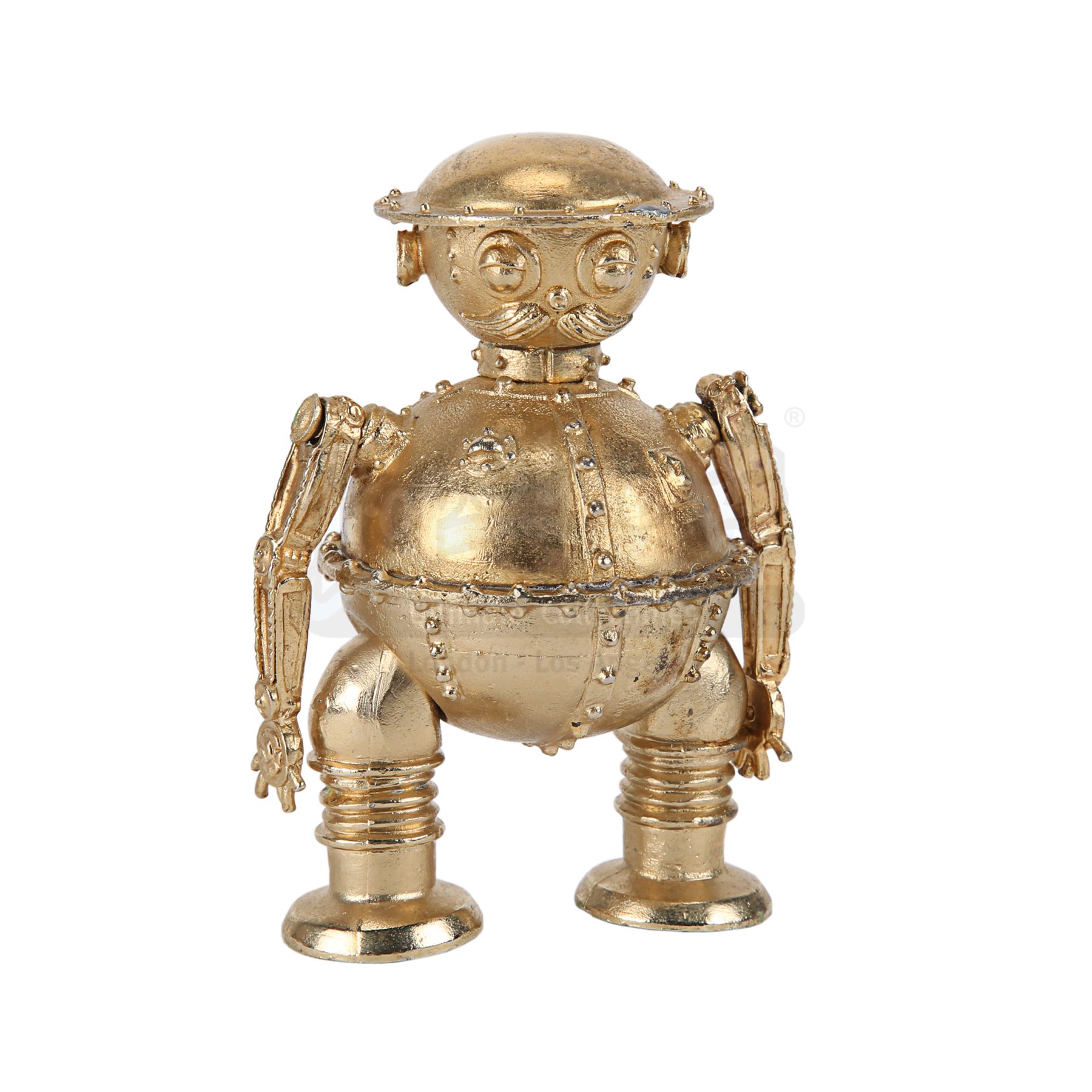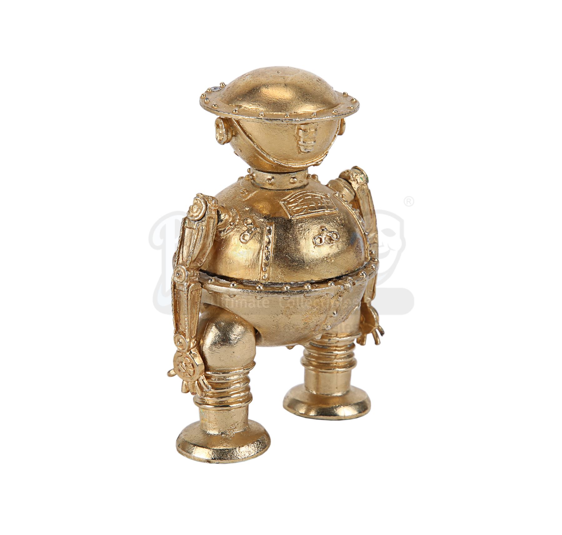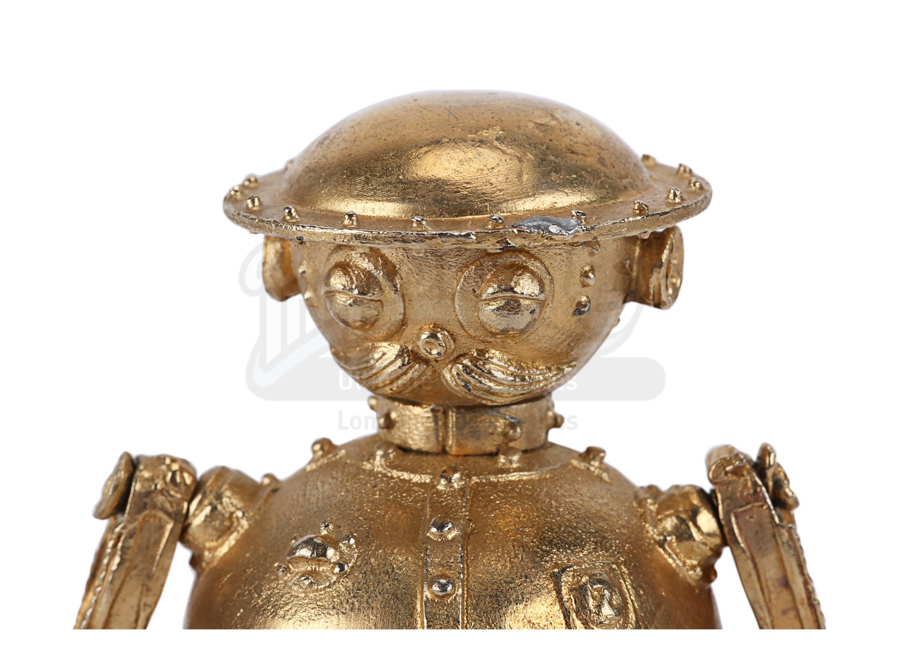 This lot will be auctioned on Thursday, July 1st. The auction will begin at 9:00am PDT and lots are sold sequentially via live auctioneer; tune in to the live streaming broadcast on auction day to follow the pace. Note other lots in the auction may close on June 29th or June 30th. A Tik-Tok crew gift from the production of Walter Murch's fantasy-adventure sequel Return to Oz. The miniature mechanical figure is made of gold-color metal and features intricate detailing, including rivets across his round torso, a mustache, and a tin helmet. Small screws are affixed through the arms, allowing them to move backward and forwards. The crew gift remains in good overall condition, with some patches of wear to the gold-color finish. Dimensions: 1.5" x 2" x 2.75" (4 cm x 5 cm x 7 cm) Estimate: $1,000 - 1,500