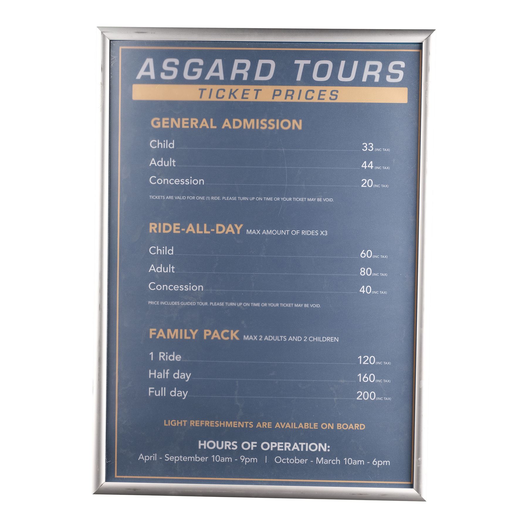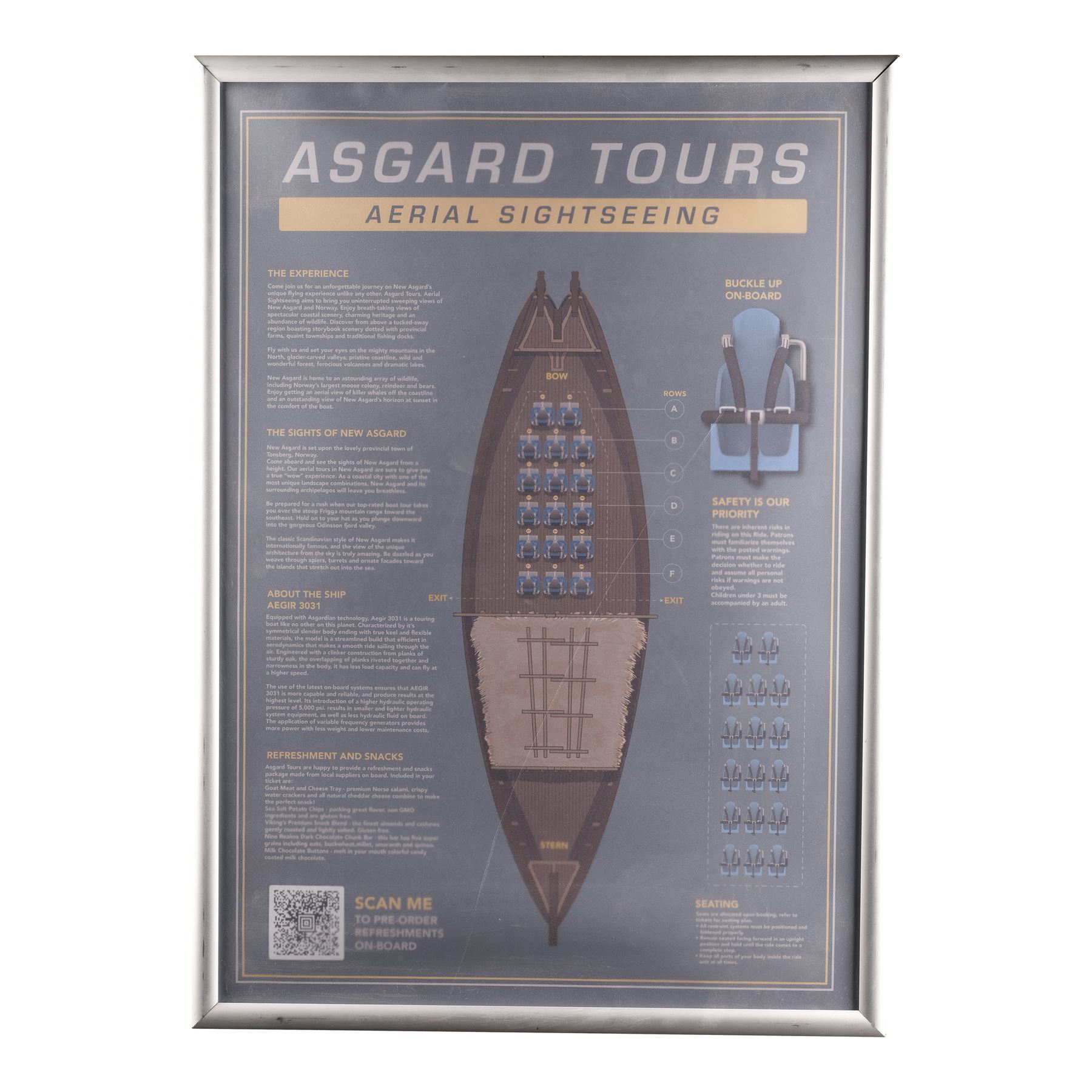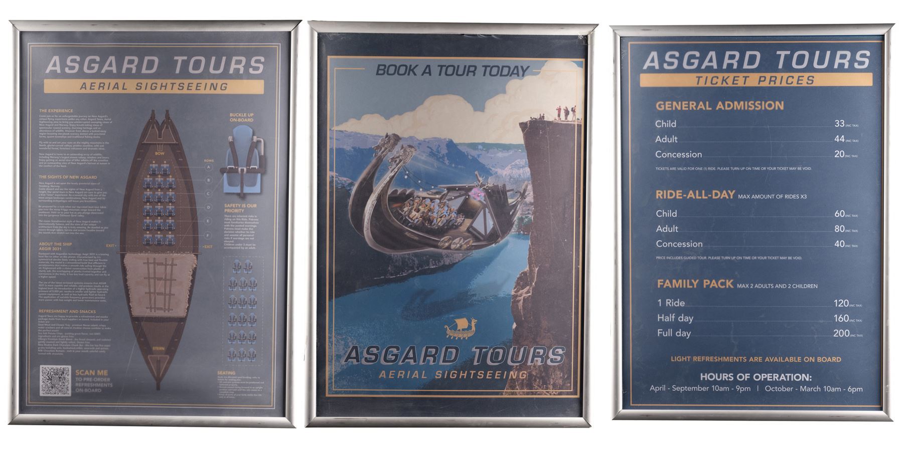 This lot consists of three Asgard Tours posters: one displays the aerial sightseeing layout on each ship; one displays the ticket prices, including day passes and family packs, and the hours of operation; and one graphic illustration poster promotes the attraction. These posters are mounted in acrylic and metal frames. This lot exhibits minor scuffing to the frame and minor bends to the poster sheets. Dimensions: 24" x 34" x 0.5" (61 cm x 86.5 cm x 1.5 cm)