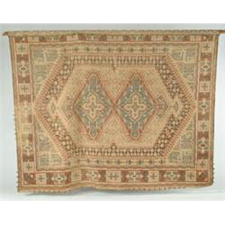 Lot # 983: INTERESTING ORIENTAL STYLE RUG/TAPESTRY. Rug design in colors of red, green and tan. Presently mounted on wood hanger. Possibly a form of tent flap. SIZE: 77” x 64”. CONDITION: Faded. Some wear. Fair to good. 9-97446