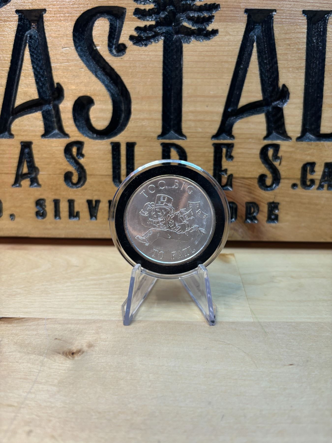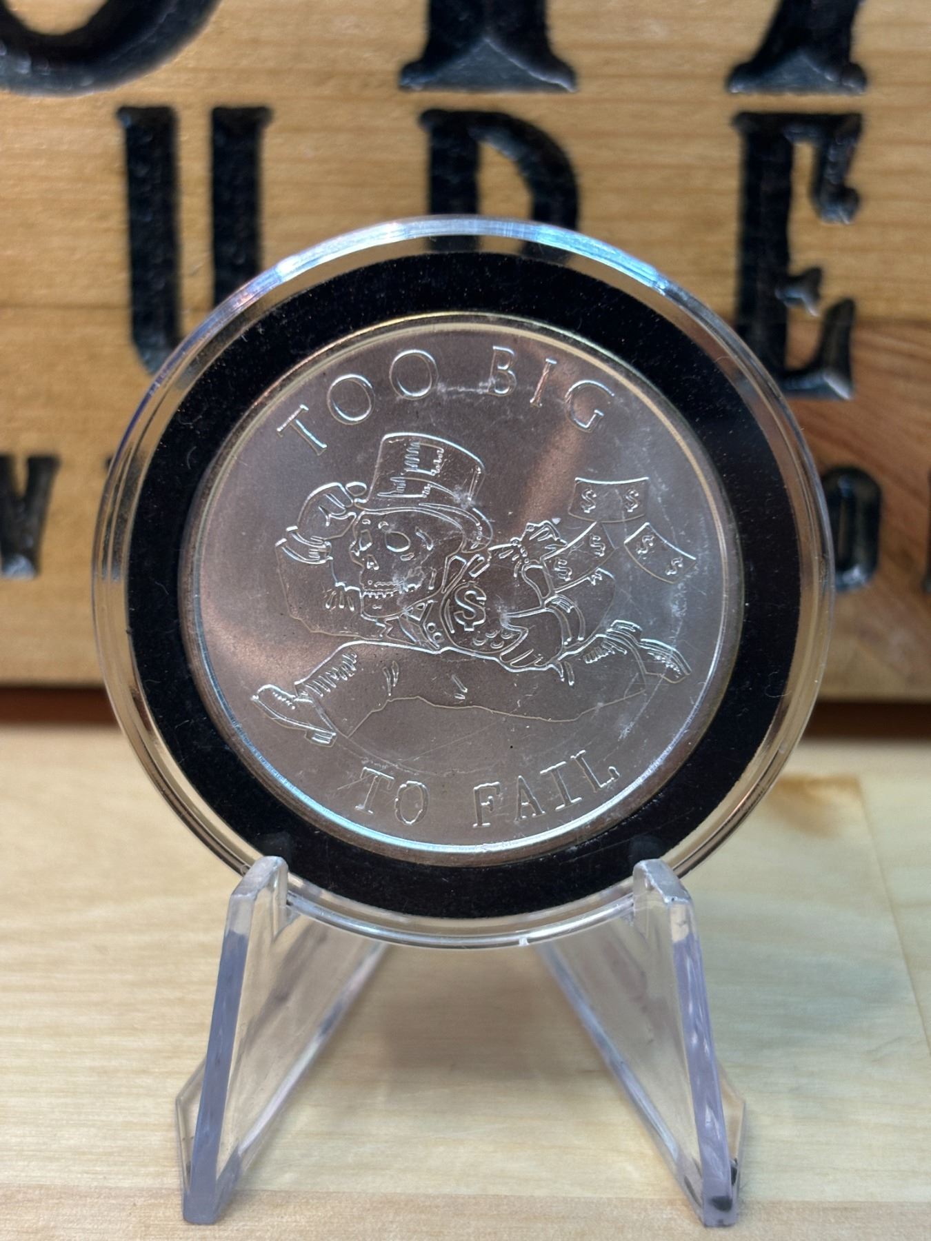 The 1 oz Too Big To Fail Silver Round is a 1-ounce silver round made from 99.9% pure silver. It features a design inspired by the financial crisis and the concept of "too big to fail," a phrase used to describe major financial institutions that are considered so large and interconnected that their failure could harm the broader economy. The round typically includes imagery related to banks, the economy, or symbols of financial power, often with a provocative or thought-provoking message. It's popular among collectors who are interested in economics or want to commemorate this significant phrase in financial history, valued for both its silver content and its symbolic design.