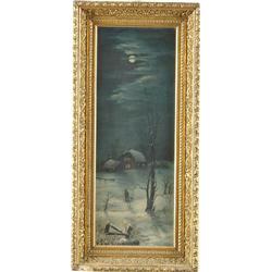 Lot # 990: F.C. OLMSTEAD (American, 19th/20th C) WINTER NIGHTTIME STROLL. Oil on board nighttime scene with full moon showing through clouds, house with lights in windows with man and dog walking down snow covered path. Signed lower right. Housed in a good gesso decorated original frame with small gesso section missing. SIZE: 24-1/2” x 9”. CONDITION: Very good. 9-97665