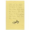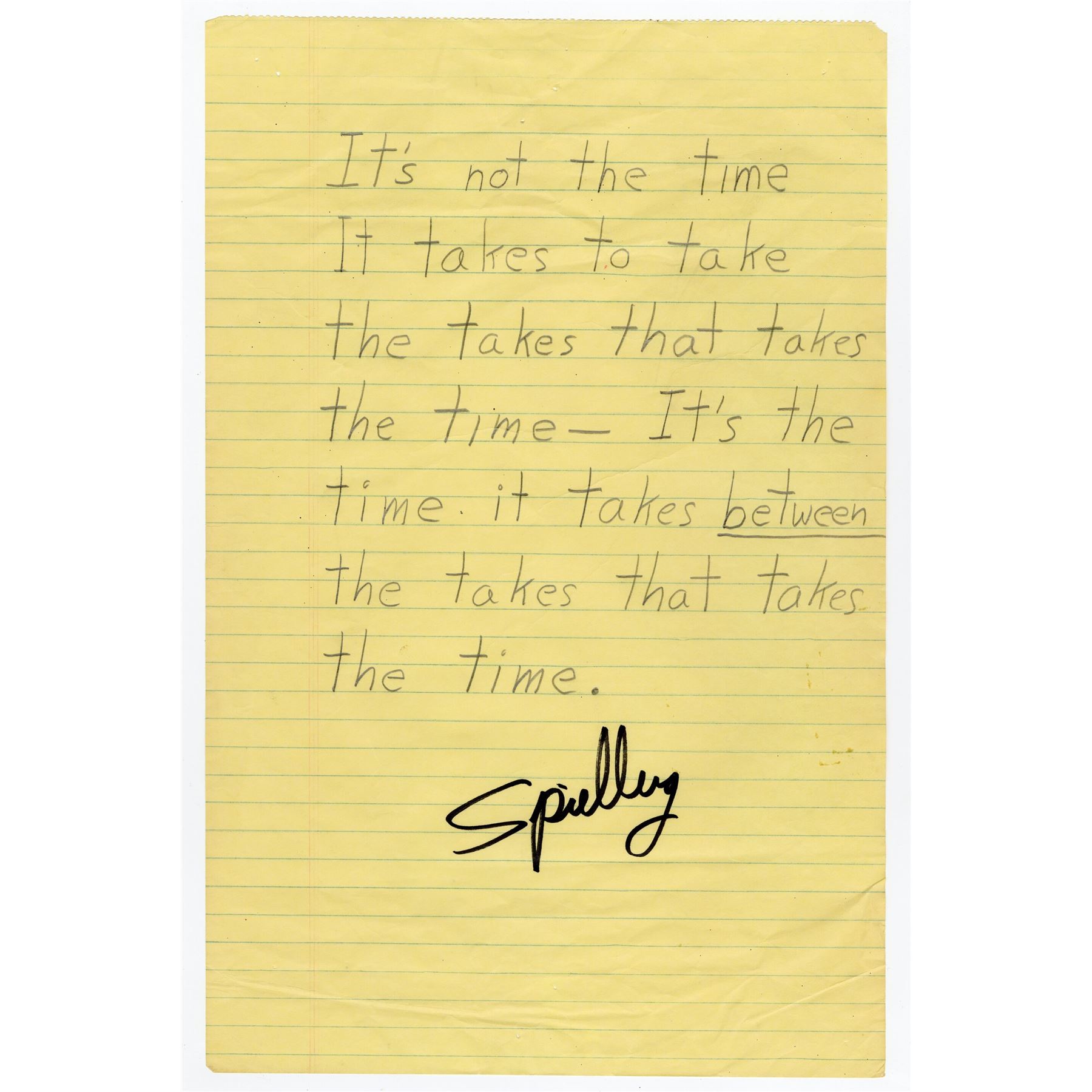 Steven Spielberg's personal note from circa the production of Close Encounters of the Third Kind. Handwritten in graphite and signed in black marker on yellow lined paper in Spielberg's signature script, this elliptical, ruminative note reads "It's not the time/It takes to take/the takes that takes/the time - It's the/time it takes between/the takes that takes/the time." The paper exhibits some crumpling on the bottom and pinholes throughout from being hung. Dimensions: 21.75 cm x 33.5 cm (8.5" x 13.25")