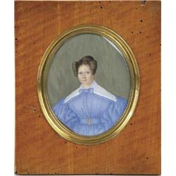 Lot # 997: OUTSTANDING FRENCH OVAL MINIATURE ON IVORY OF WOMAN IN BLUE DRESS. Paper backing identifies sitter as “Mademoiselle Virginie De Lattre”. Detailed portrait shows a young woman with fine hairdo, elegant blue dress with belt and white collar. SIZE: 3-1/2” x 3”. CONDITION: Very good. Frame has insect damage. 9-96122