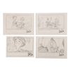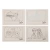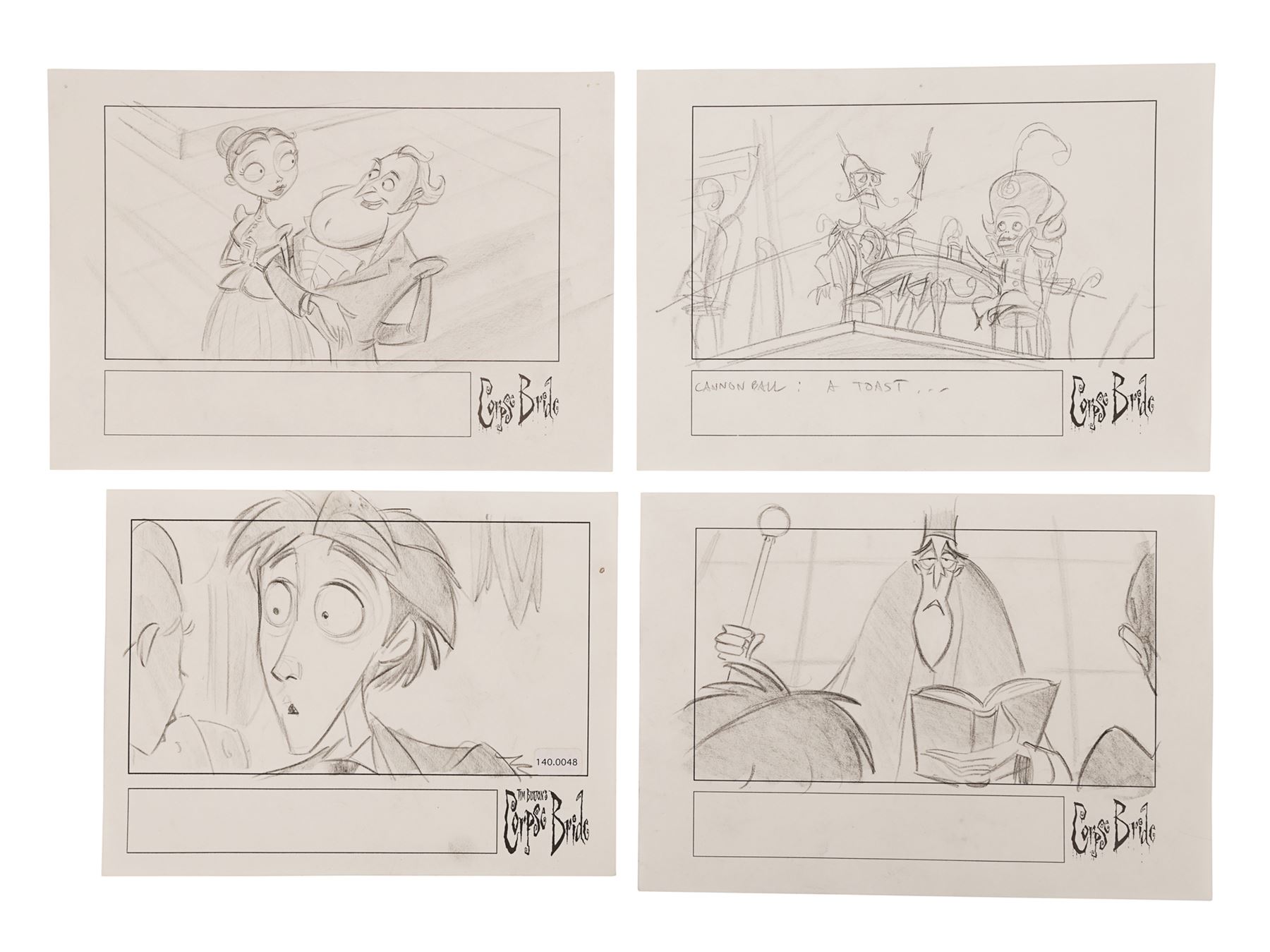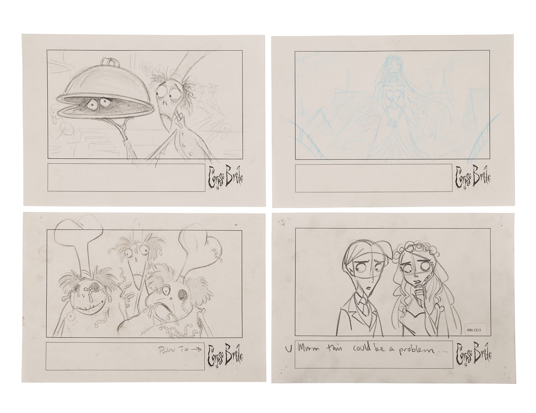 A collection of hand-drawn storyboards from the production of Tim Burton and Mike Johnson's stop-motion animated musical romance Corpse Bride. The lot comprises 10 separate storyboard panels, each of which is hand-drawn onto thin tracing paper in grey, black and blue pencil, and presented within a printed frame Underneath each frame is a smaller box containing a description of the shot, which in most cases is handwritten. The panels mostly depict shots of the main characters Victor Van Dort (voiced by Johnny Depp) and the Corpse Bride (voiced by Helena Boham Carter), and the film's title is printed in the bottom right corner of each panel. Post-its featuring additional hand-written comments in blue ink are stuck to two of the 10 storyboards are stuck to. Dimensions: 21 cm x 15 cm (8 1/4" x 6")