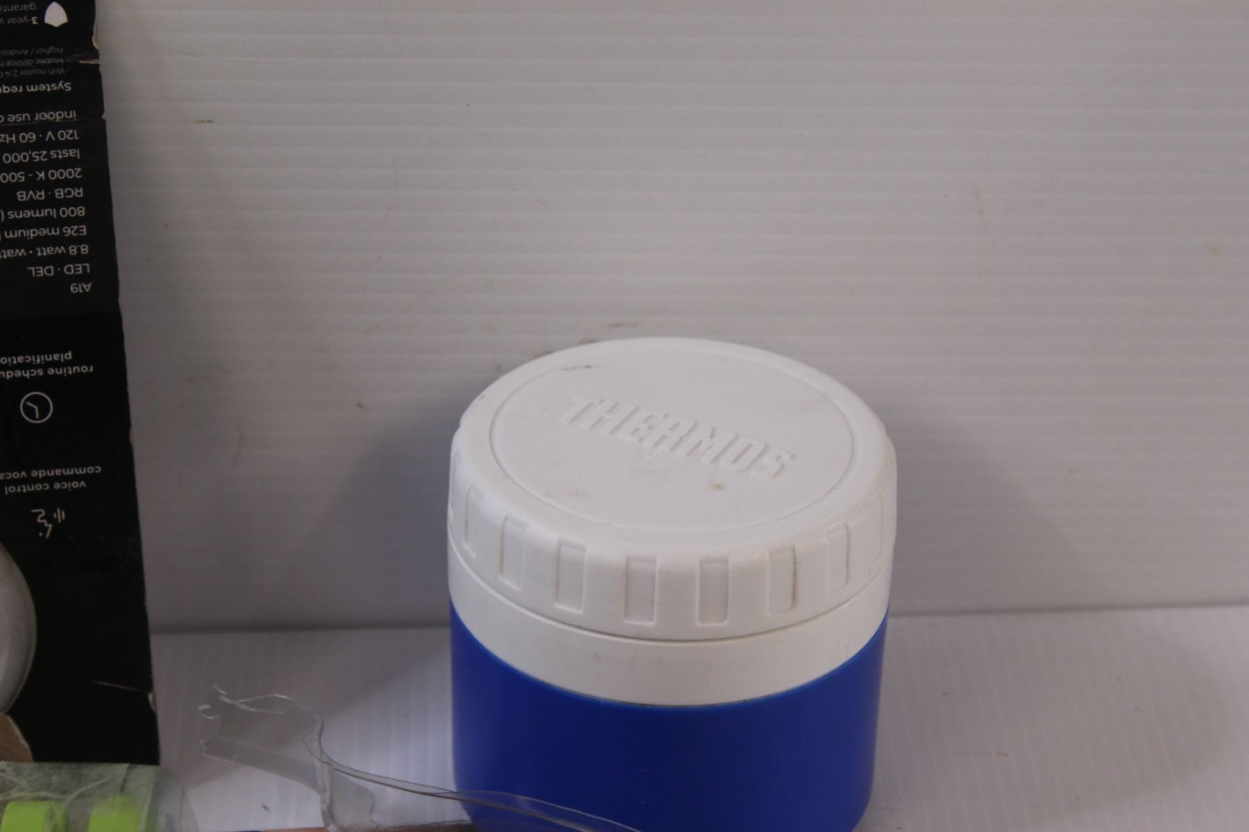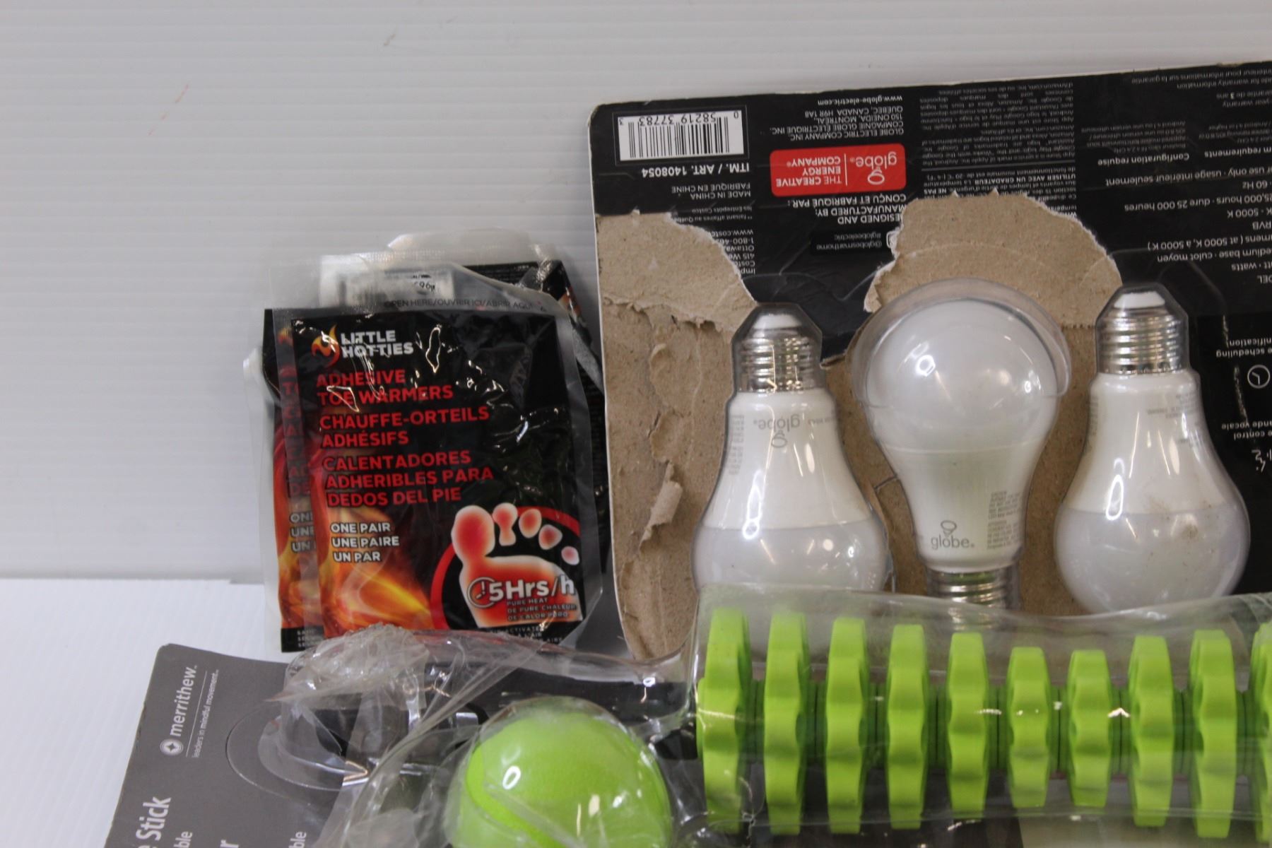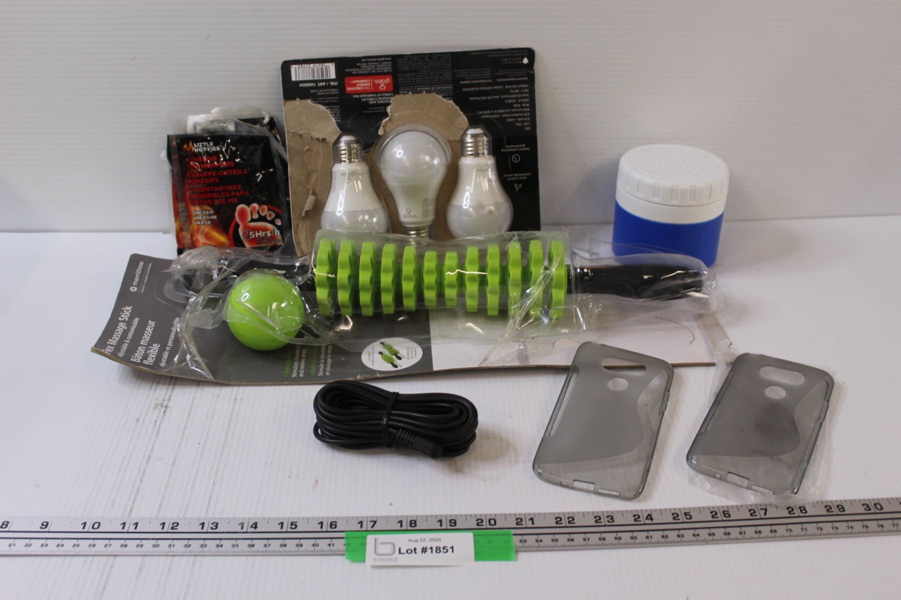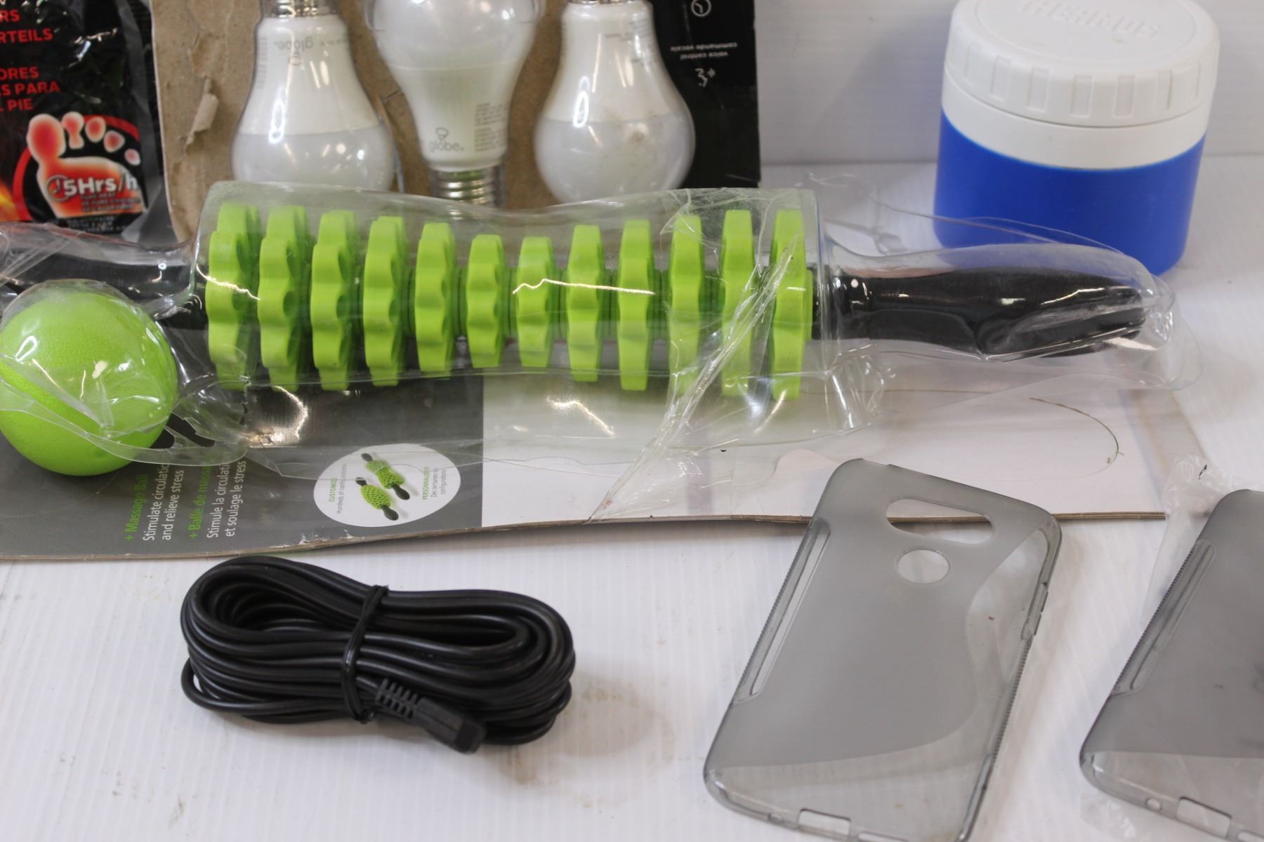 Lot: Back Massager, Lightbulbs, Thermos, (2) Cell Phone Protectors, Cable, Toe Warmers