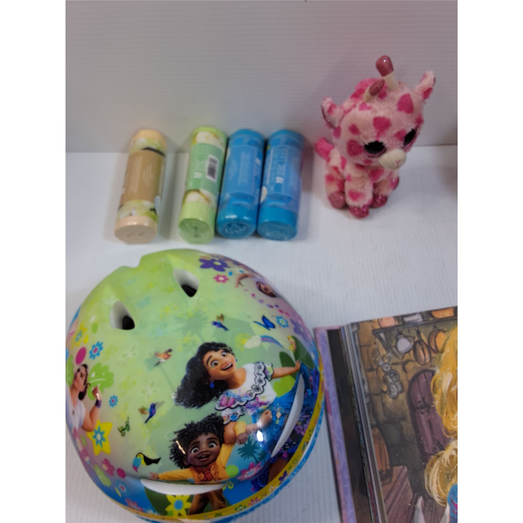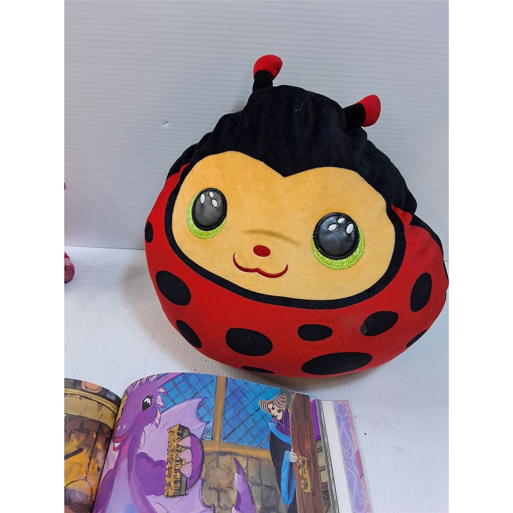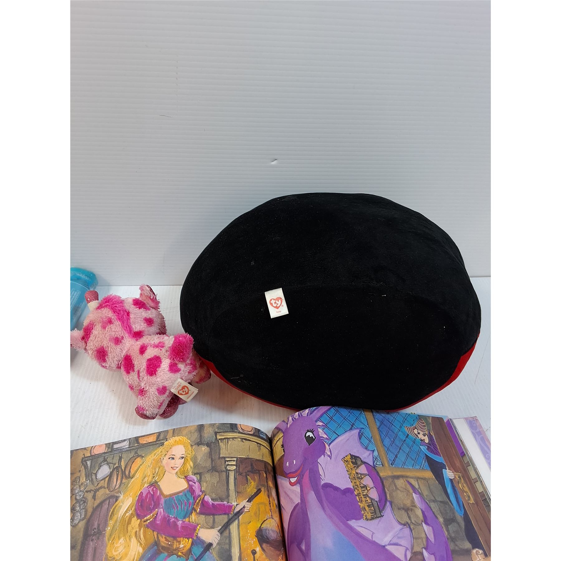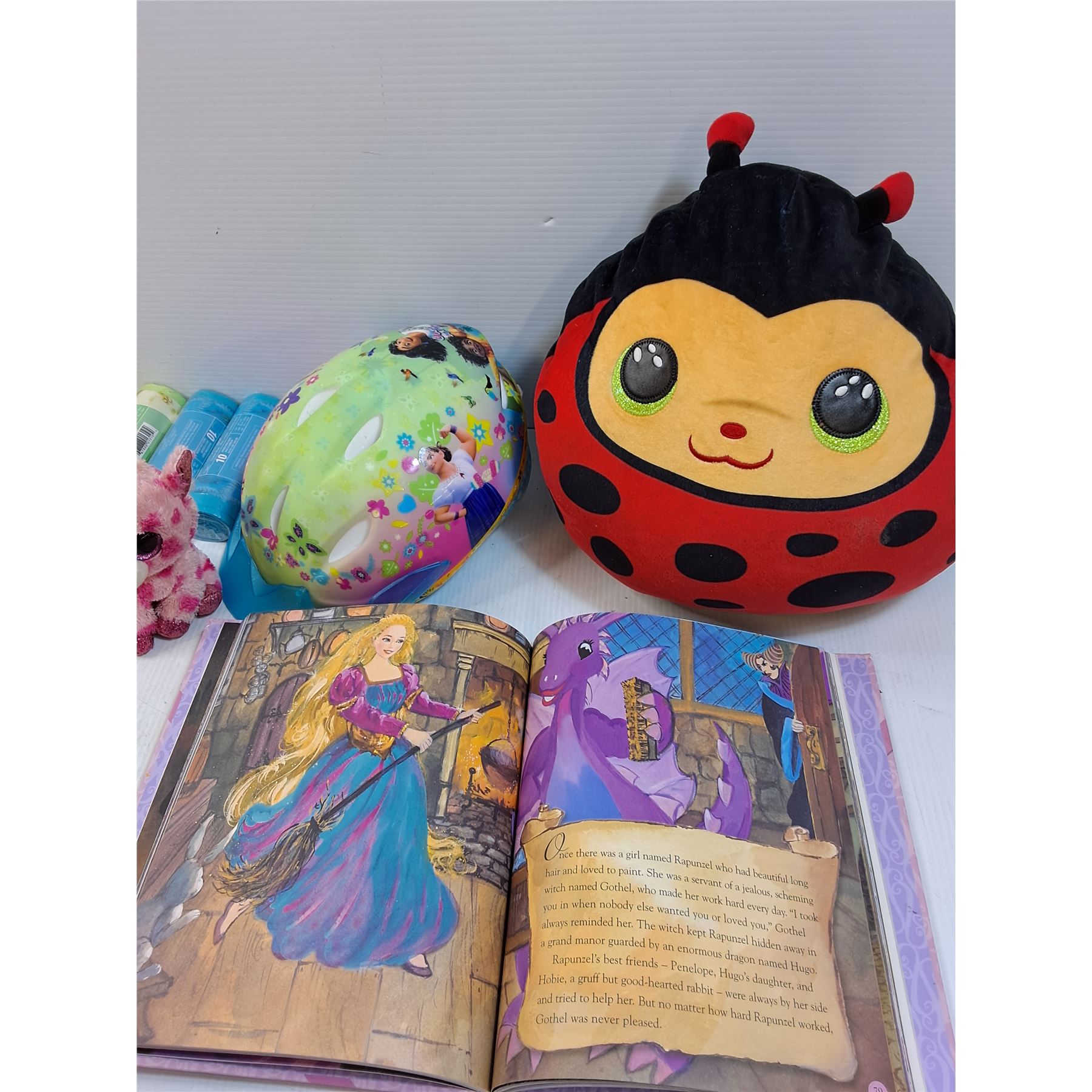 Lot: Children's Lady Bug Stuffy, Bicycle Helmet, Barbie Storybook, (4) Garbage Bags