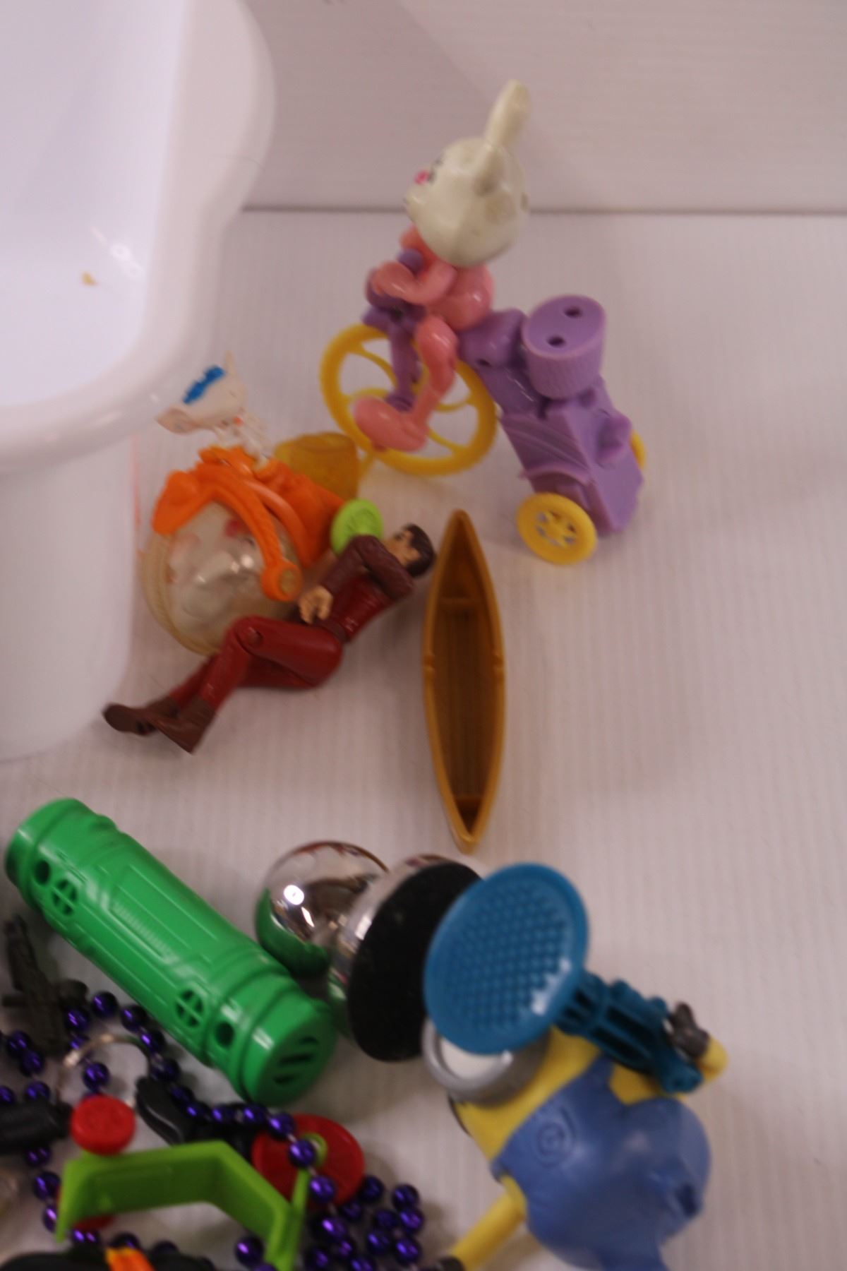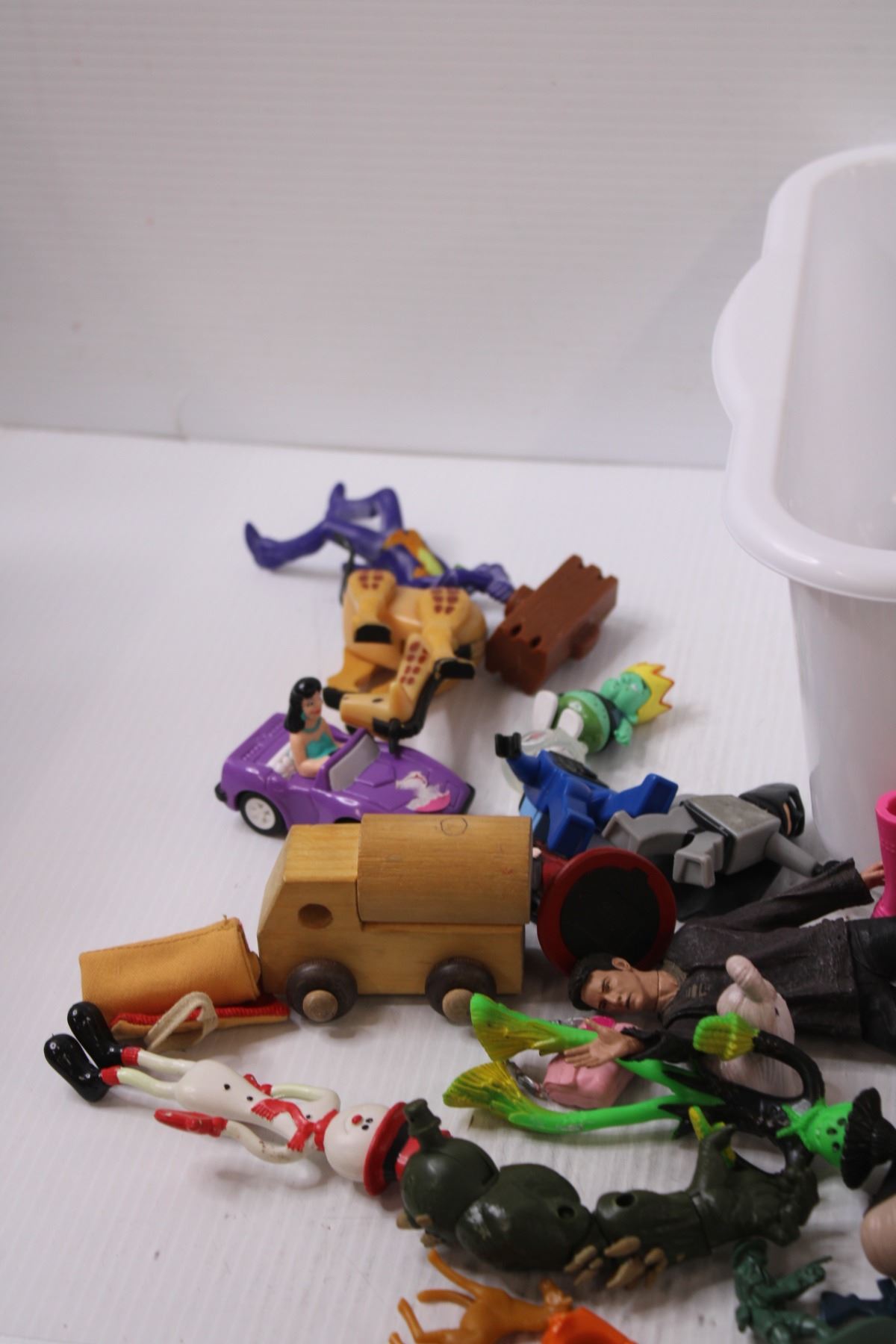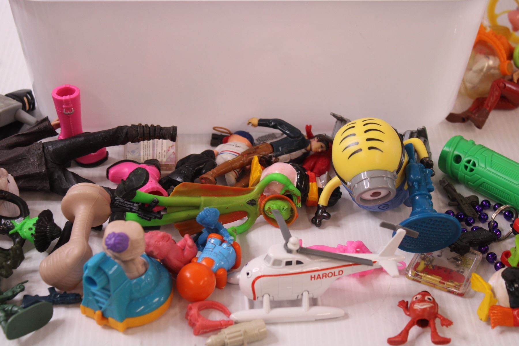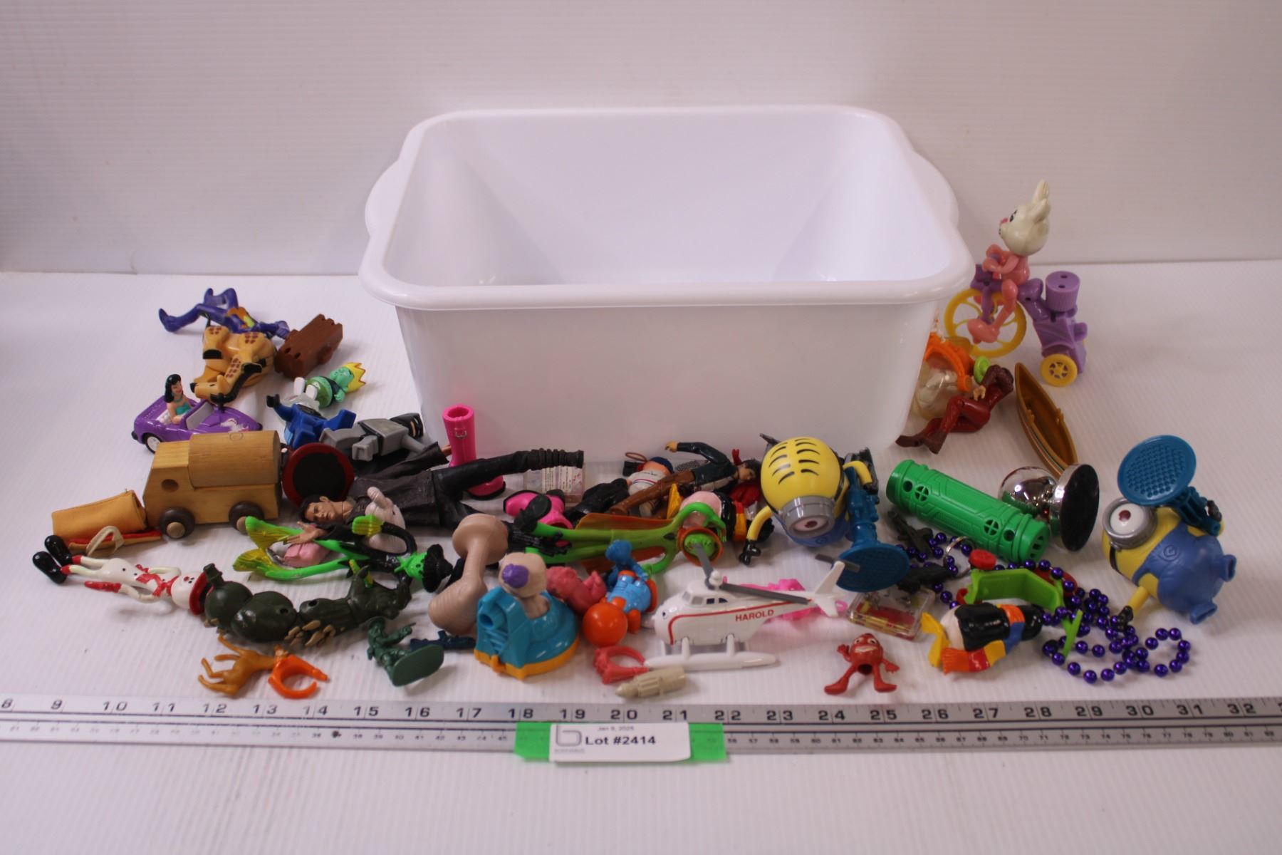 Lot: Children's McDonalds Toys, Wooden Toy, Misc. in Storage Container