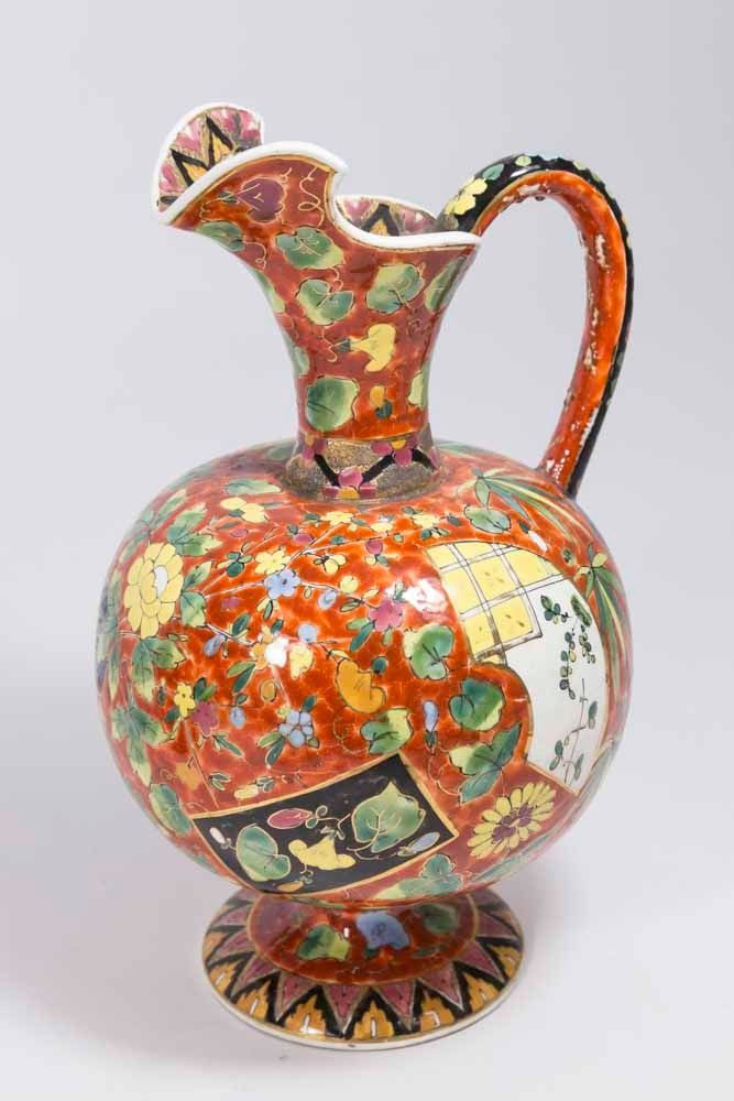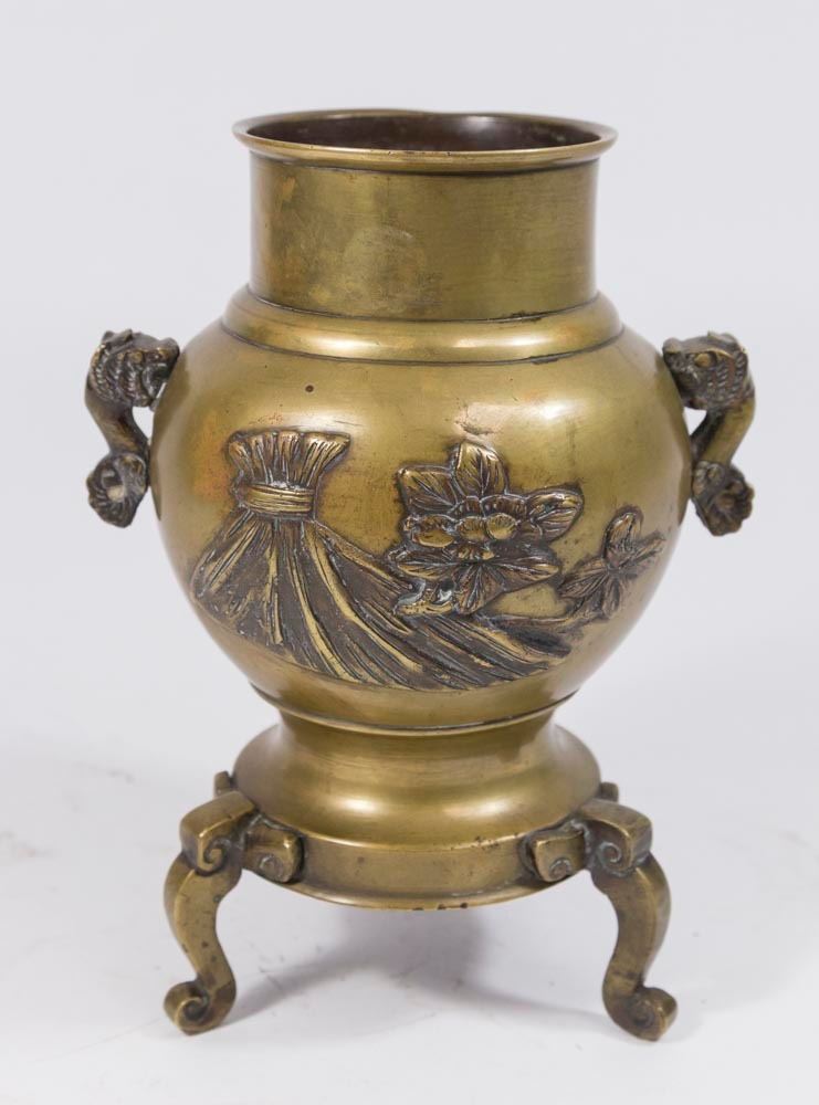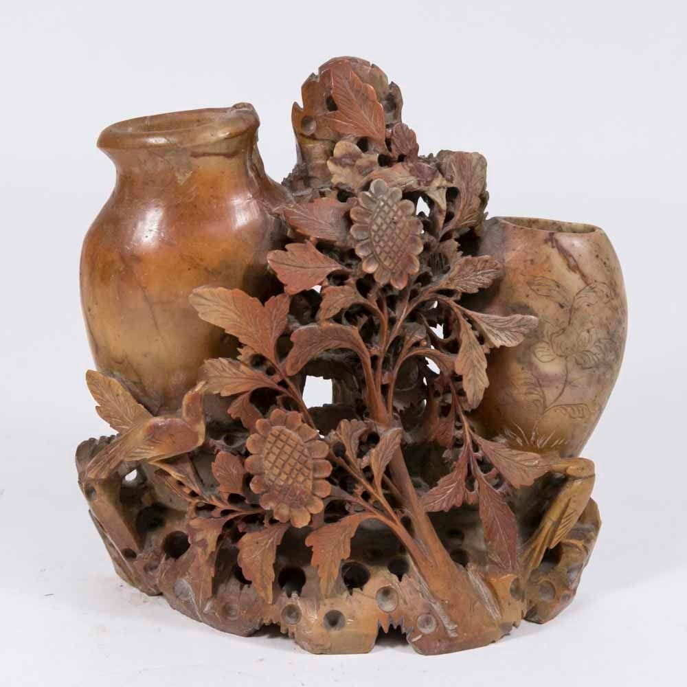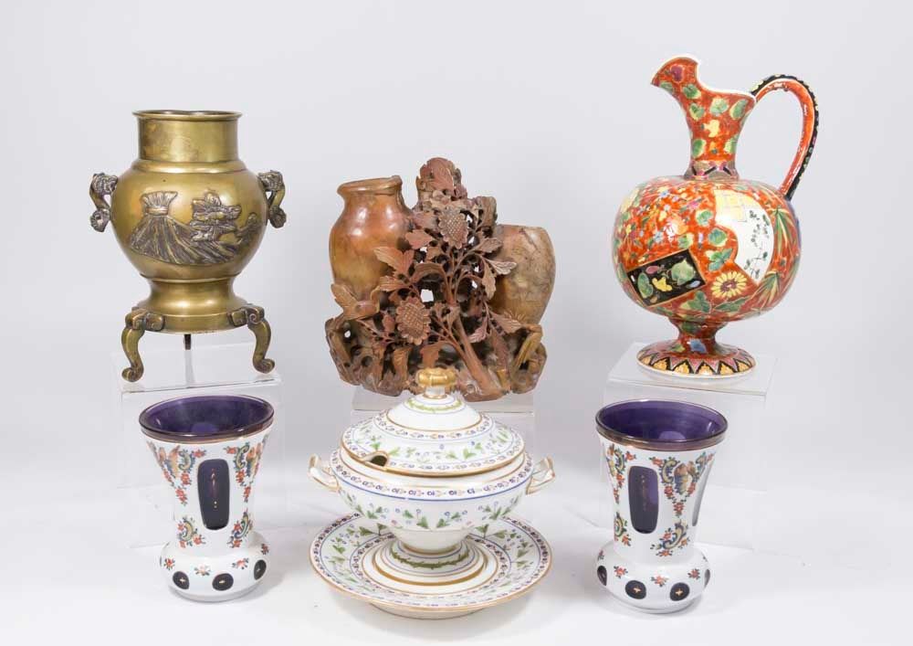 Including Fischer vase, approx. 10 1/4" H; pair Bohemian vases, approx. 5 1/2" H; carved soapstone urn; Chinese brass urn; and 19th century English porcelain covered tureen with underplate.