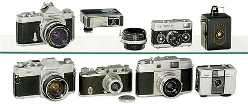 Lot Different 35 mm Cameras 1) Leitz, Wetzlar. "Leica II", 1933, no. 112411, with Elmar 3,5/5 cm, no. 399678, with synchronization, shutter stuck. - 2) "Rollei 35", Singapore. - 3) "Ricoh Auto Half". - 4) "Nikkormat FT", with Nikkor-H 2/50 mm. - 5-7) Zeiss "Baby-Box", "Mamiya 500 DTL", with Sekor 2/50 mm, and "Mamiya 35". - And: Vivitar flash auto 251 and converter Samigon 2 x for Nikon F. - Cameras not tested!<Br>