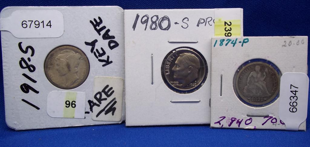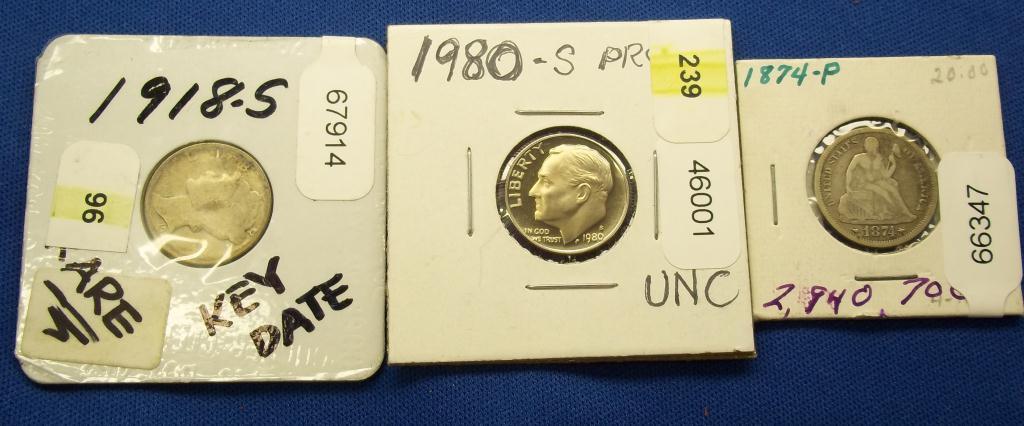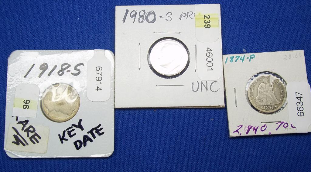 Lot-Dimes 1918-S Key Date, 1874-P VF, 1980-S Proof