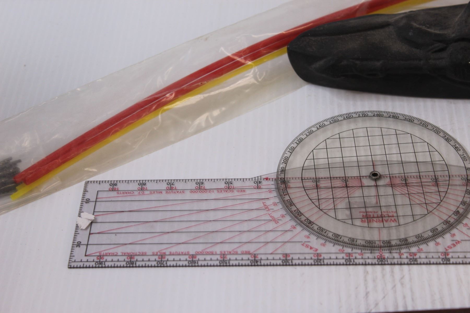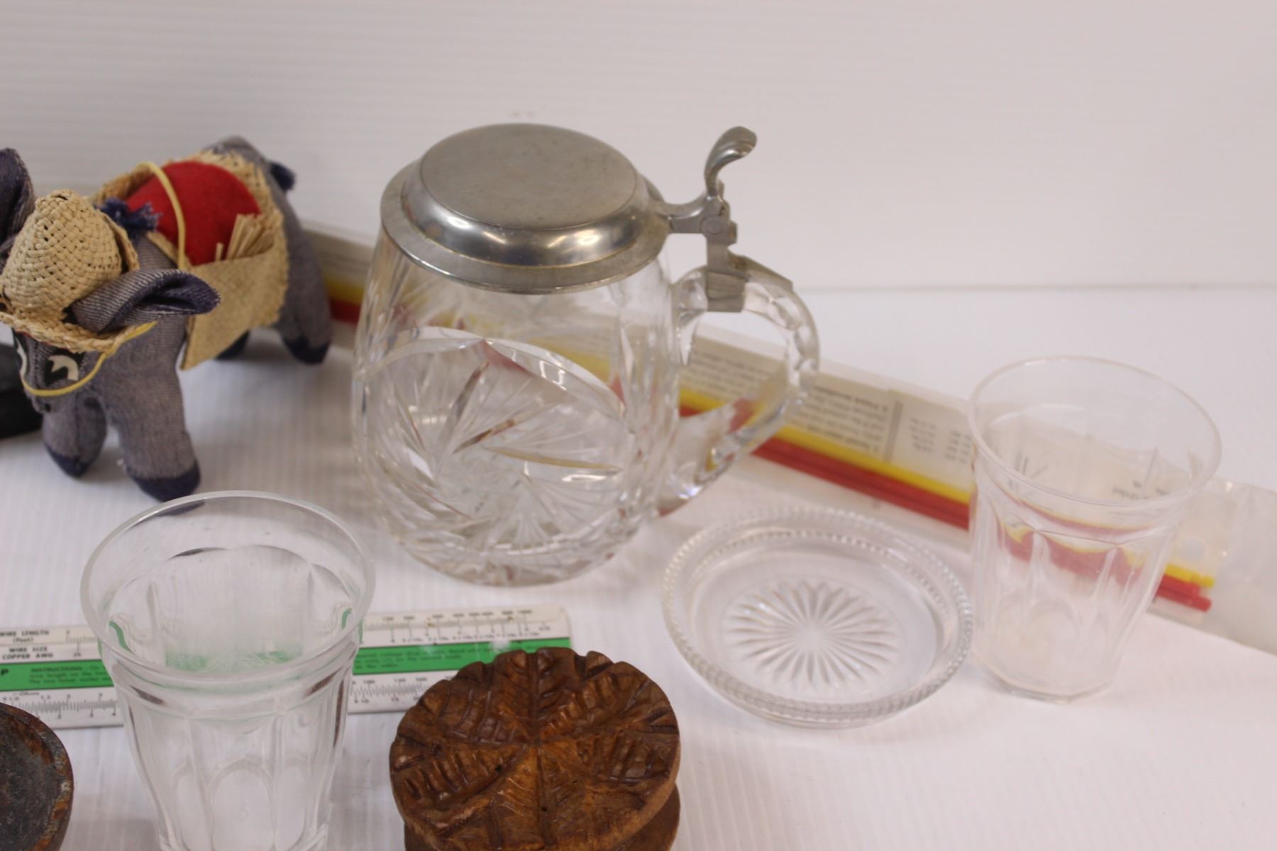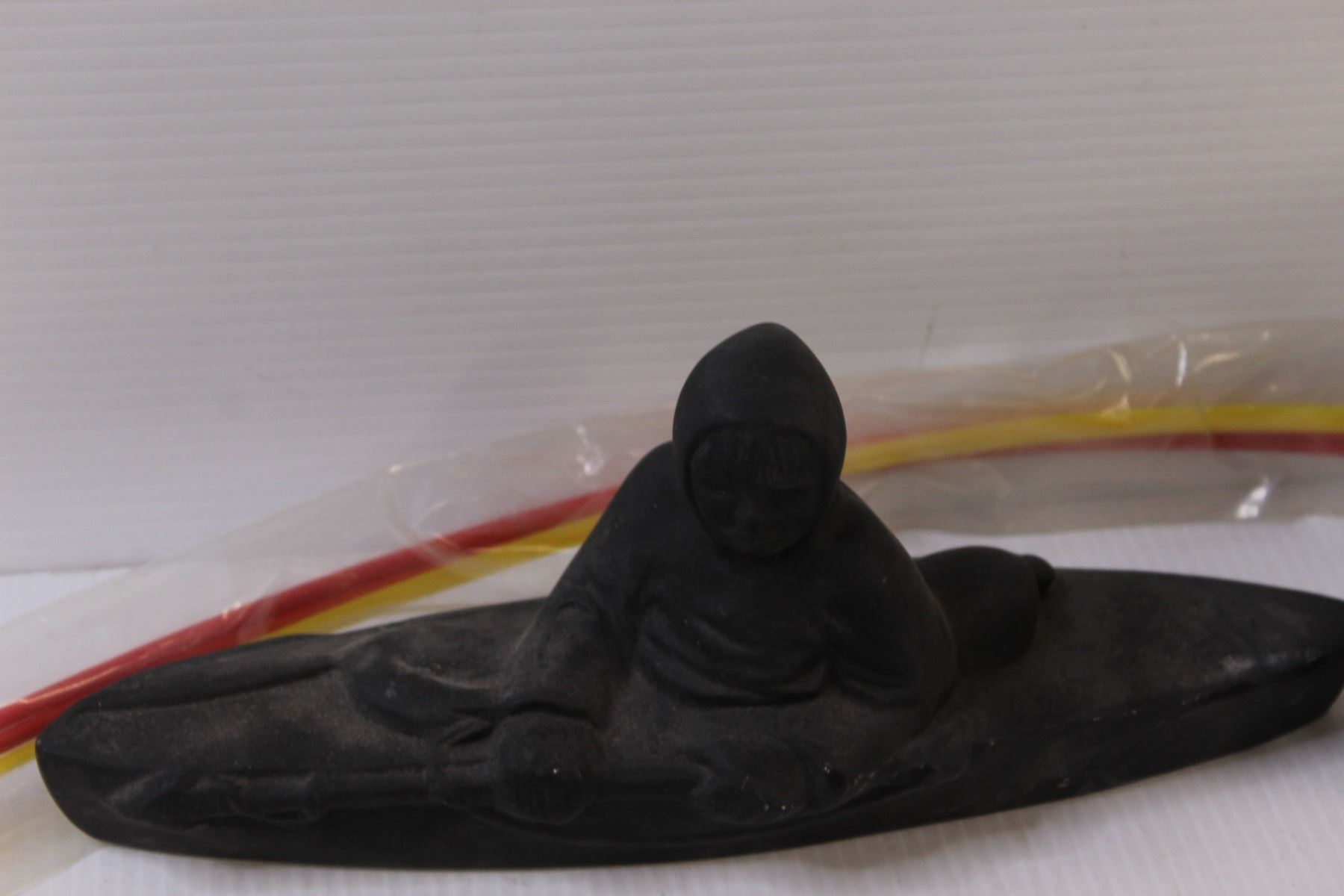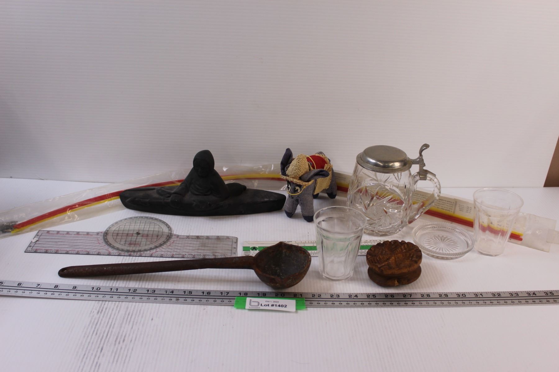 Lot: Flight Ruler, Indigenous Clay Canoe & Man, Pinwheel Beer Stein, Cast Iron Ladle, Misc.