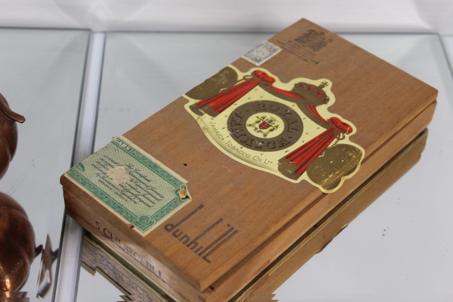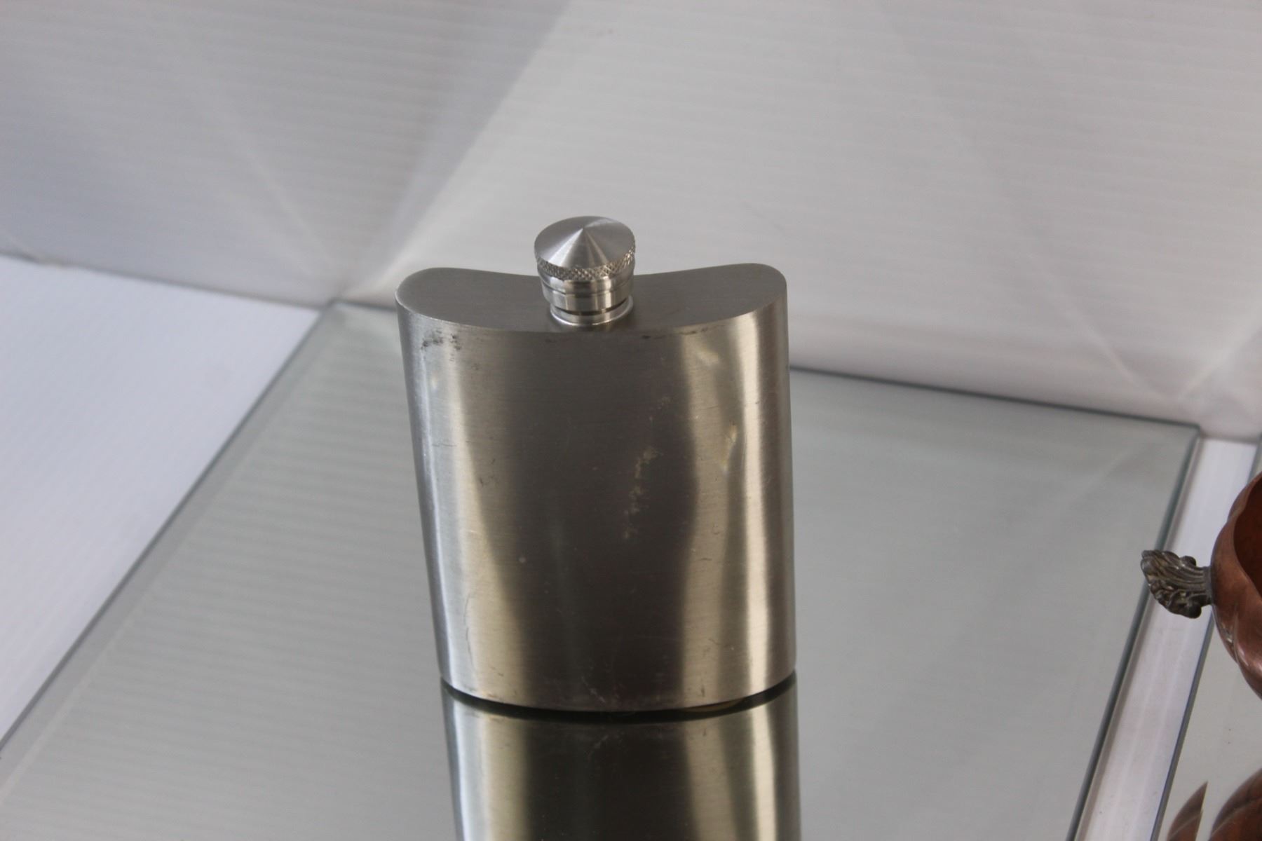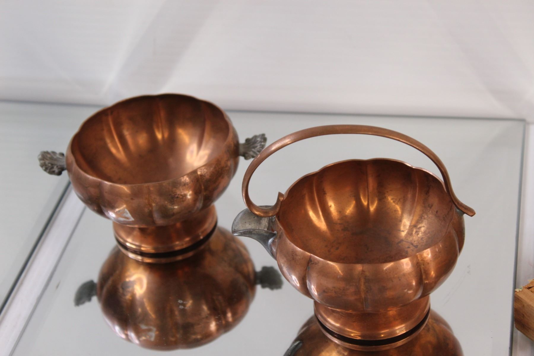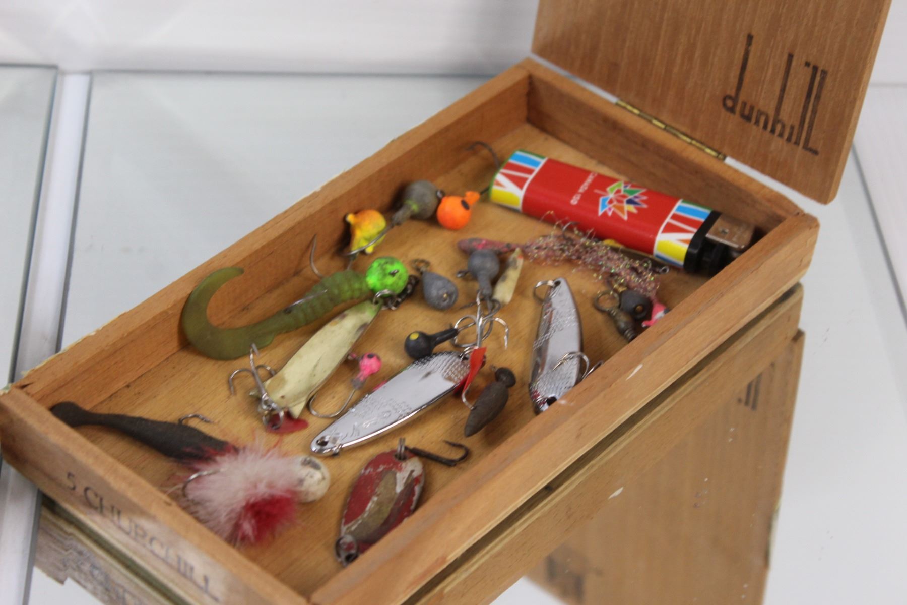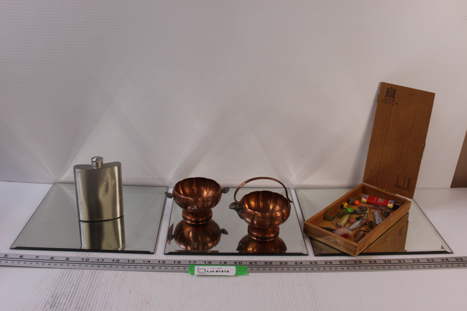 Lot: Fly Fishing Lures in Cigar Box, (2) Copper Plated Sugar & Cream Bowls, Flask, (3) Mirror Tiles