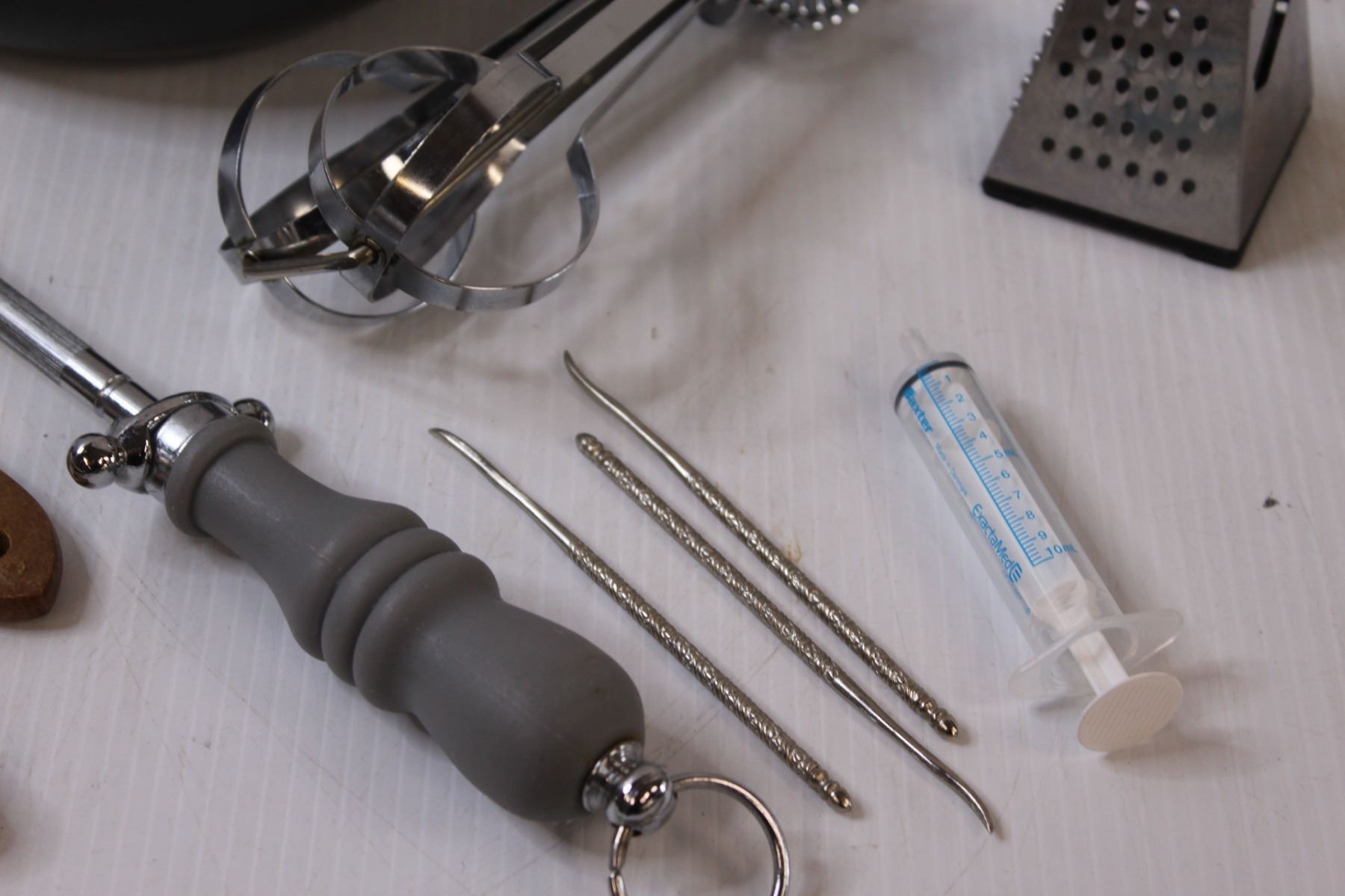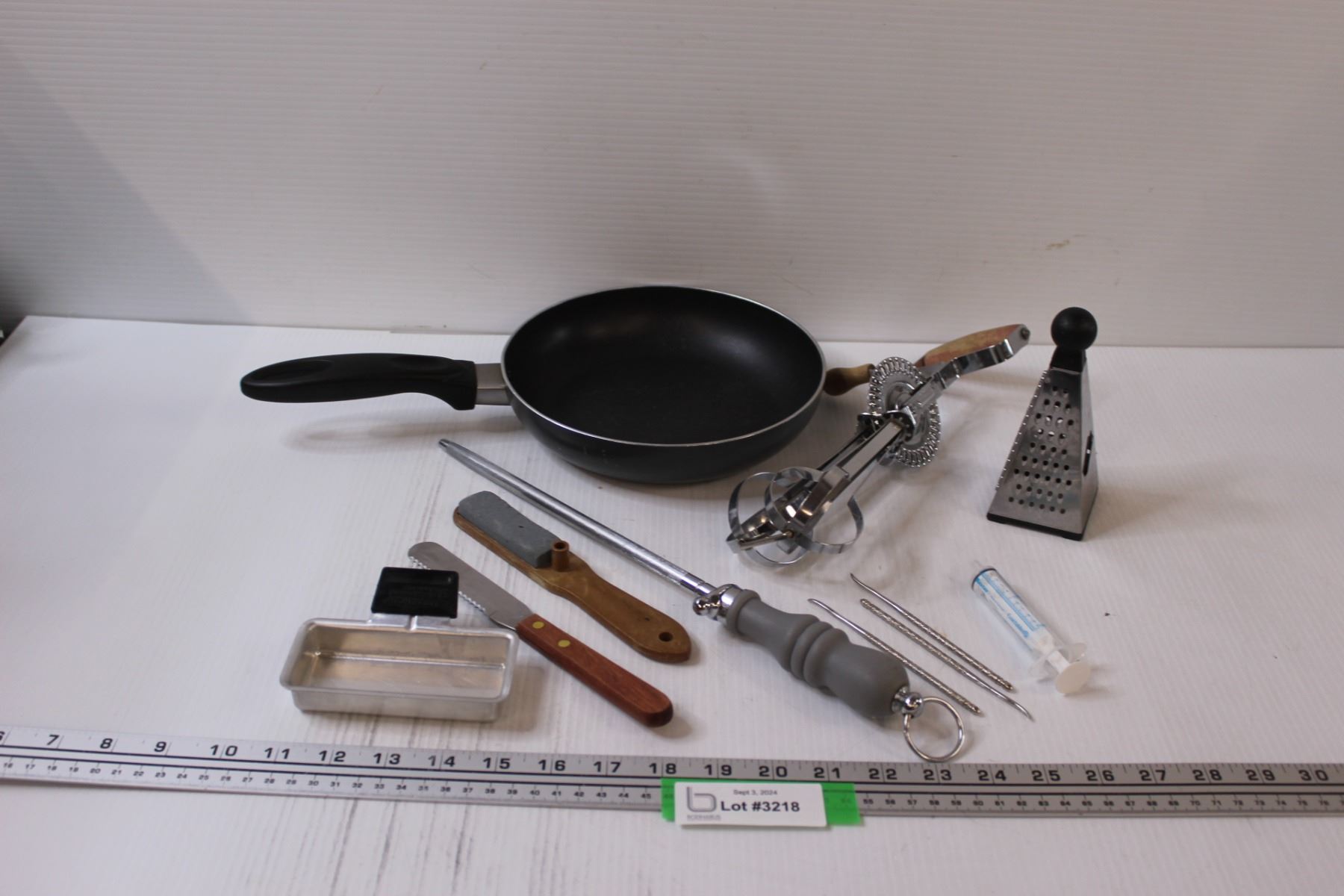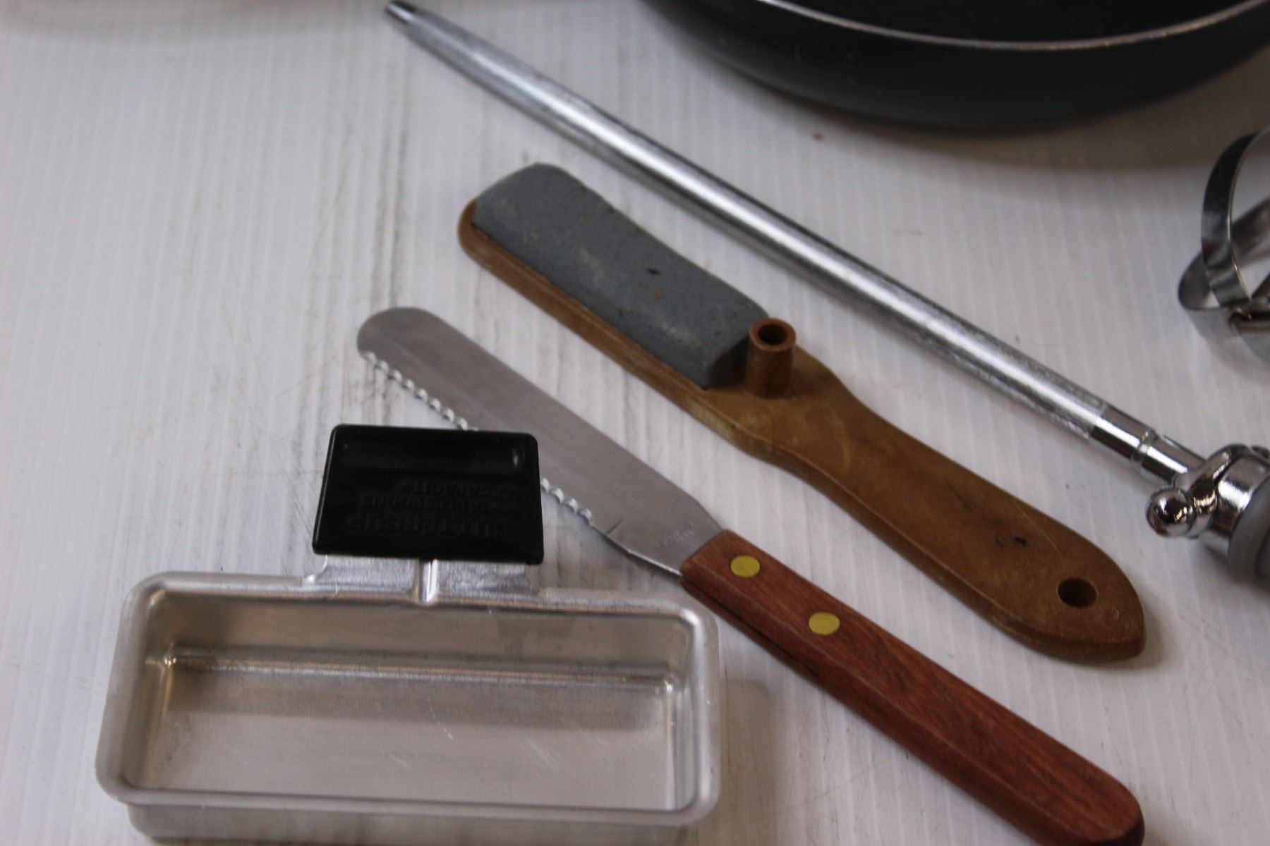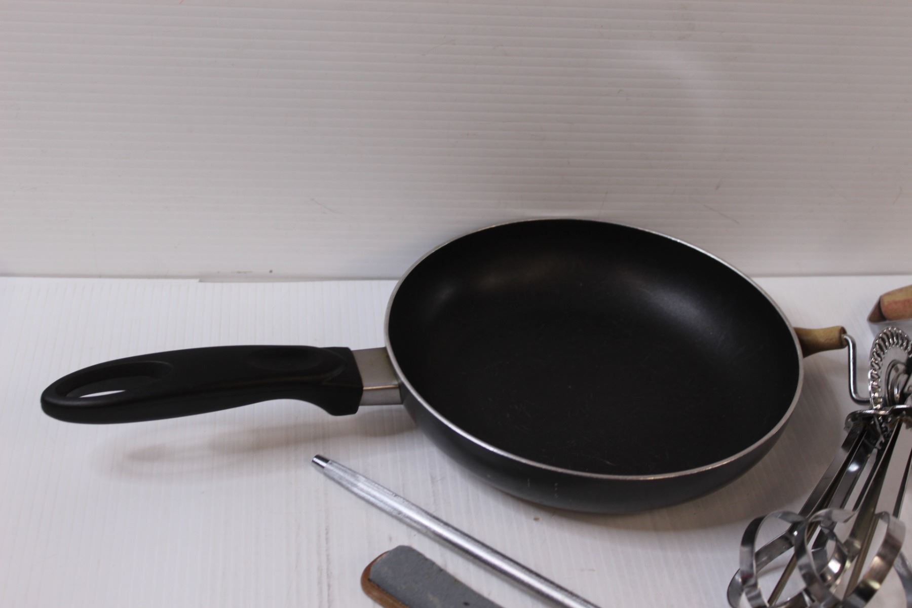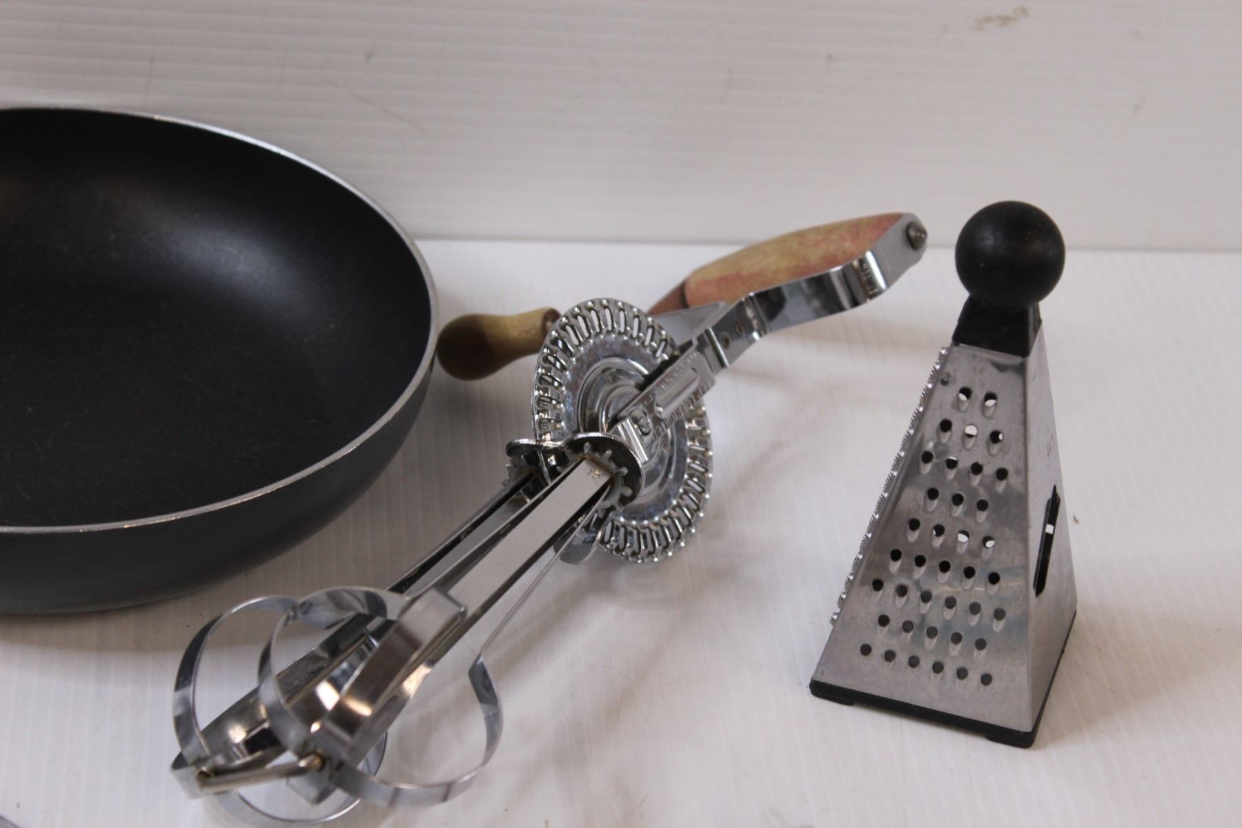 Lot: Frying Pan, Hand Beater, Grater, Knife Sharpener, Misc.