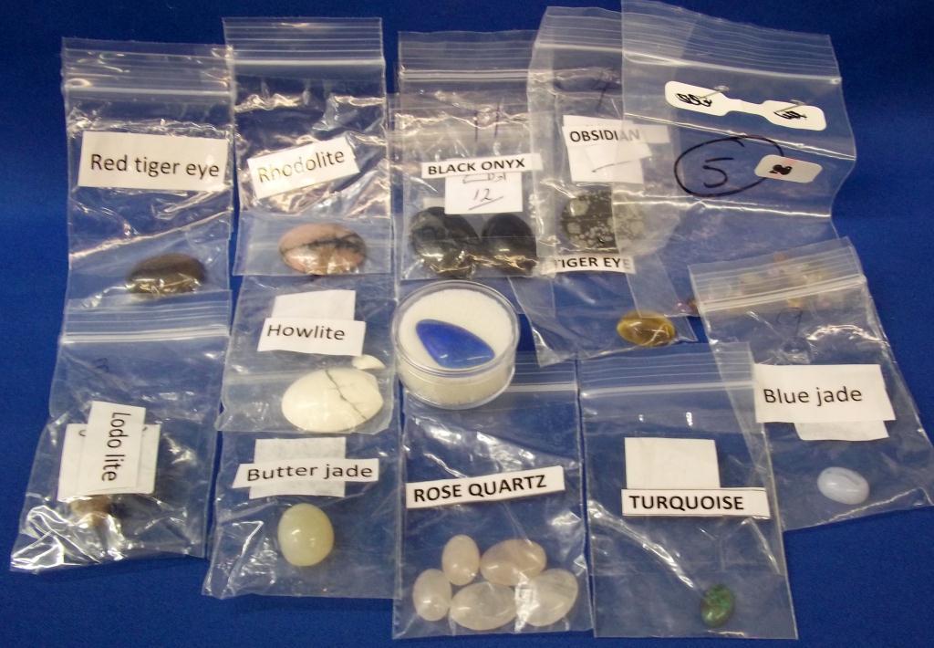 Blue Jade,Rhodolite,Obsidian,Turquoise,Red Tiger Eye,Lodo Lite,Tiger Eye,Lapis,Howlite (chipped), Butter Jade,Black Onyx,Rose Quartz, Blue ? in case,Bag of misc small stones
