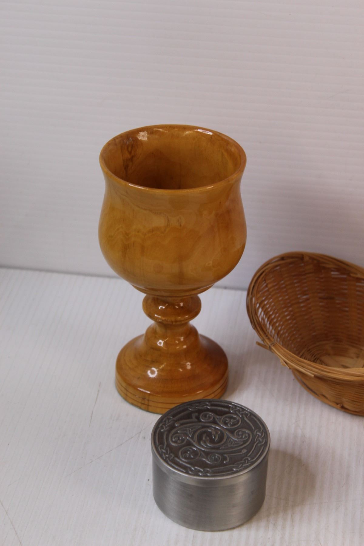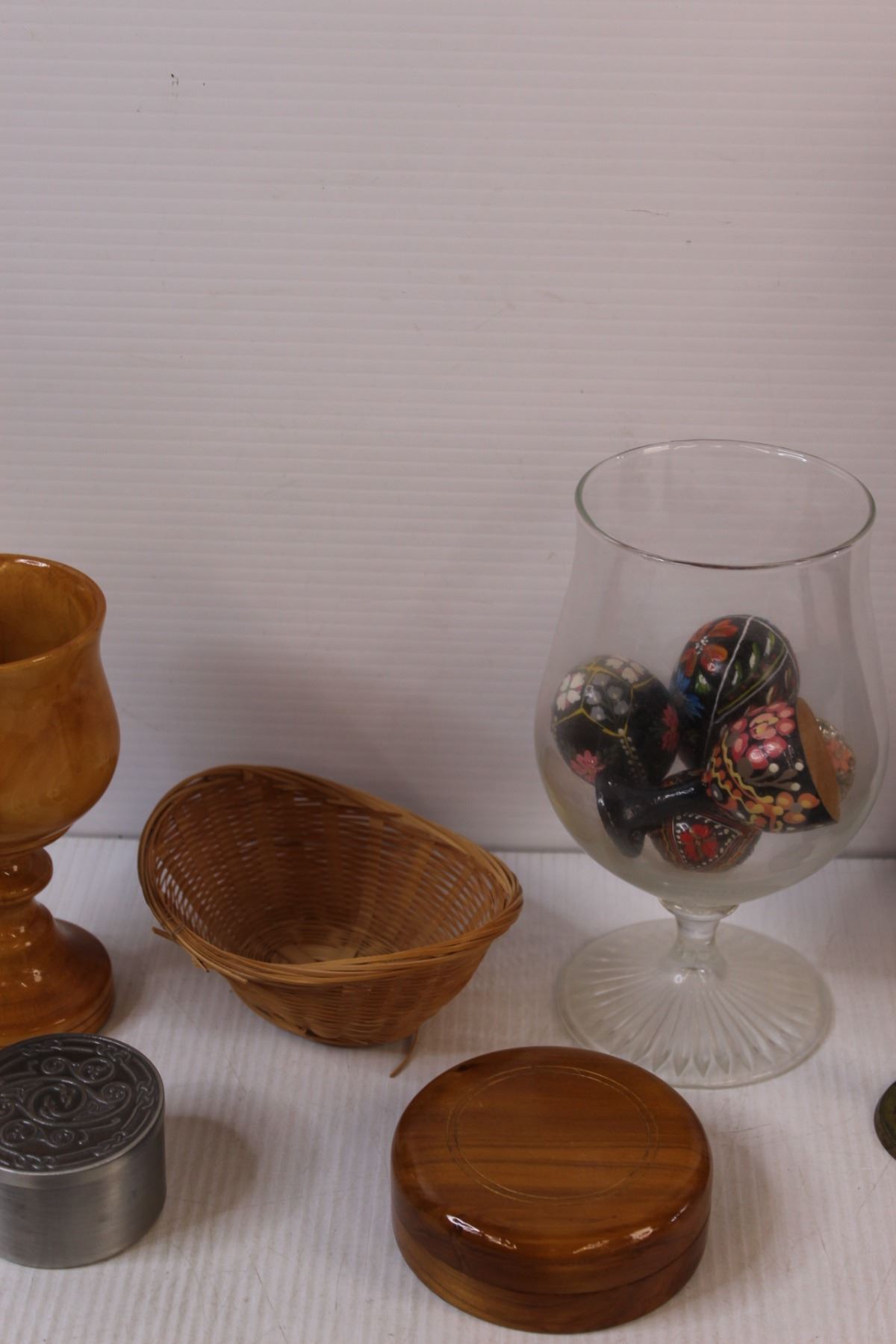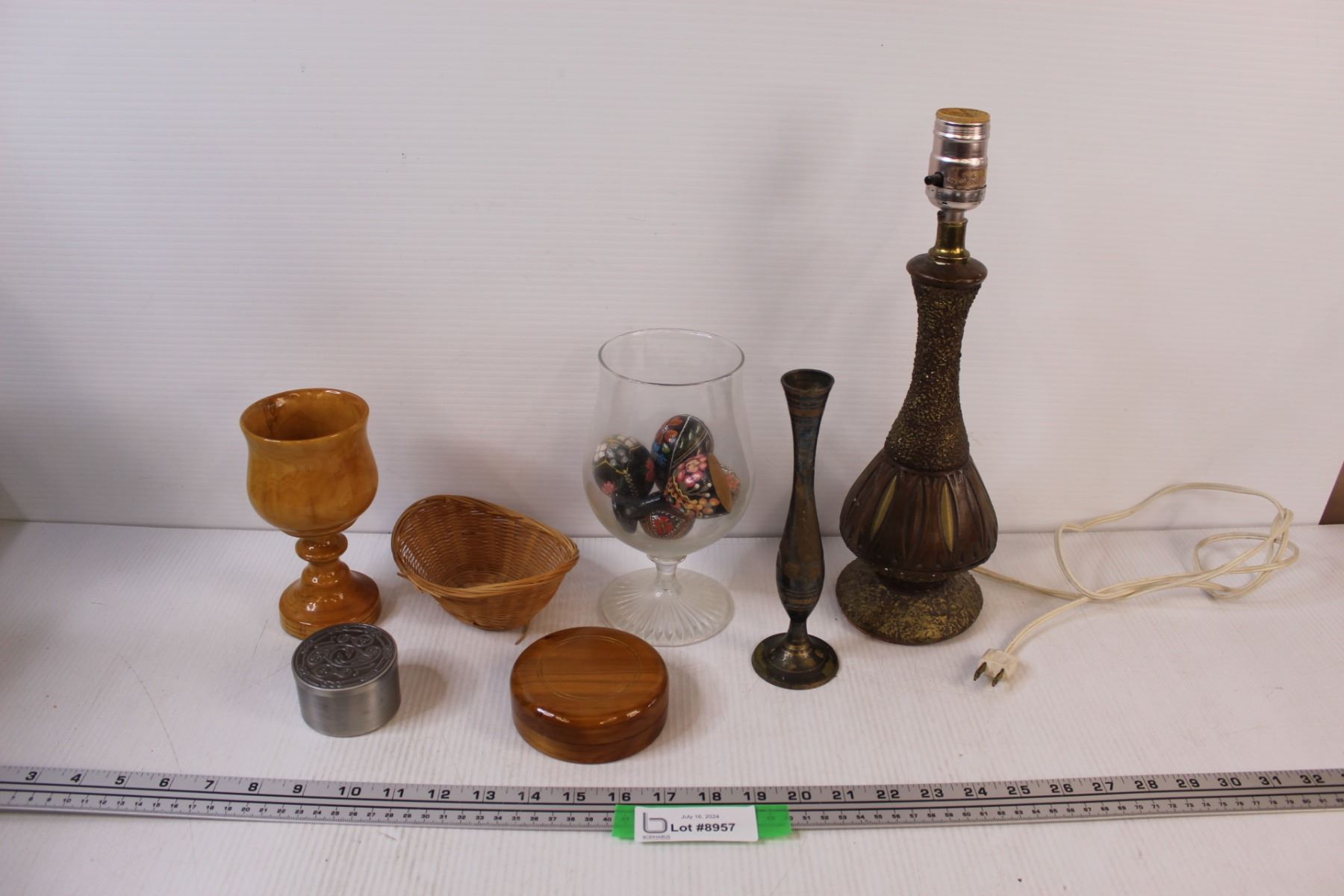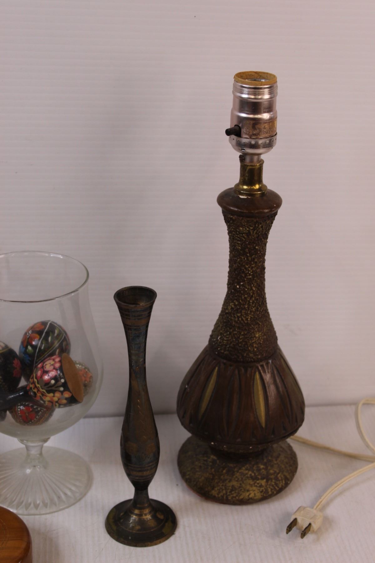Lot: Lamp (untested), Ukrainian Eggs in Bowl, Vases, Basket