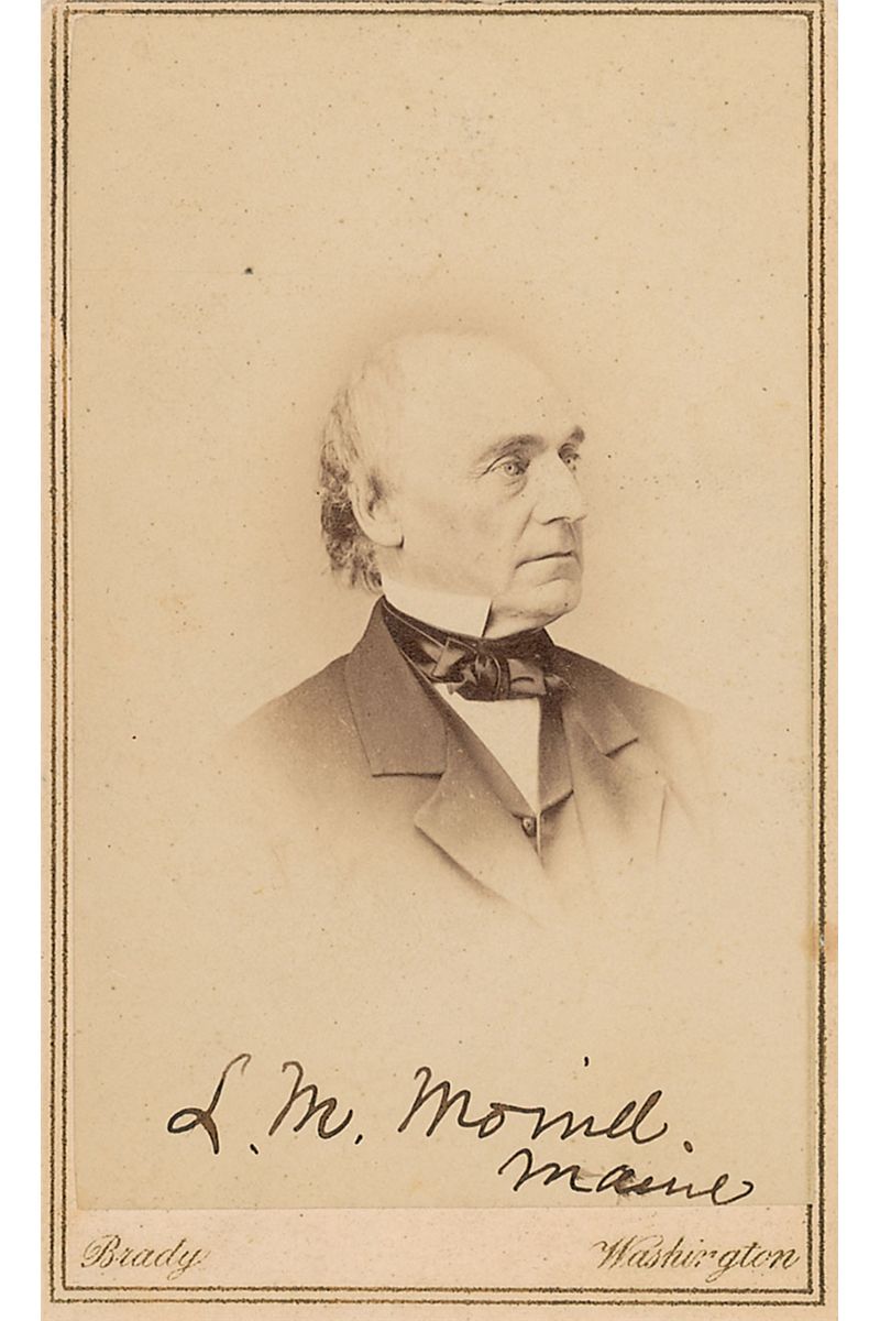 Governor and senator from Maine (1813–1883) who went on to serve in President U. S. Grant’s cabinet as secretary of the Treasury. Original 2.25 x 4 carte-de-visite portrait of Morrill, signed at the bottom of the image in black ink, “Lot M. Morrill, Maine.” Published by Brady of Washington. In fine condition, with insignificant edge wear.