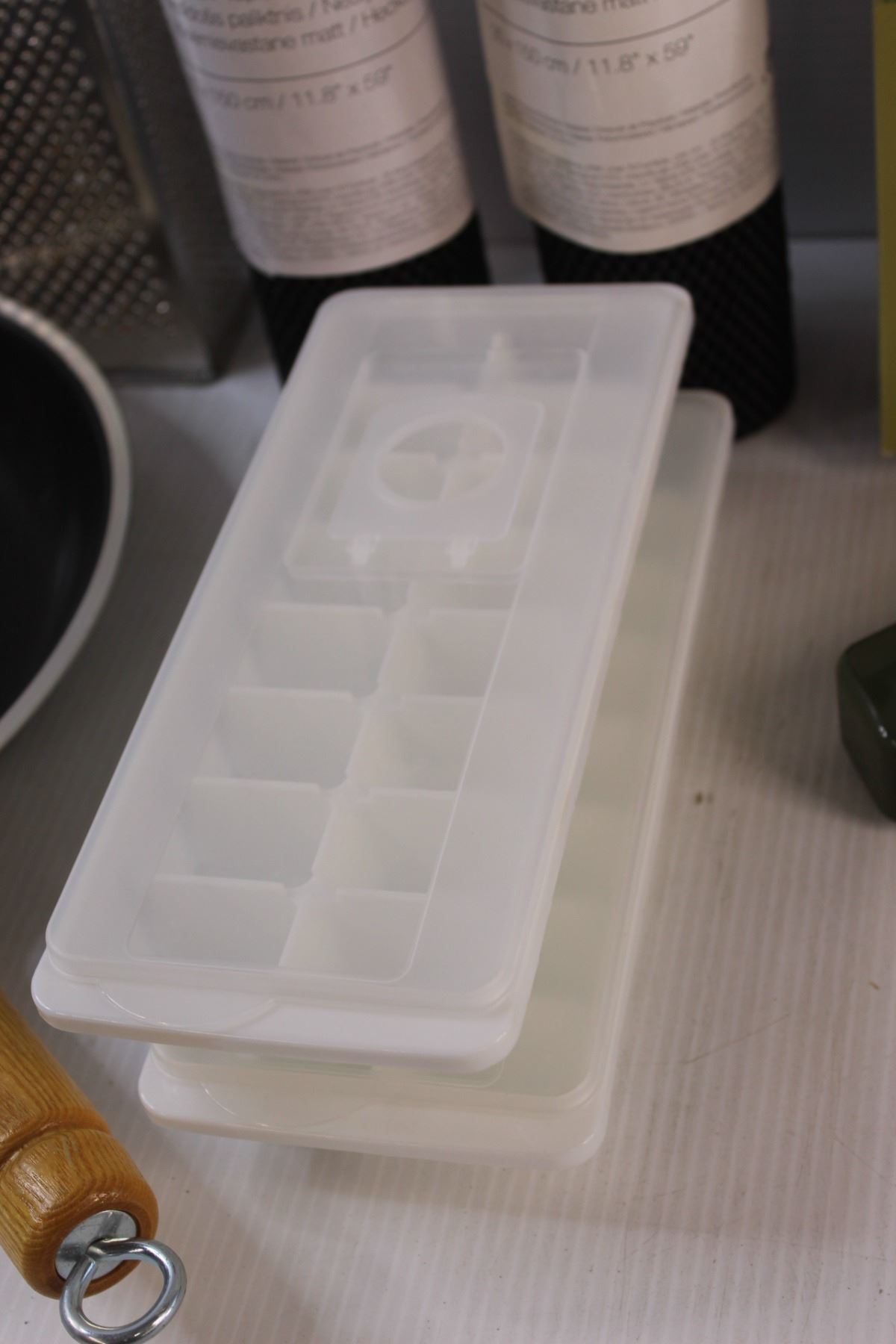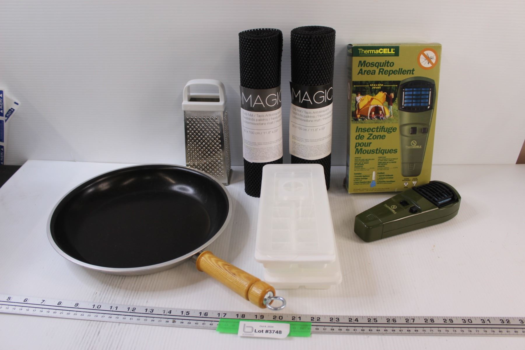 Lot: Mosquito Area Repellent, (2) Ice Cube Trays, Frying Pan, Cheese Grater, (2) Non-Slip Grip Pads