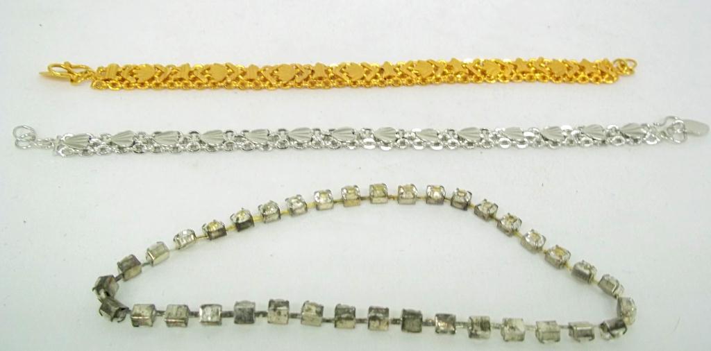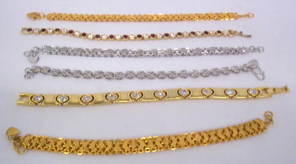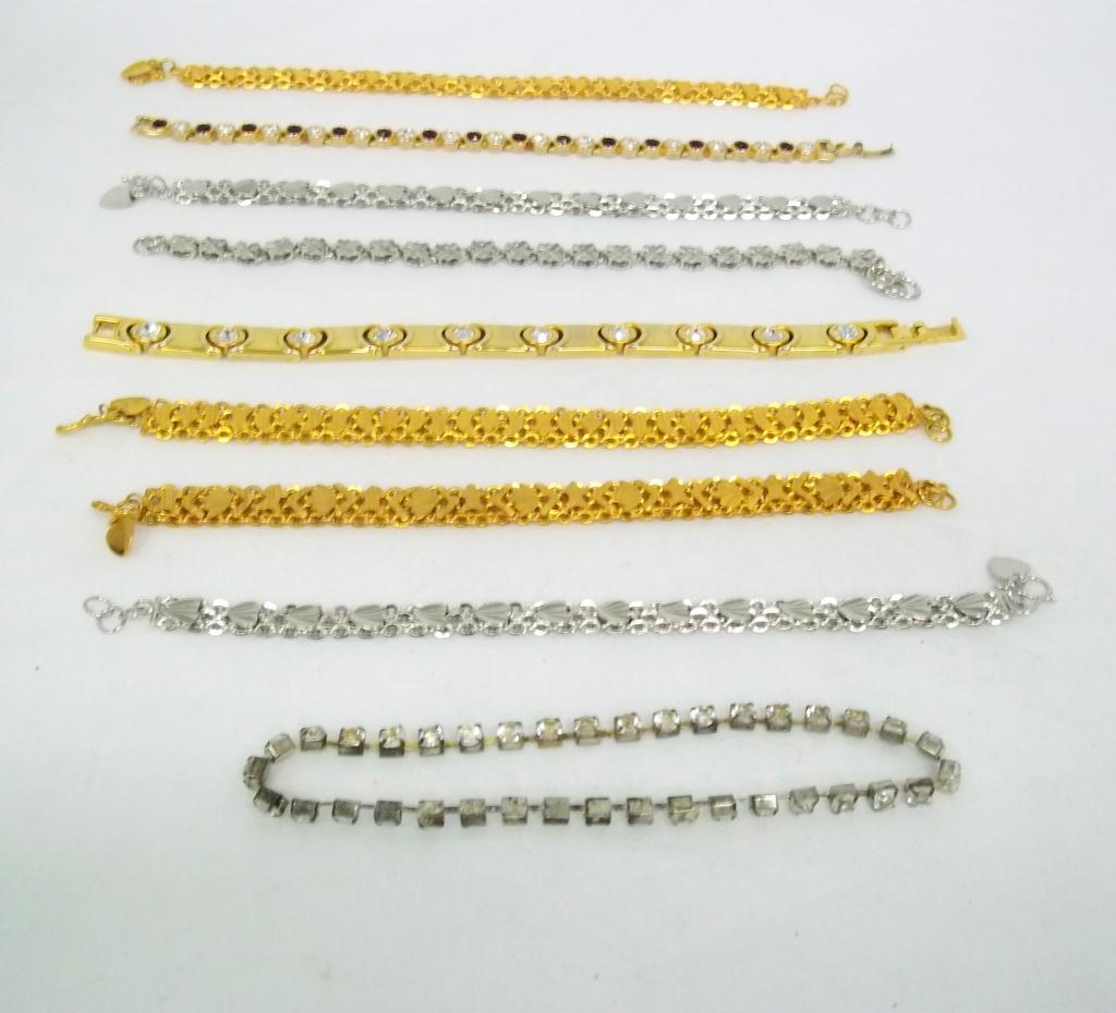 This lot contains three gold colored, three silver colored and three rhinestone embellished bracelets.