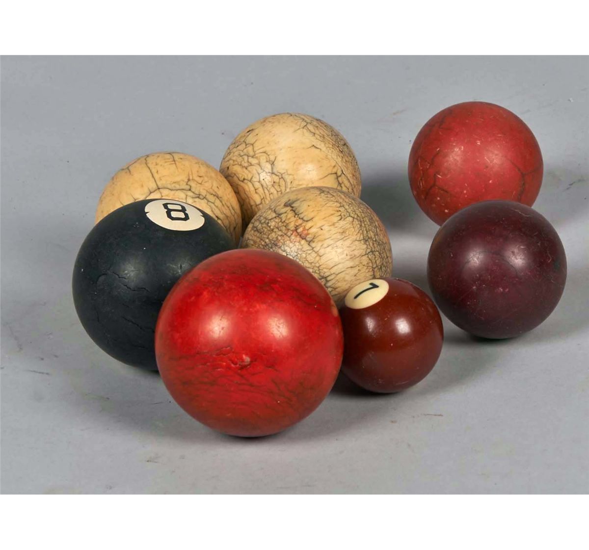 Various assorted sizes, colors & materials (1 eight ball, 1 miniature seven ball, etc.), Some are ivory, Includes a full set of carom billiards balls in excellent condition in box, Some others may be snooker balls, Intact w/ some cracking/wear Condition G