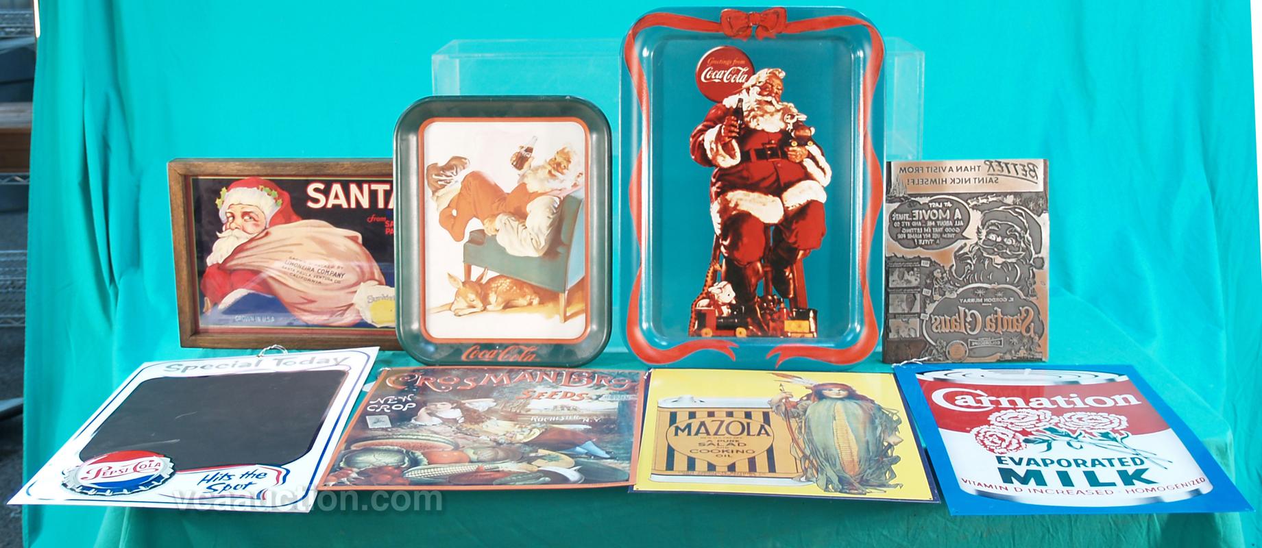 Lot Of 14 Various Advertisements: 2 Santa Claus Coca Cola Tin Trays - 13" x 10" & 18" x 13", Santa Claus Print Block - 8" x 10", Santa Brand From Santa Paula/Sunkist Advertisement Print Framed - 13" x 10", 3 Santa Claus Tin Signs & 7 Misc Advertisement Tin Signs.