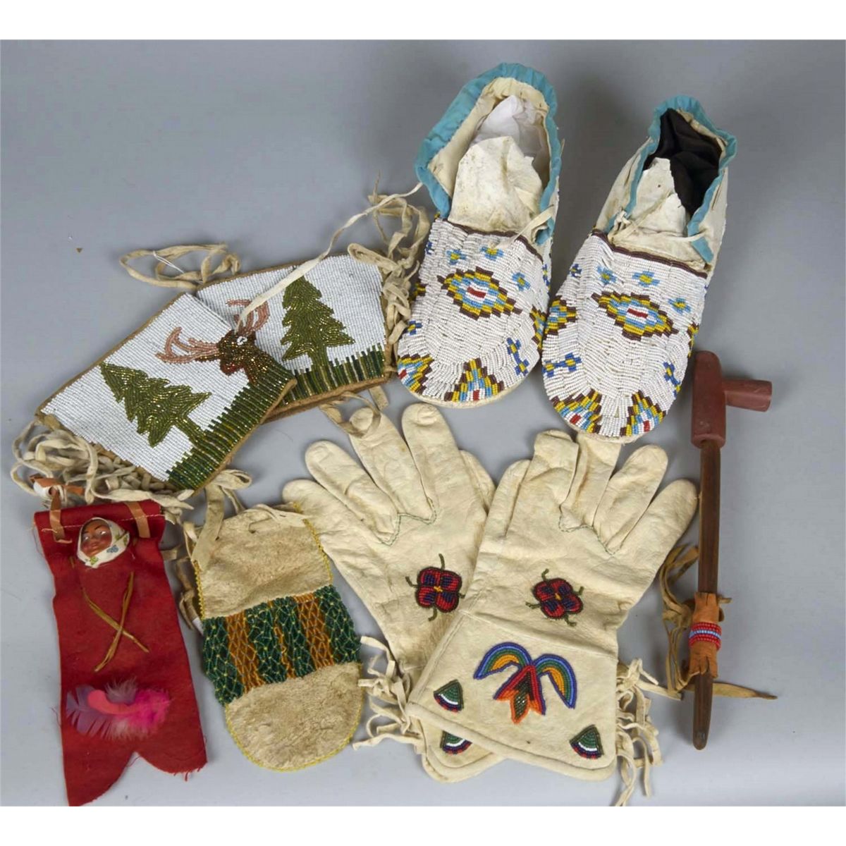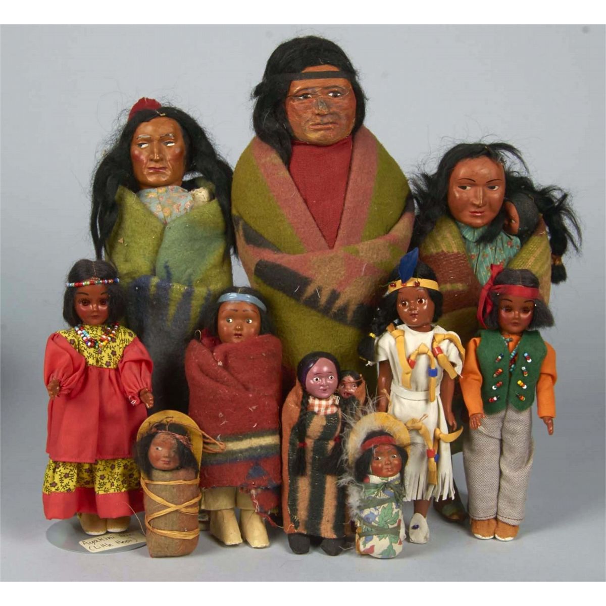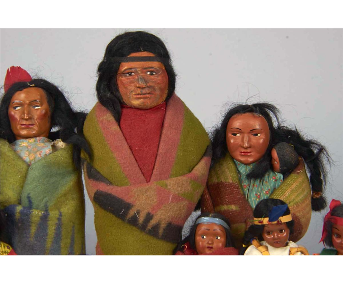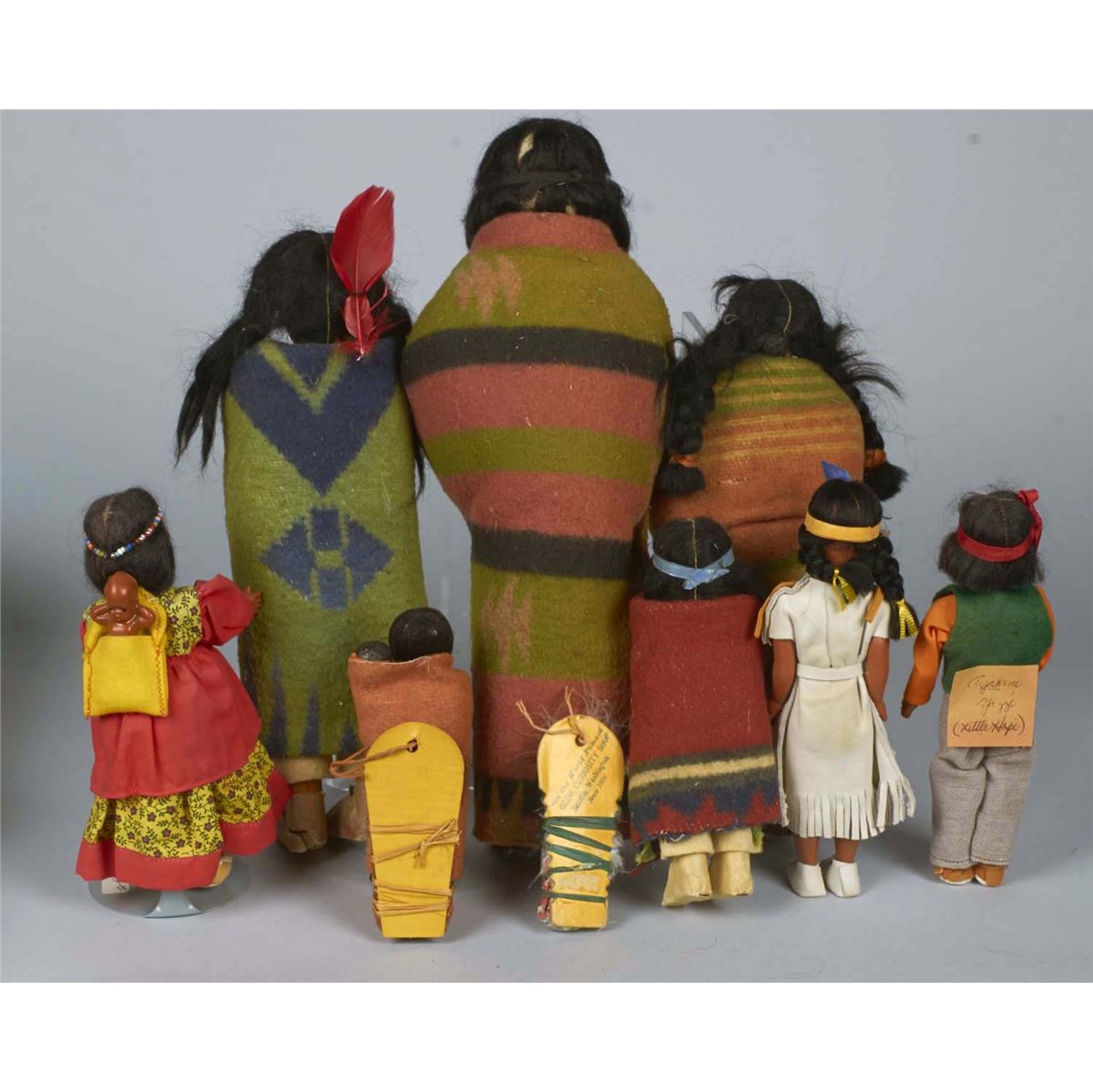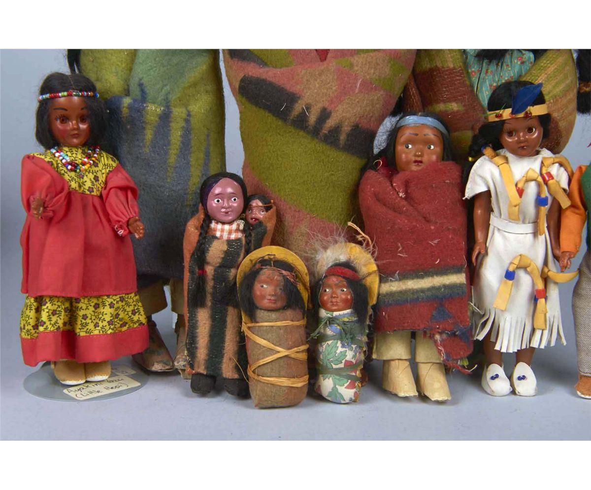 Including 2- Antique Male Indian dolls in blankets, 3- Antique Boy or Girl infants in various styles of Papooses, 3 - Mother and infants- two in blanket, the one in the dress is the newest c. 1960's and marked Ayakini Yazzi Little Hopi , 1 - Antique young