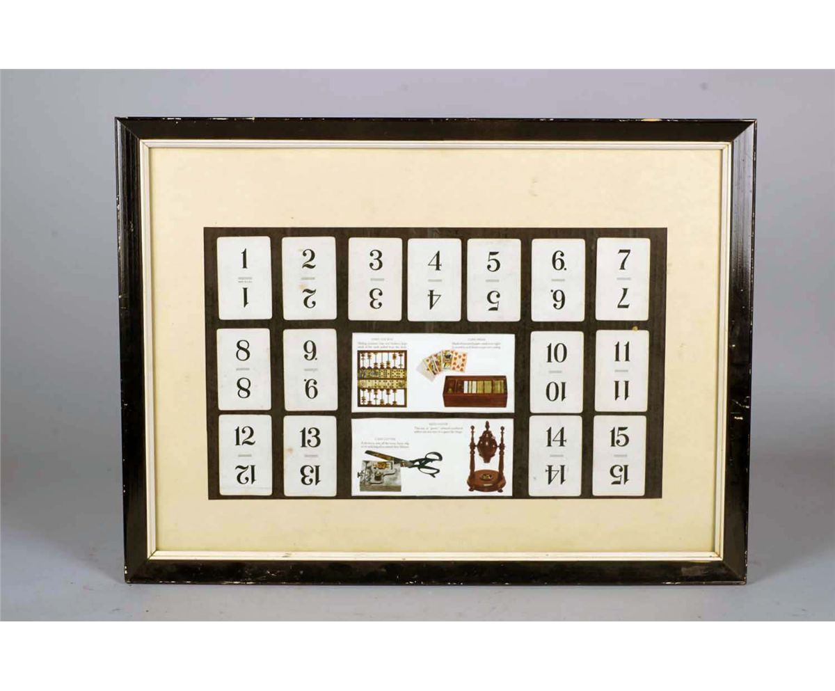 Including 15 Flinch cards, 1- printed informational sheet showing a Faro cue box and a card press, and 1- printed informational sheet showing a card cutter and a Keno Goose. All in a matted frame, Cards circa 1920's Informational sheets are contemporary.