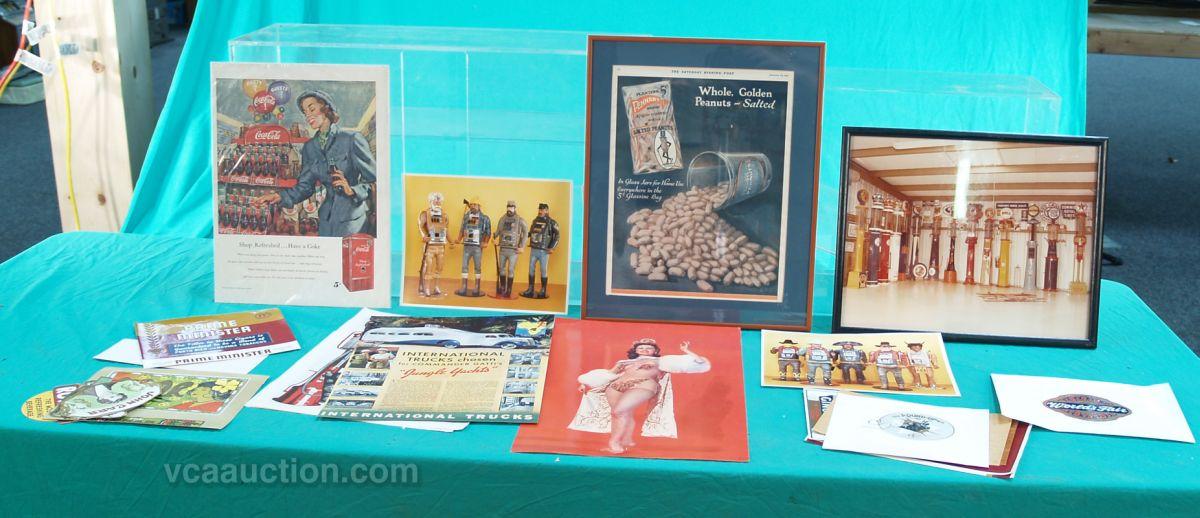 Lot Of 18 Items: Planters Peanut Ad (Sat. Eve. Post Jan. 1921) framed - 13" x 16", 3 unframed ads - early motor home, Coke, and Fry Visible gas pump 1925, 11 cigar box labels, 2 photos of Polk style slot machines, and photo of gas pump collection framed - 15" x 12".