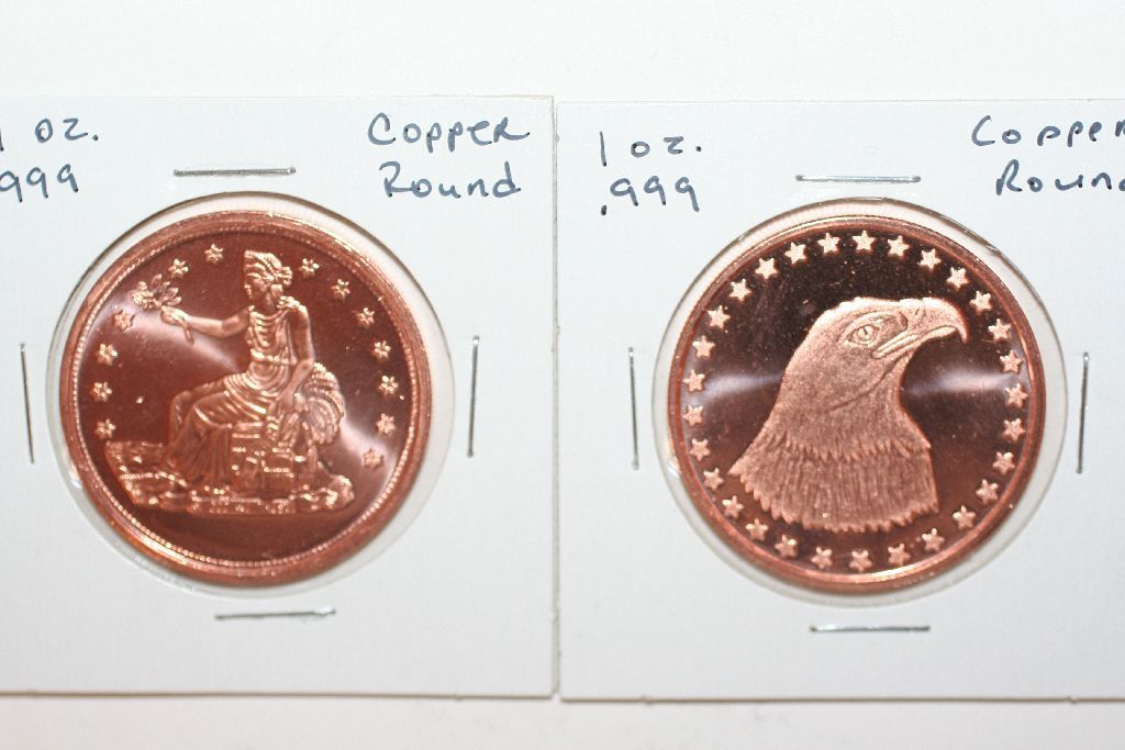 This lot is a set of (2) 1 oz. (.999) 2012 copper coins depicting bald eagle & trade dollar