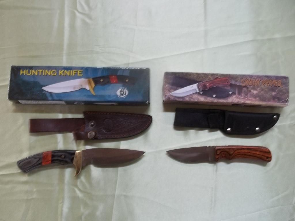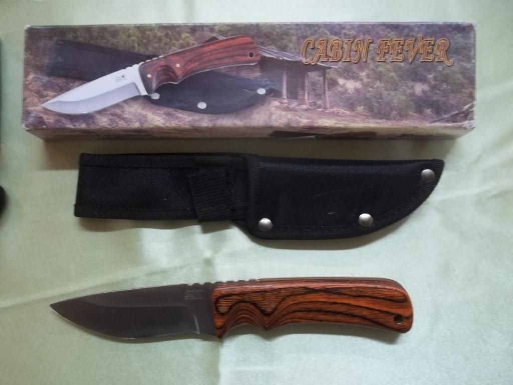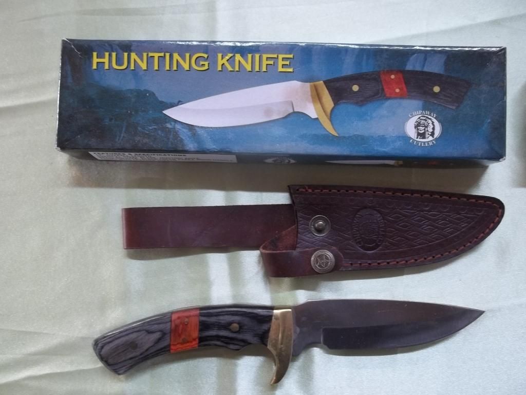 Chipaway & "Cabin Fever" 8 1/4" Overall Fixed Blade Hunter. This Knife Has Satin Stainless Steel Blade, Red/Black Pakkawood Handle & Metal Brad Sheath. Hunting Knife By Chipaway Has Brass Bolster, Black Color Pakkawood Handle & Leather Sheath