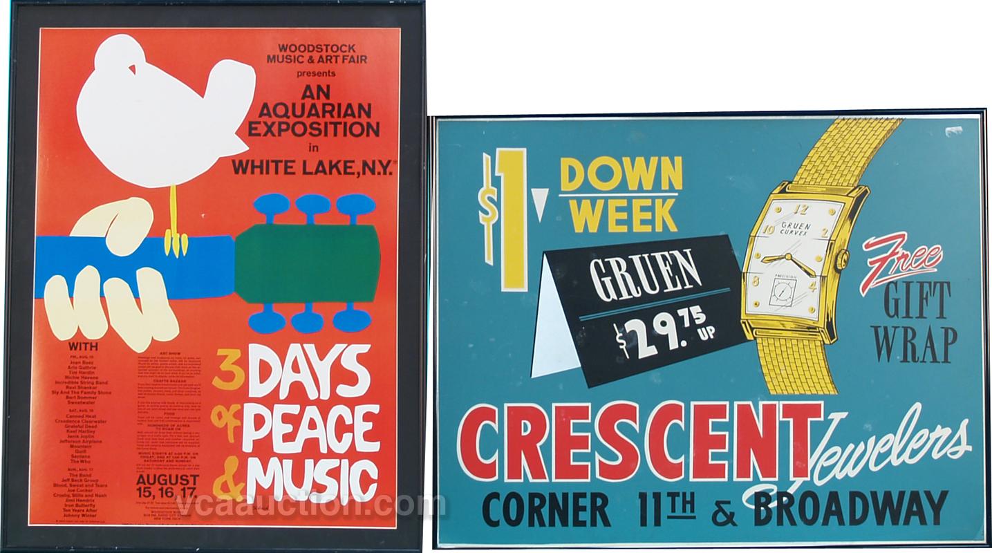 Lot Of 2 Advertisement Posters In Frames: 1 - Woodstock Concert - 20" x 27" & 1 - Gruen Watch - Cresent Jewelers - 27" x 21"
