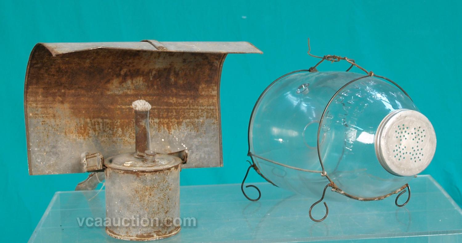 Lot Of 2 Antique Items: 1 - glass jar for catching minnows used for fishing bait & 1 - tin frog catcher/fogger