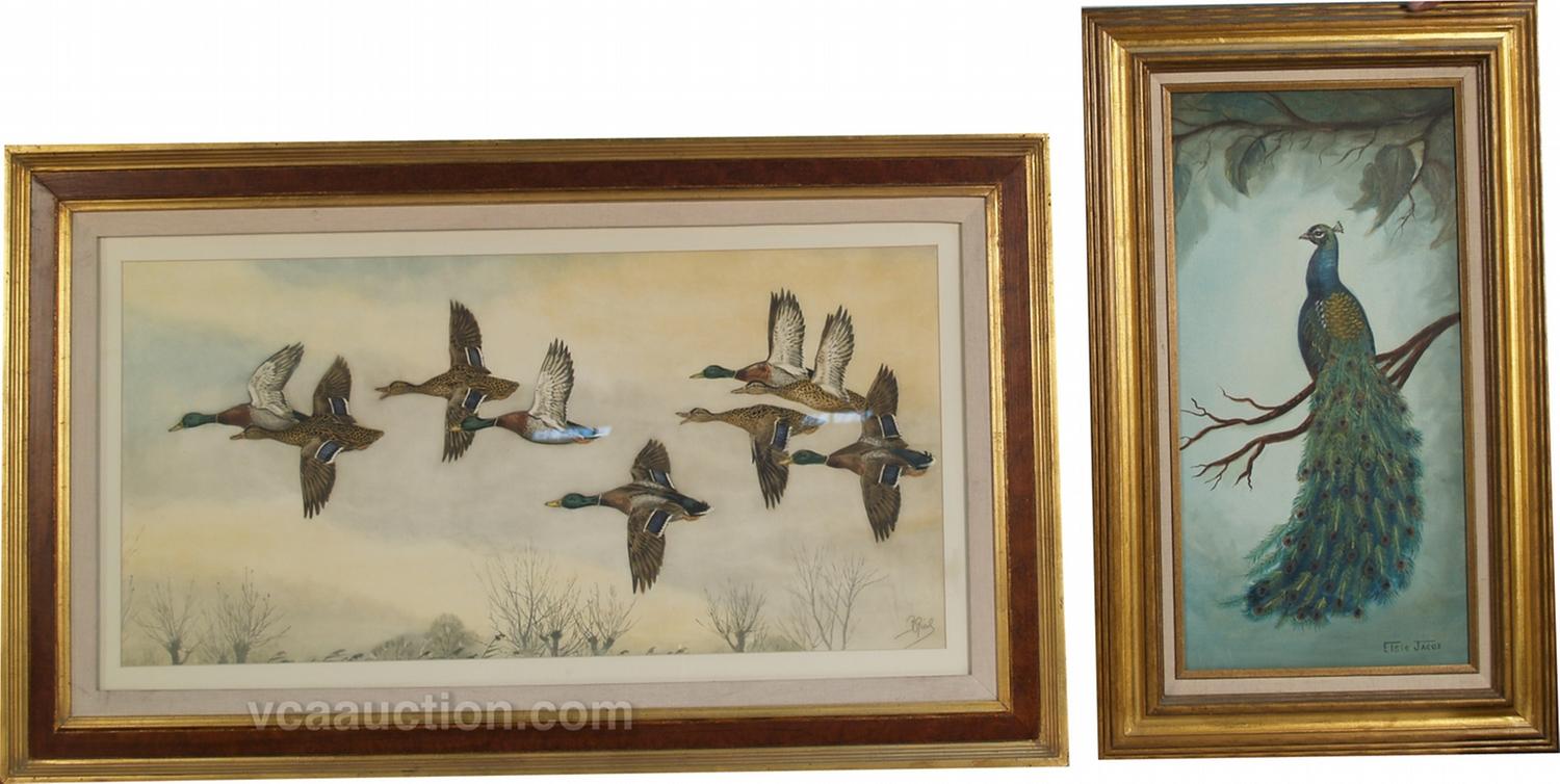 Lot Of 2 Bird Prints In Frames: 1 - oil painting of Peacock - 19" x 31" & 1 - print of ducks in flight - 43" x 26"